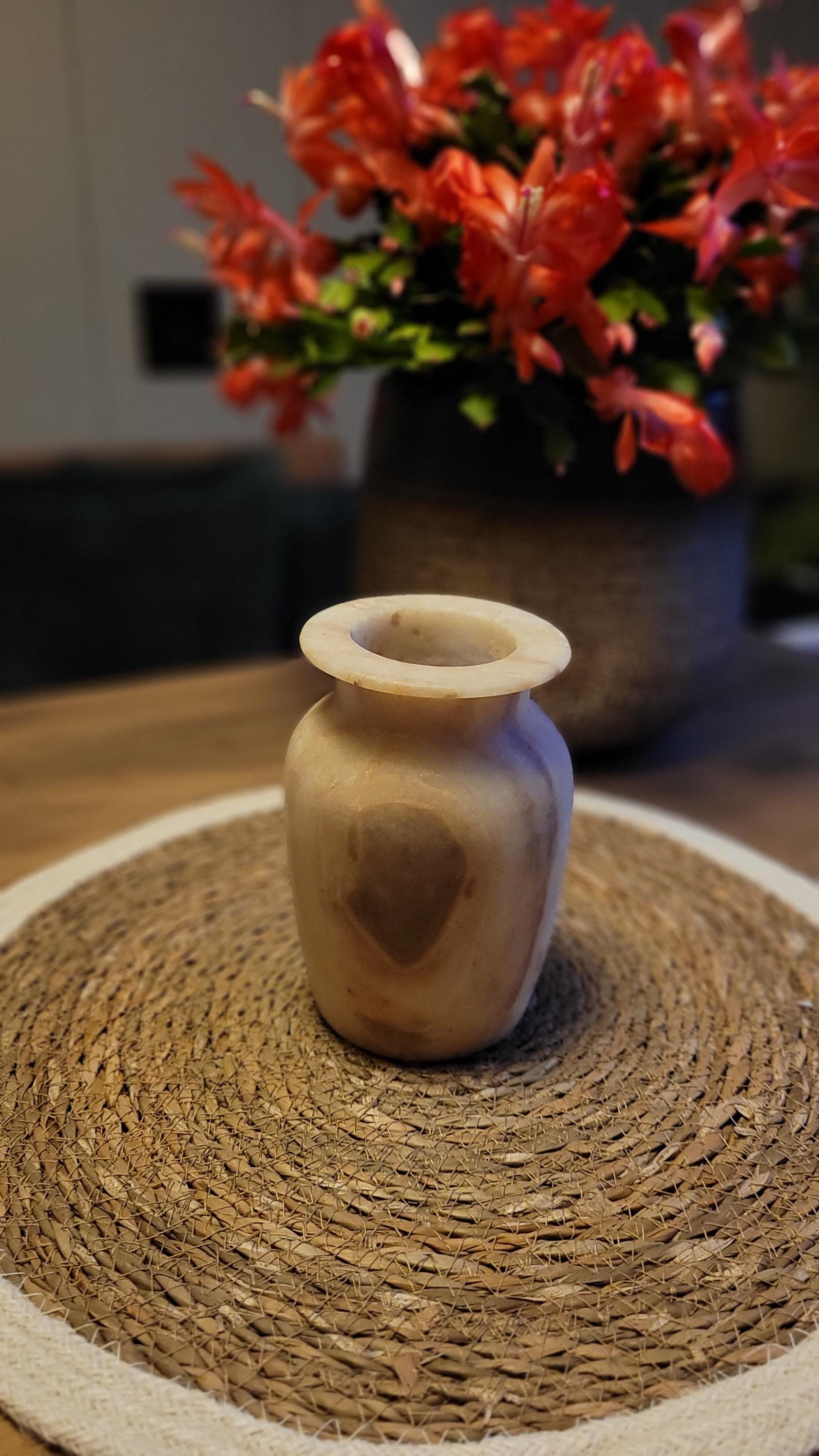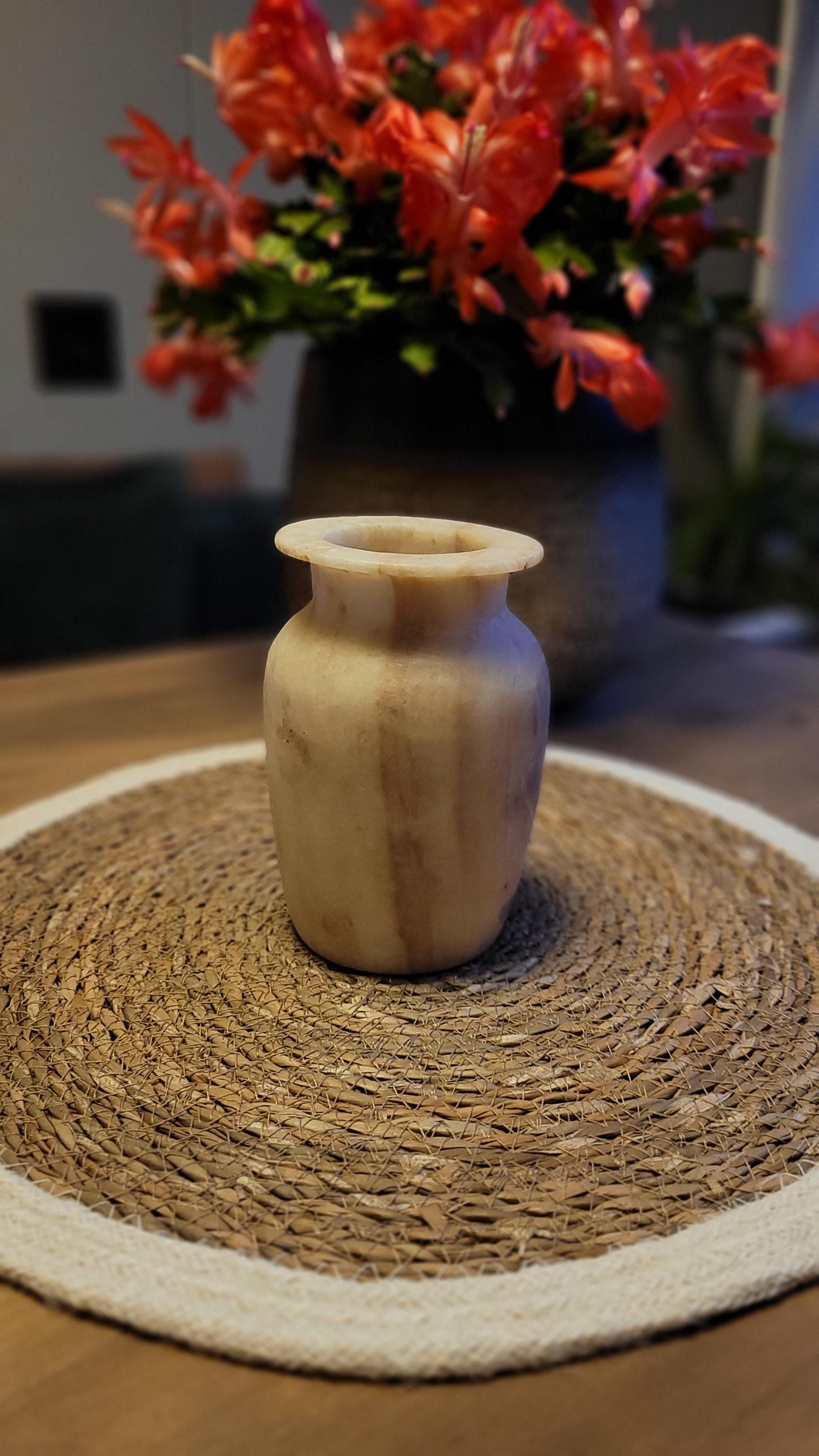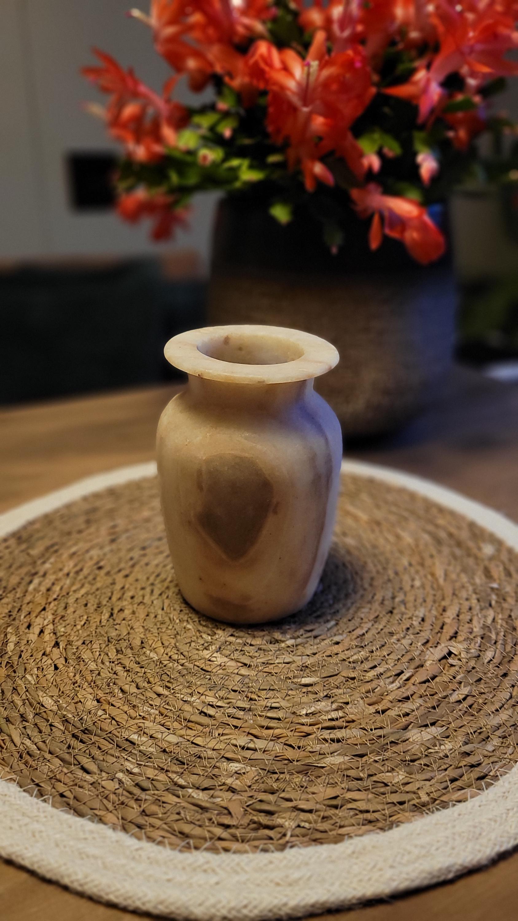 Ervaar de natuurlijke schoonheid van deze handgemaakte vaas van alabaster. Met zijn unieke, warme tinten en organische patronen straalt deze vaas tijdloze elegantie uit. Perfect als decoratiestuk of om bloemen op verfijnde wijze te presenteren. Elk stuk is met zorg vervaardigd en brengt de pracht van natuursteen naar jouw interieur.Dit prachtige decorstuk wordt geleverd in een unieke geschenkverpakking, perfect om cadeau te geven! 🎁