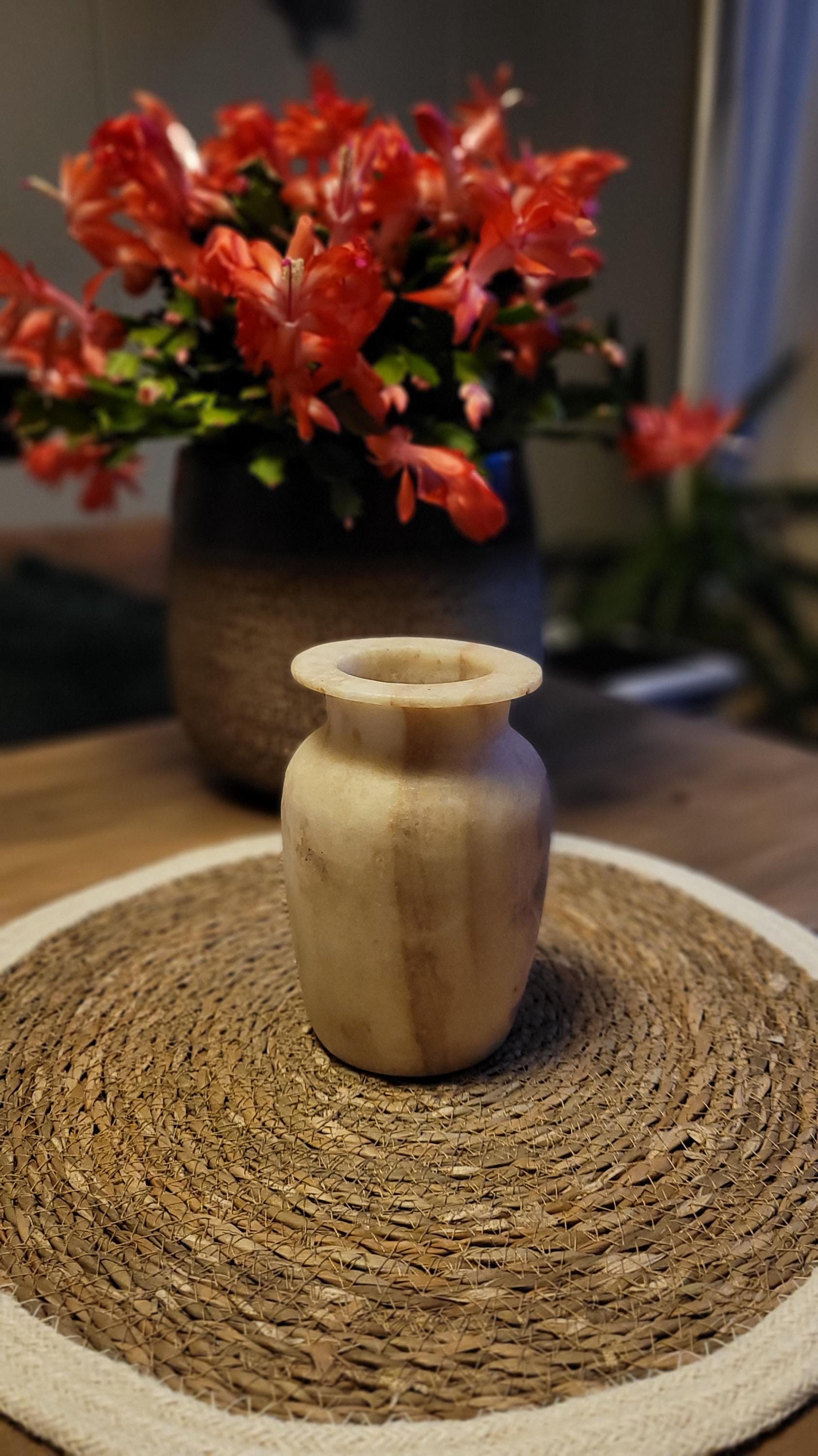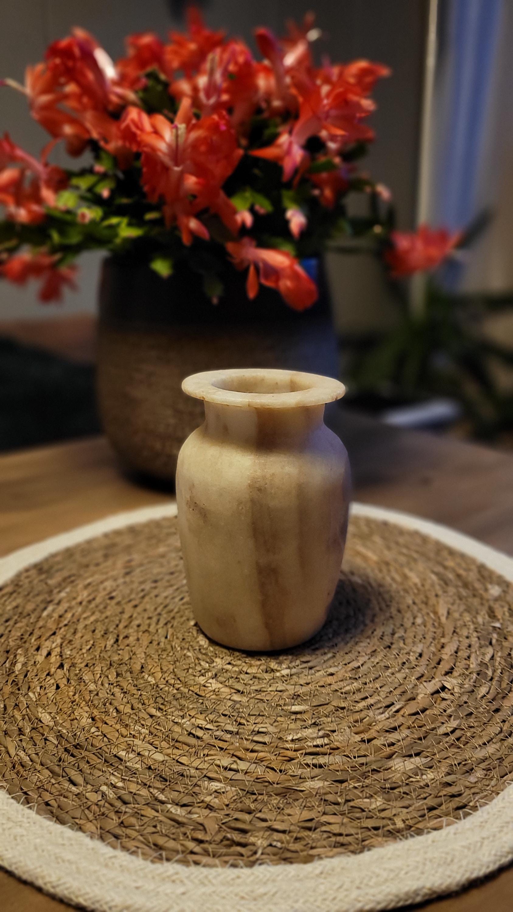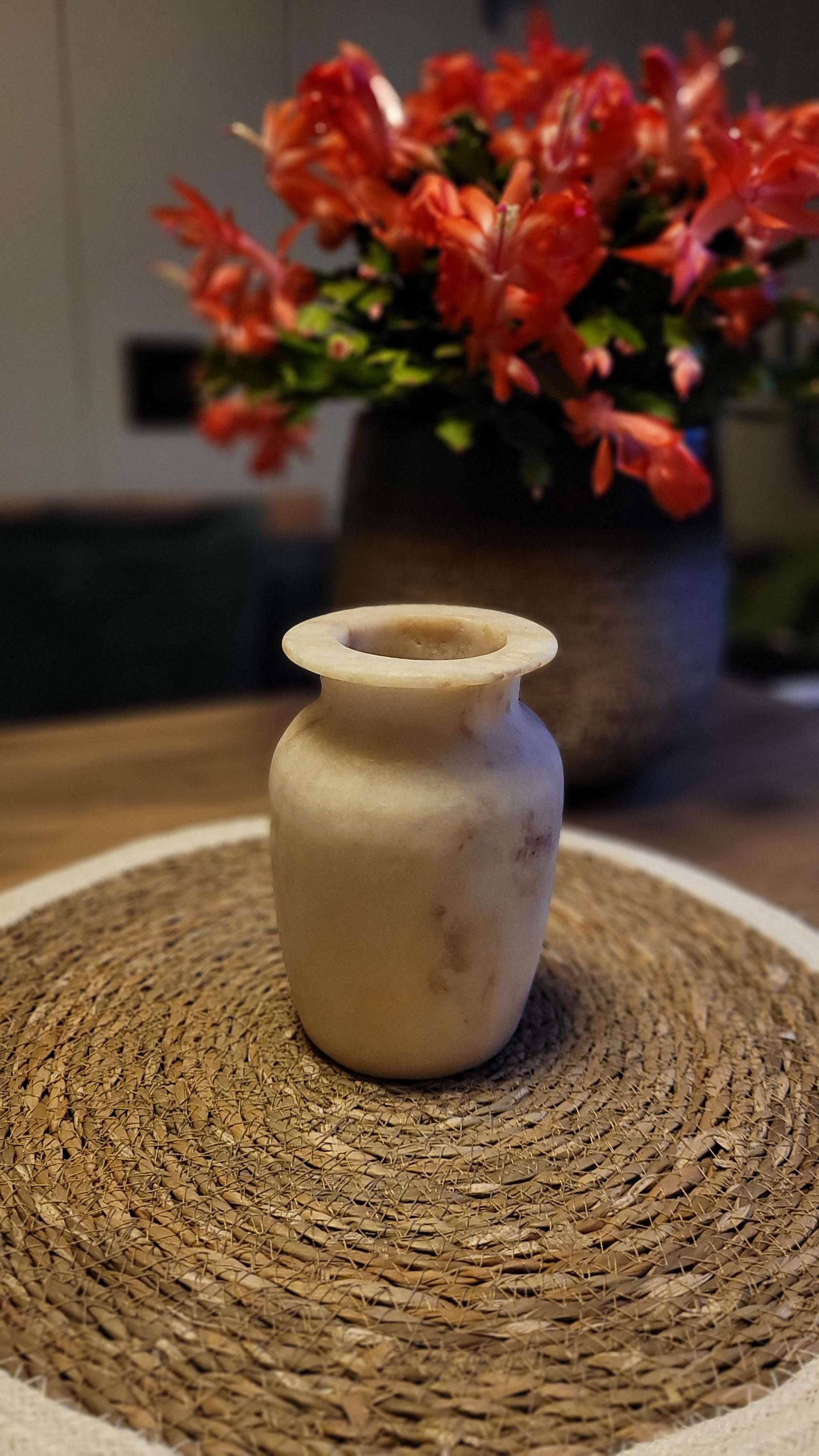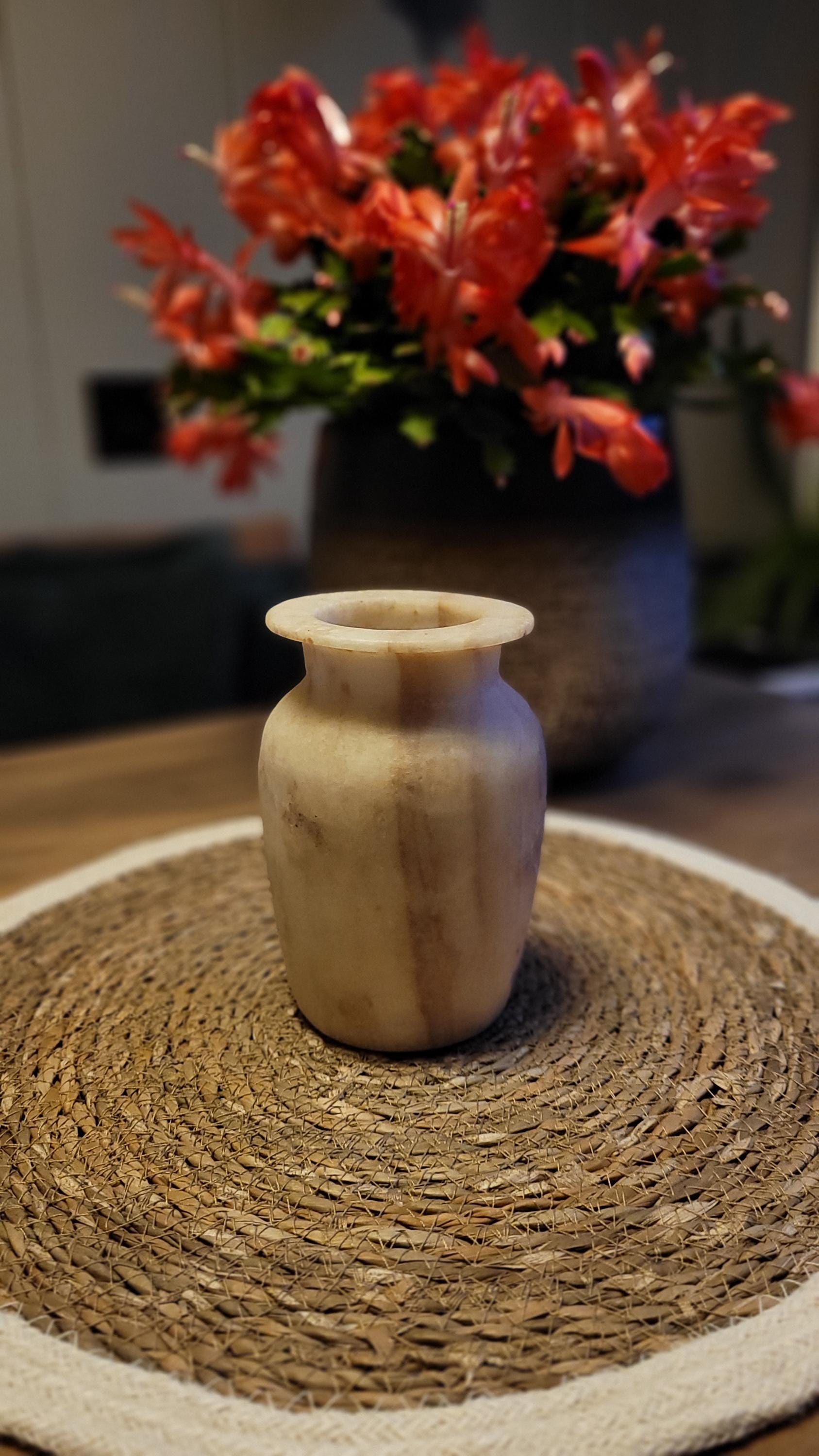 Ervaar de natuurlijke schoonheid van deze handgemaakte vaas van alabaster. Met zijn unieke, warme tinten en organische patronen straalt deze vaas tijdloze elegantie uit. Perfect als decoratiestuk of om bloemen op verfijnde wijze te presenteren. Elk stuk is met zorg vervaardigd en brengt de pracht van natuursteen naar jouw interieur.Dit prachtige decorstuk wordt geleverd in een unieke geschenkverpakking, perfect om cadeau te geven! 🎁