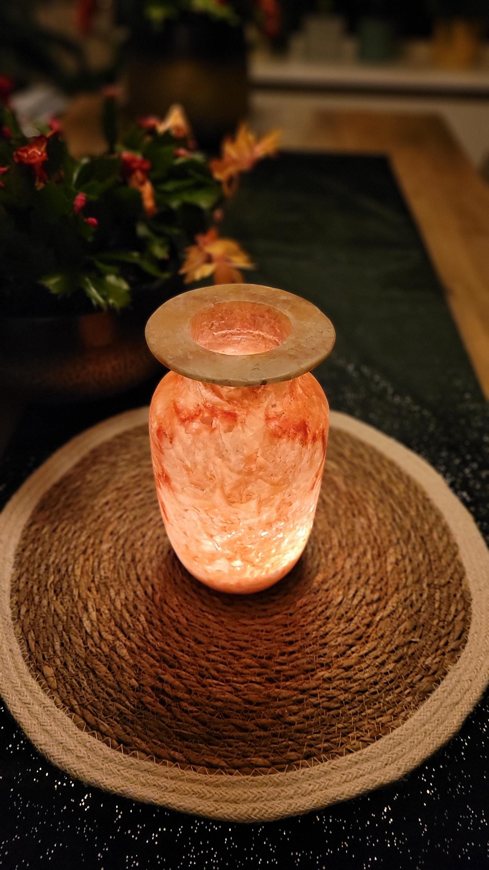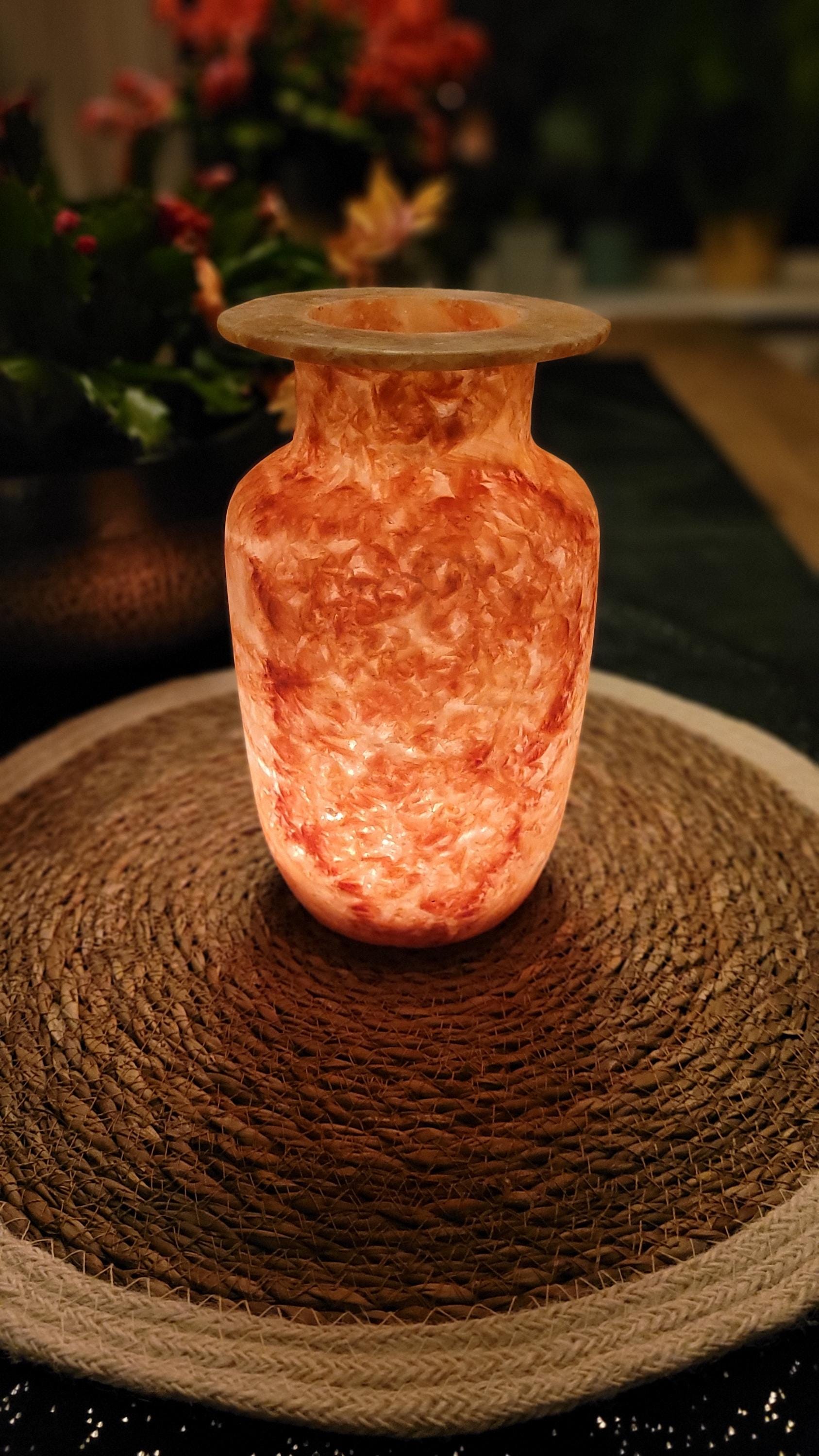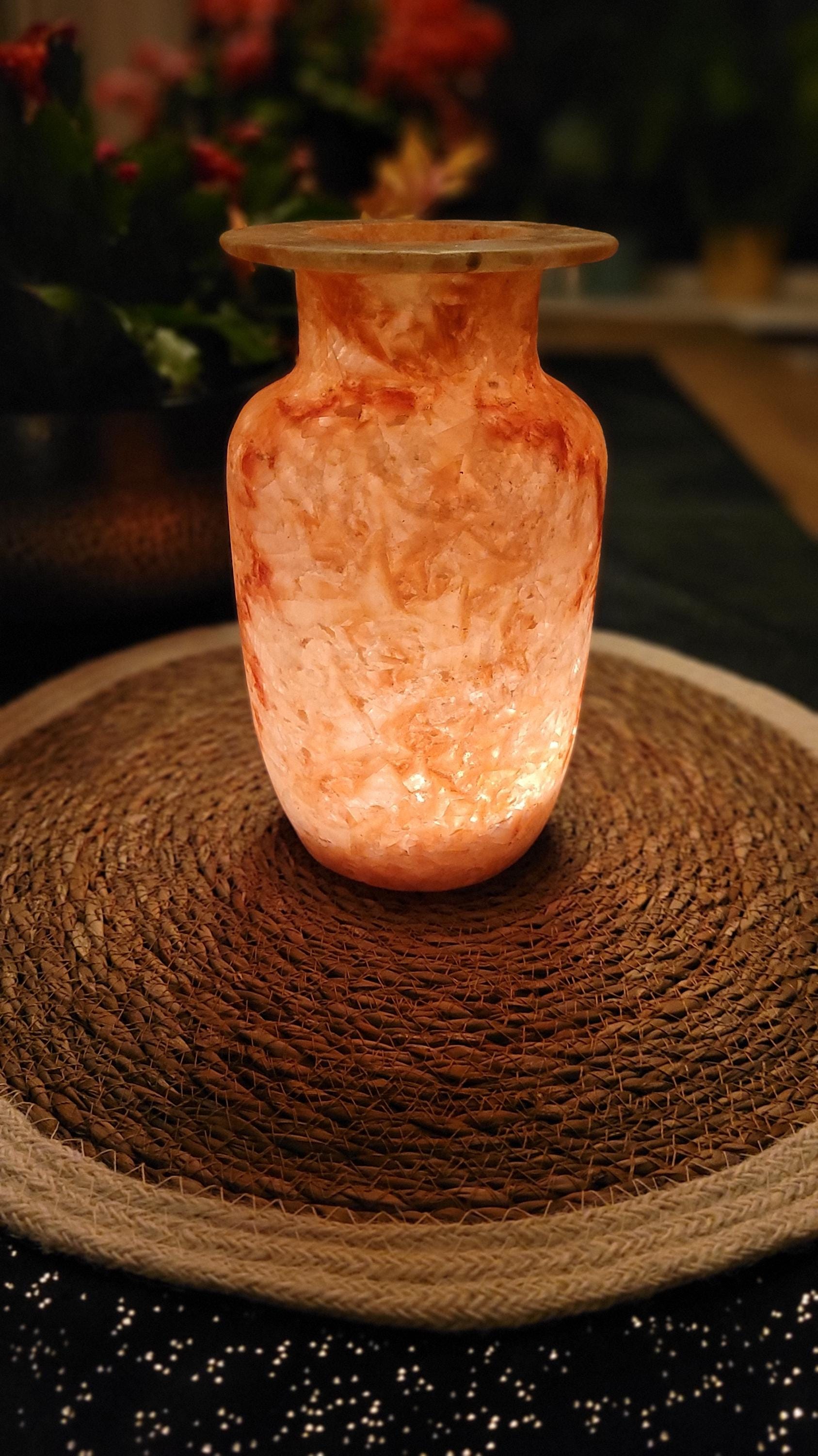 Deze prachtige handgemaakte vaas van 19 cm hoog, gemaakt van authentiek alabaster, straalt een warme en levendige gloed uit wanneer hij verlicht is. De natuurlijke kleurschakeringen en unieke patronen maken elke vaas een waar kunstwerk. Perfect als decoratiestuk dat een vleugje warmte en elegantie toevoegt aan uw interieur. Dit prachtige decorstuk wordt geleverd in een unieke geschenkverpakking, perfect om cadeau te geven! 🎁