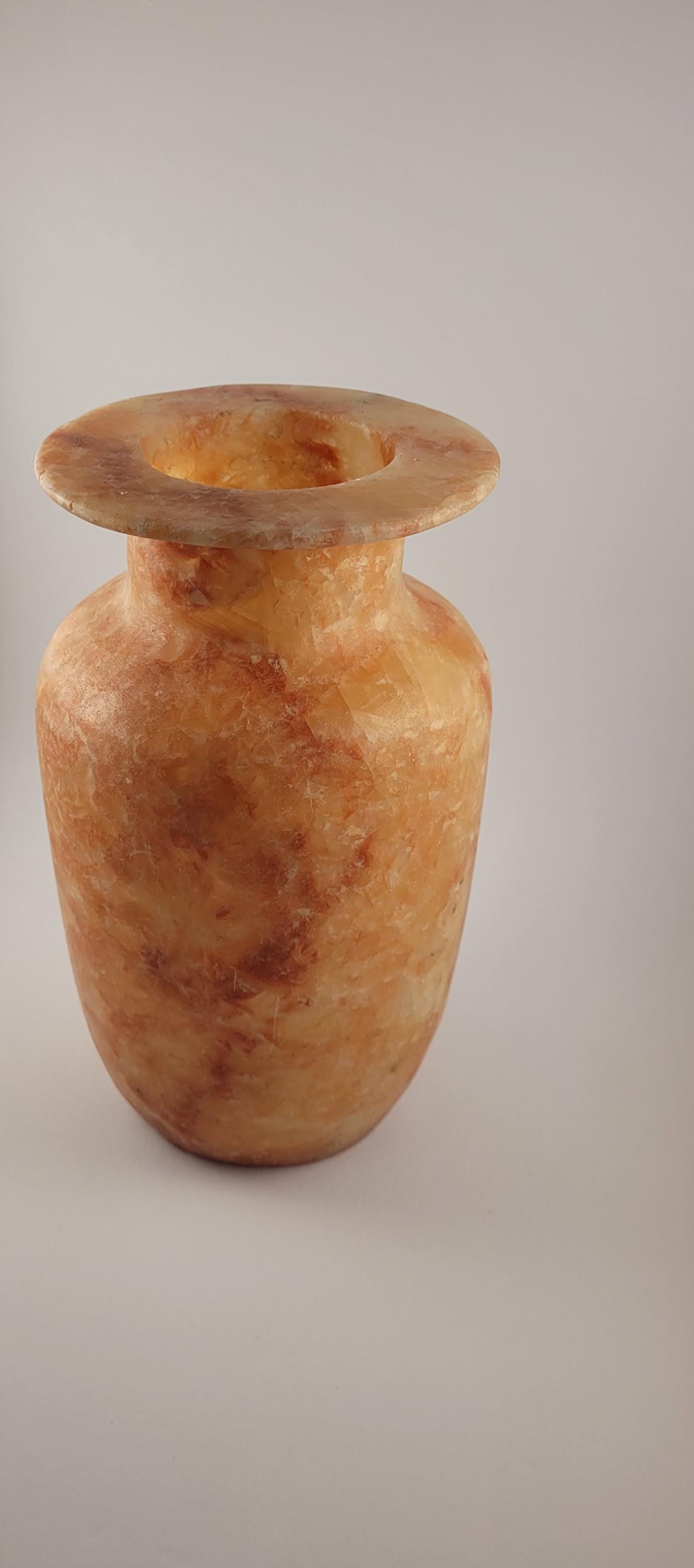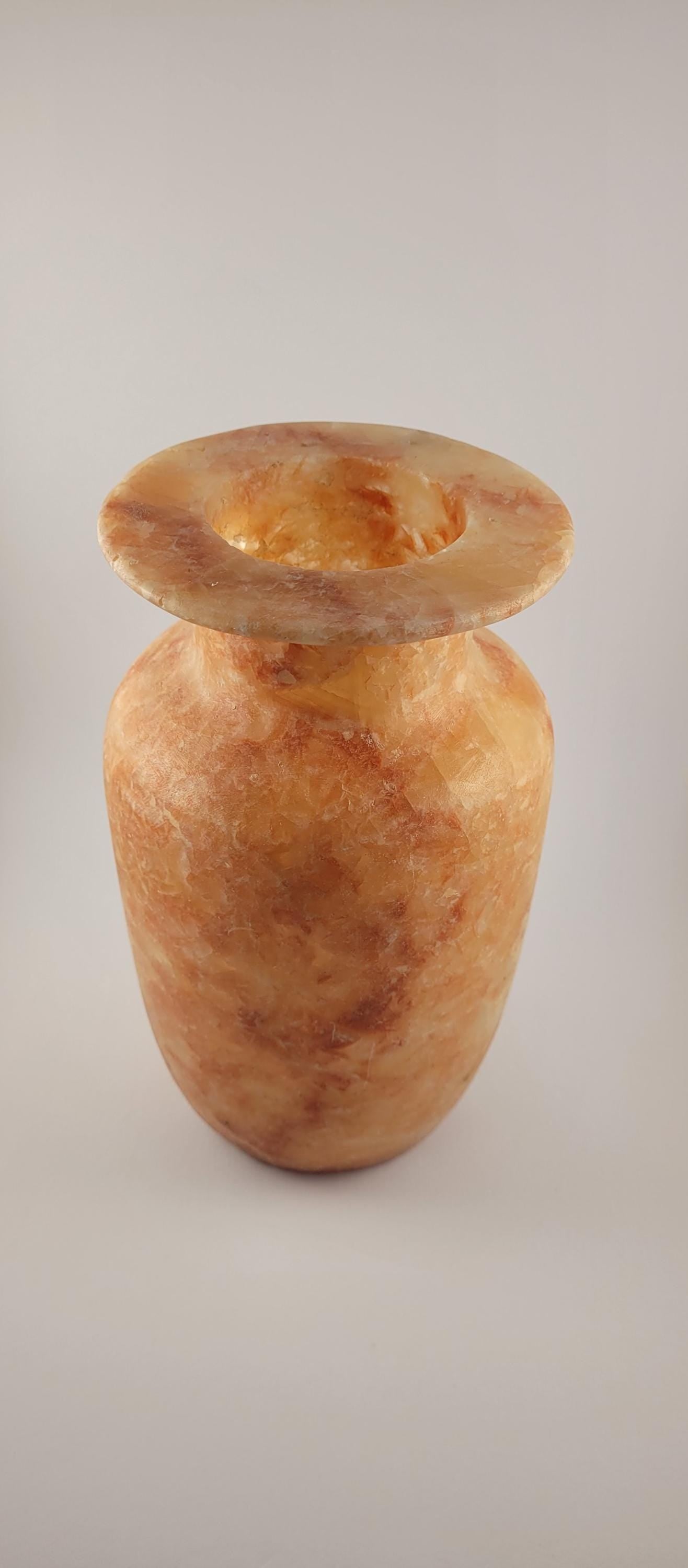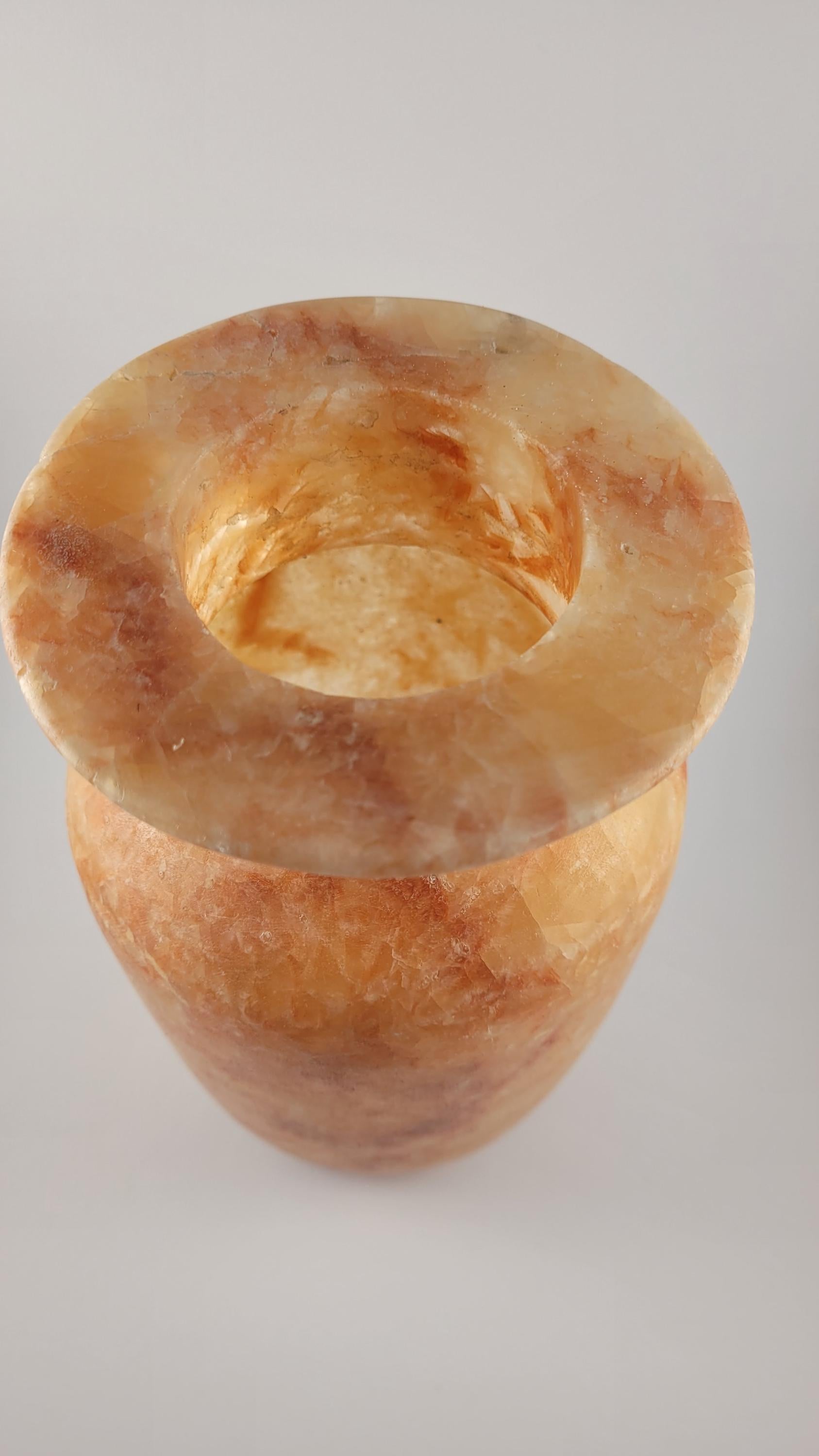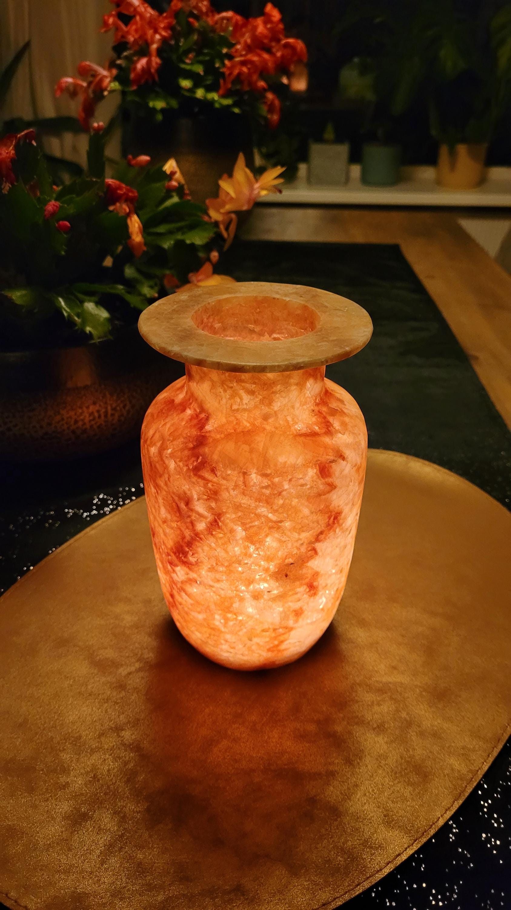 Deze prachtige handgemaakte vaas van 19 cm hoog, gemaakt van authentiek alabaster, straalt een warme en levendige gloed uit wanneer hij verlicht is. De natuurlijke kleurschakeringen en unieke patronen maken elke vaas een waar kunstwerk. Perfect als decoratiestuk dat een vleugje warmte en elegantie toevoegt aan uw interieur. Dit prachtige decorstuk wordt geleverd in een unieke geschenkverpakking, perfect om cadeau te geven! 🎁