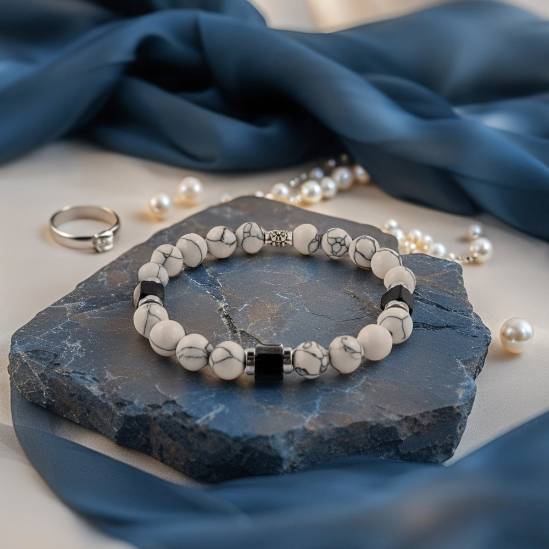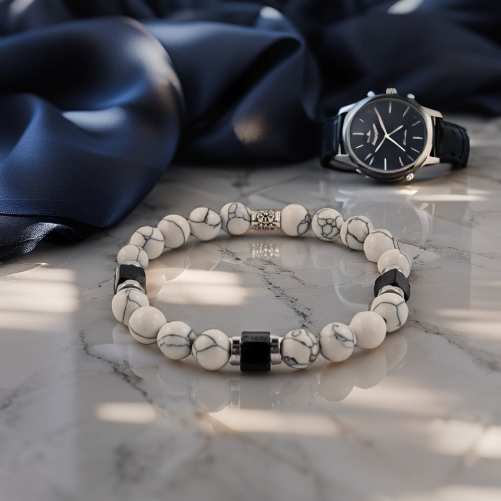 De Bianco Eleganza armband straalt tijdloze klasse uit dankzij de subtiele schoonheid van witte howliet, verrijkt met elegante grijze aders. De moderne zwarte onyx accenten in kubusvorm zorgen voor een krachtig contrast en geven het ontwerp een luxe uitstraling. Deze armband is de perfecte keuze voor wie stijl en zelfvertrouwen wil combineren in één accessoire.