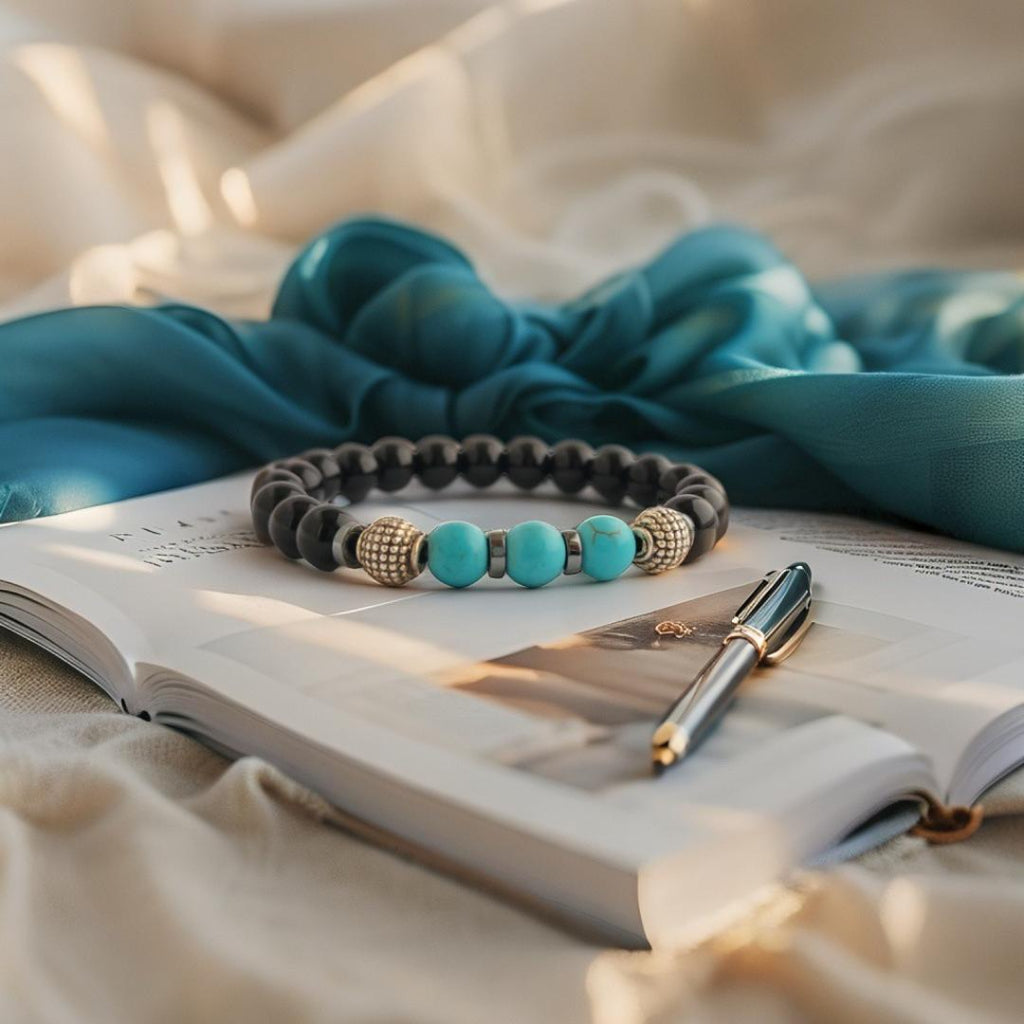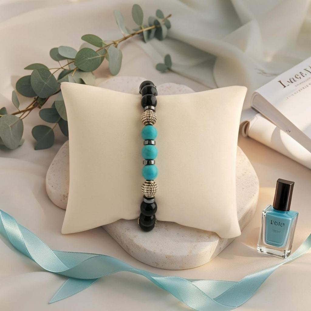 De Blue Noir armband combineert 8mm gepolijste zwarte Onyx met levendige turkooiskleurige stenen, verfijnd afgewerkt met donkere hematiet spacers en luxe metalen details.