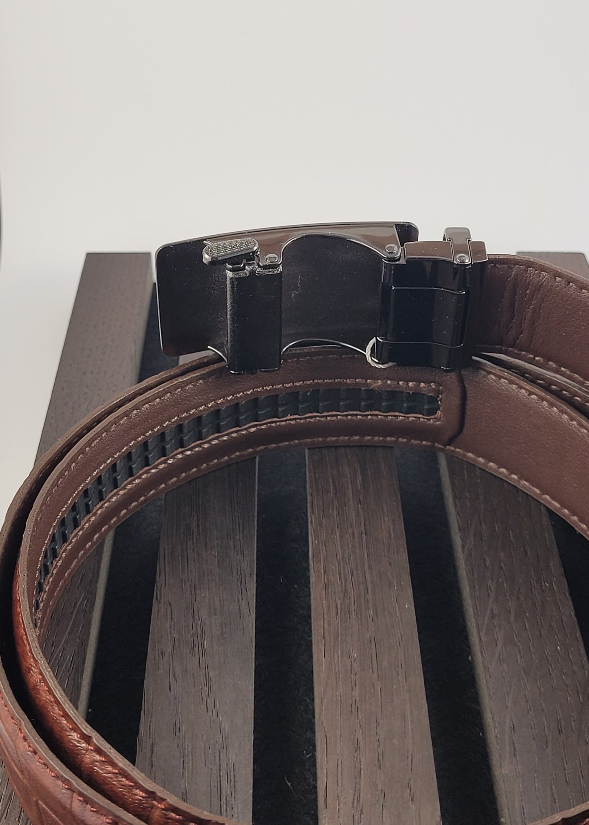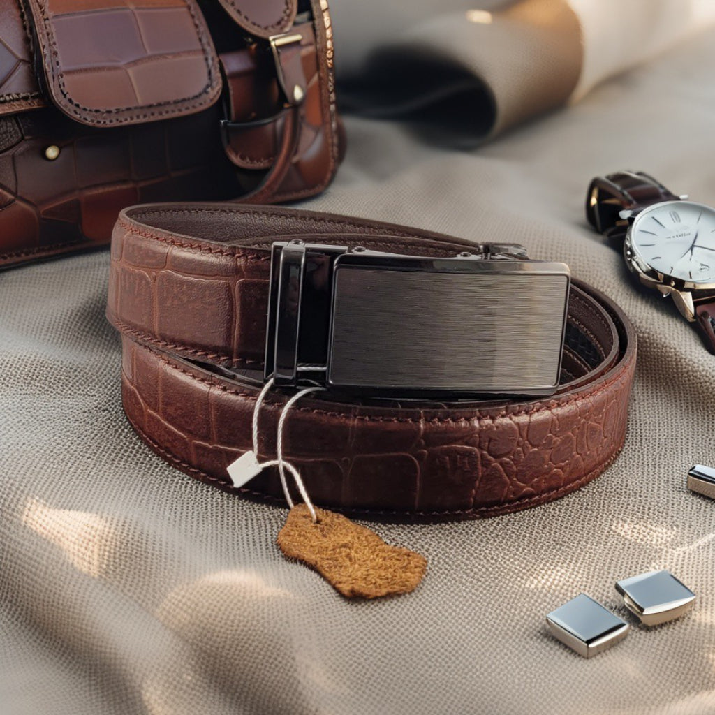 Deze stijlvolle cognackleurige riem is gemaakt van echt leder met een luxe krokodillenprint en afgewerkt met een automatische metalen gesp. Het robuuste karakter en de verfijnde structuur maken dit accessoire tot een echte blikvanger voor de moderne man.