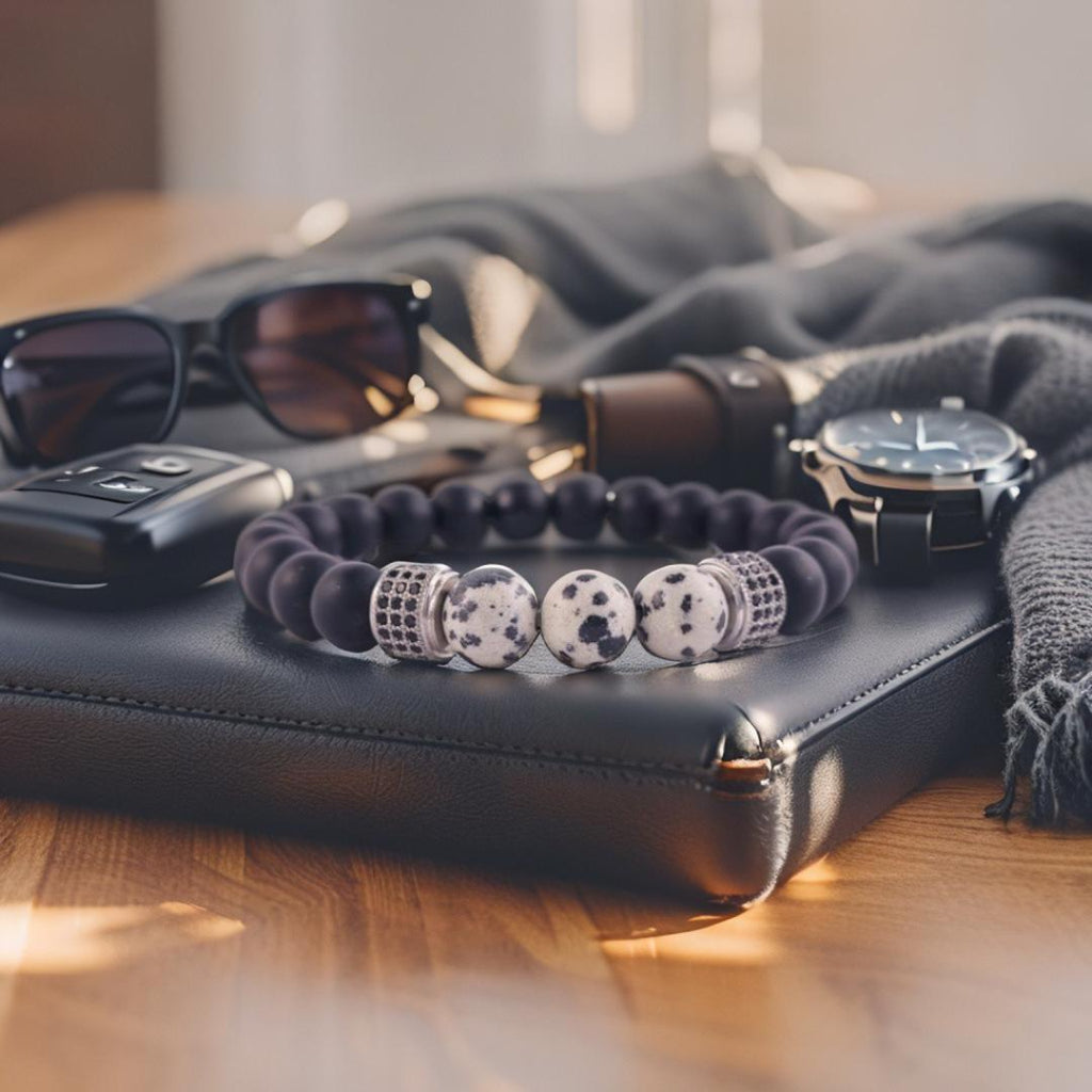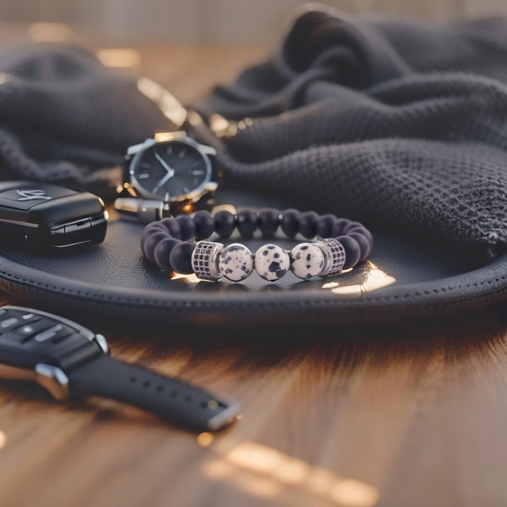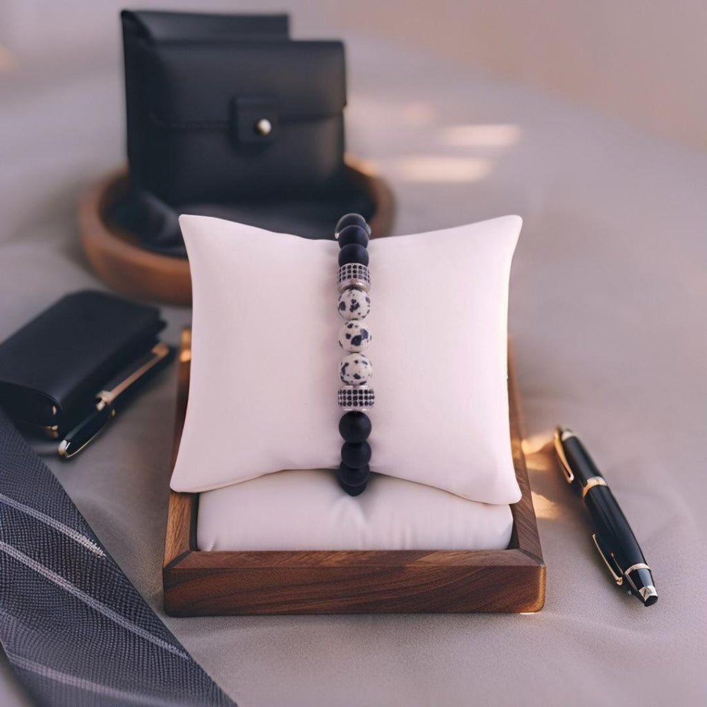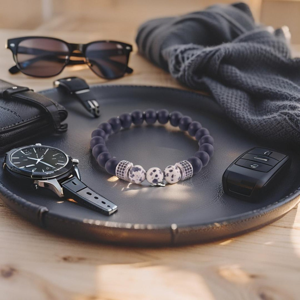 Deze mysterieuze armband combineert witte 8mm edelstenen met gemarmerde tinten van zwart, paars en grijs. De centrale kralen creëren een krachtige, moderne look vol karakter. Perfect voor wie op zoek is naar balans tussen elegantie en expressie.