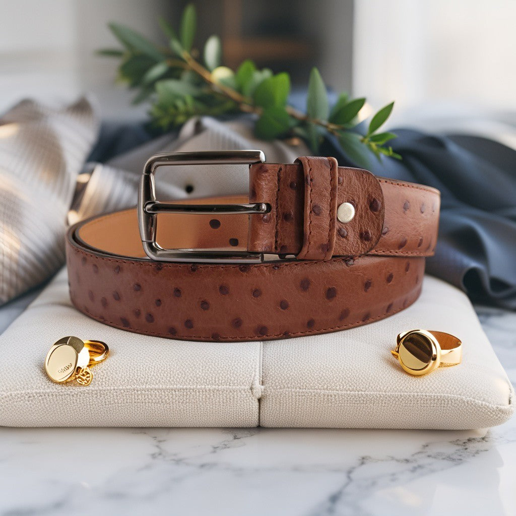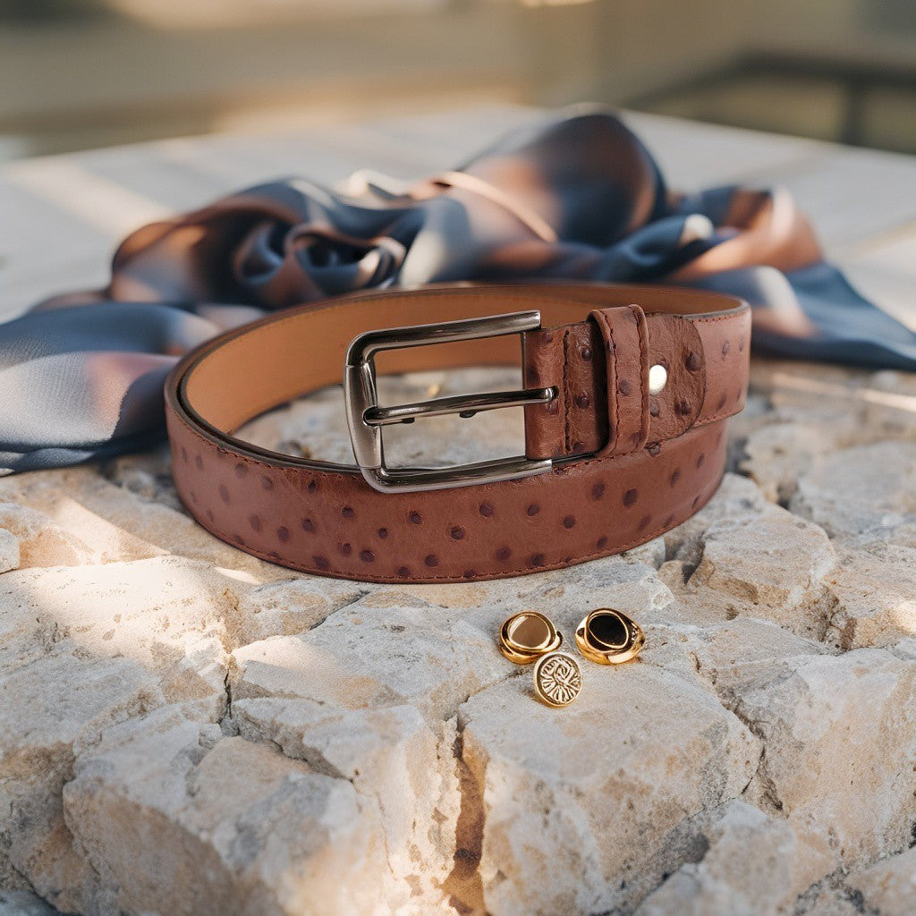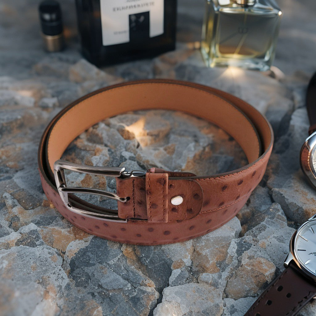 De Eleganza Toscana combineert Italiaanse flair met een unieke struisvogelstructuur in warm cognacbruin leer. Het subtiele patroon en de elegante gesp maken deze unisex riem tot een onderscheidend accessoire dat zowel bij casual als formele outfits prachtig staat.