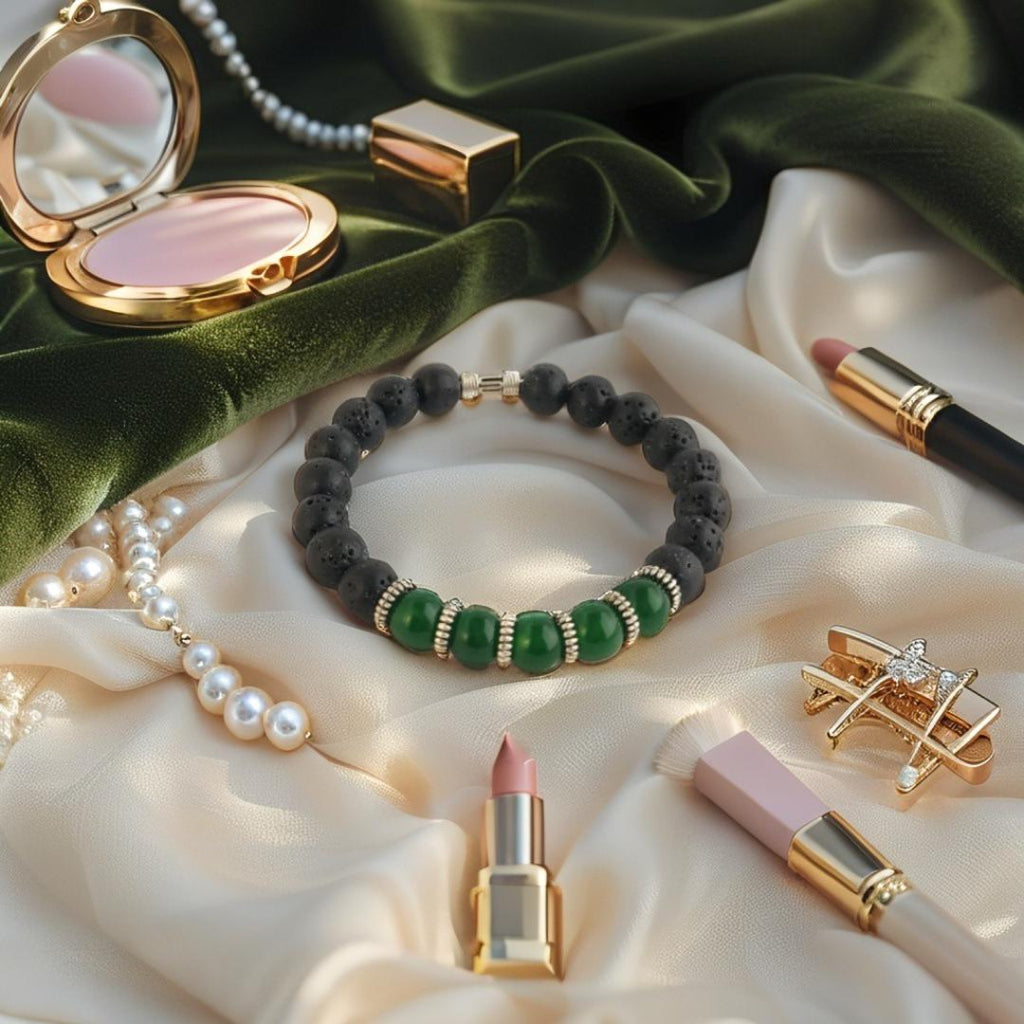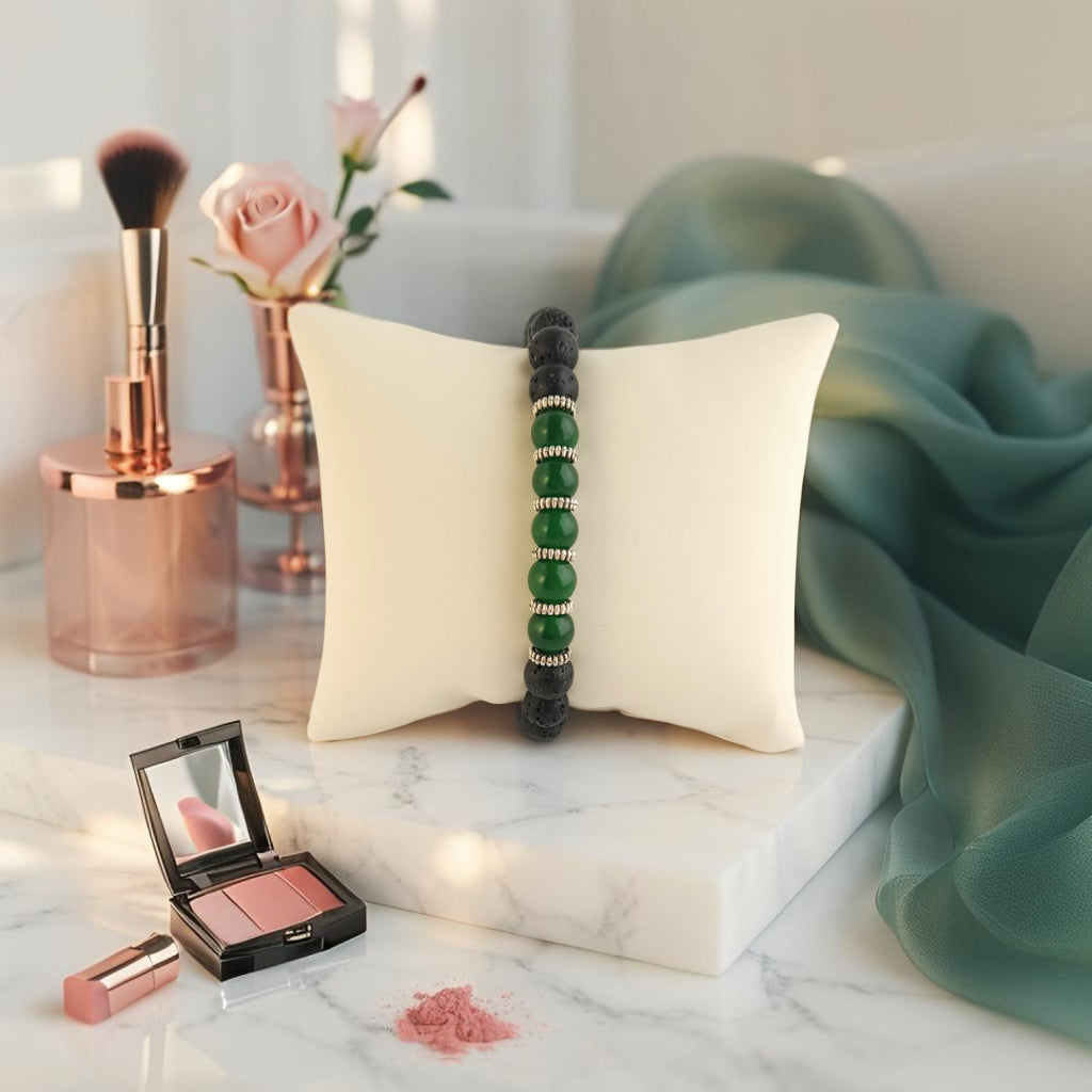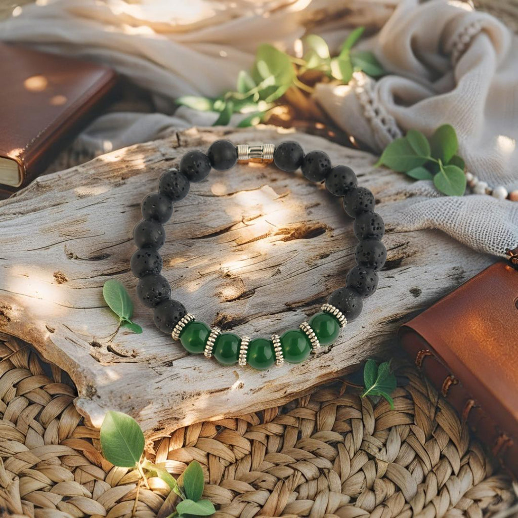 Deze stoere armband combineert ruwe zwarte lavastenen met glanzende groene kralen van 8mm voor een krachtig maar verfijnd contrast. Het robuuste ontwerp is ideaal voor de zelfverzekerde man met gevoel voor stijl.