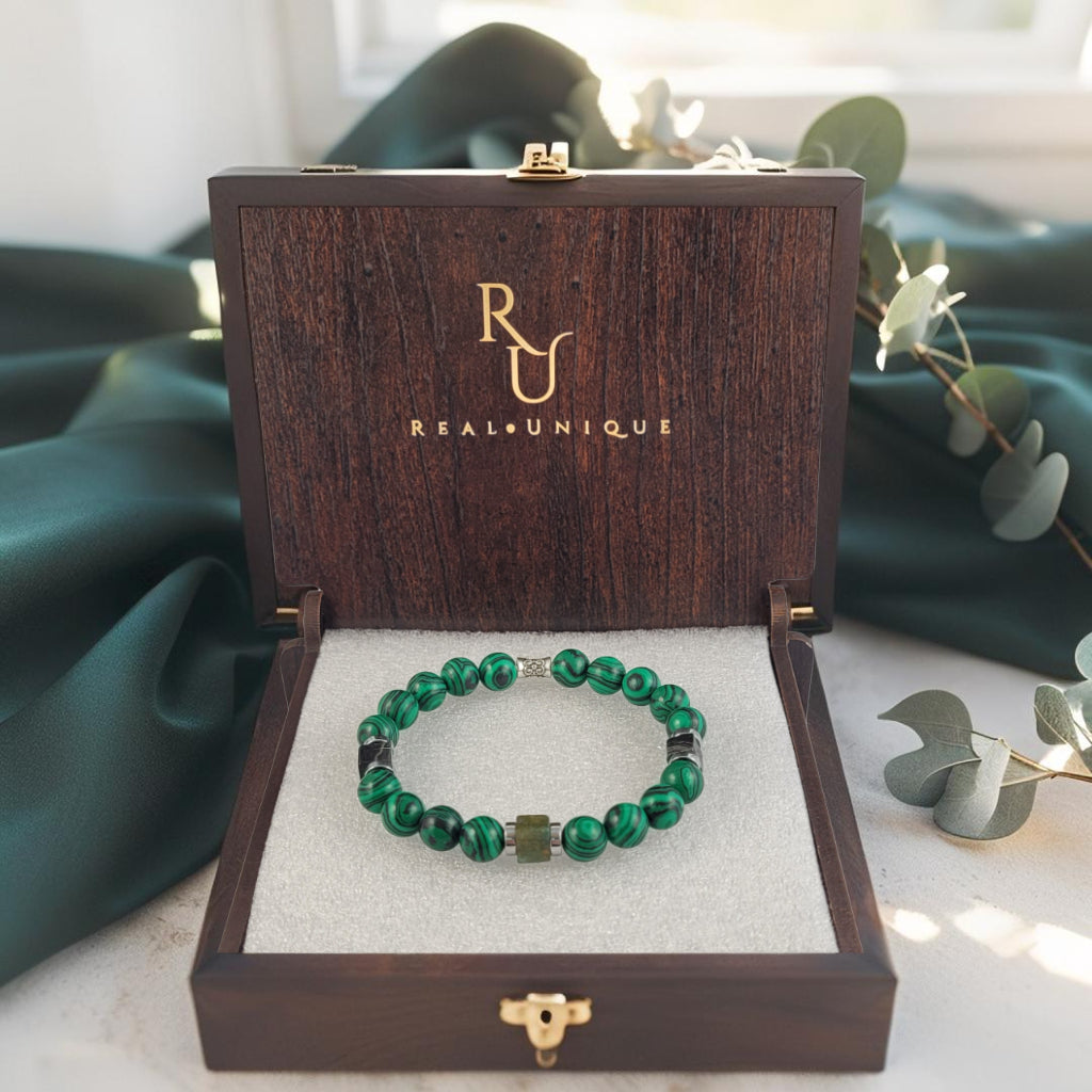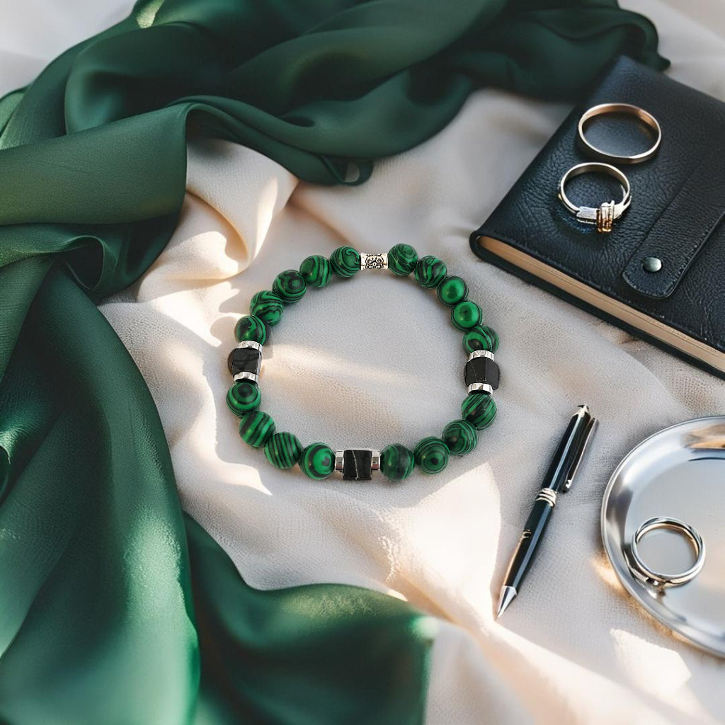 De 'Emerald Night' armband combineert diepe groen gestreepte 8mm malachietstenen met stijlvolle zwarte accenten. Deze krachtige kleurencombinatie straalt vertrouwen en elegantie uit – perfect voor formele én casual gelegenheden.