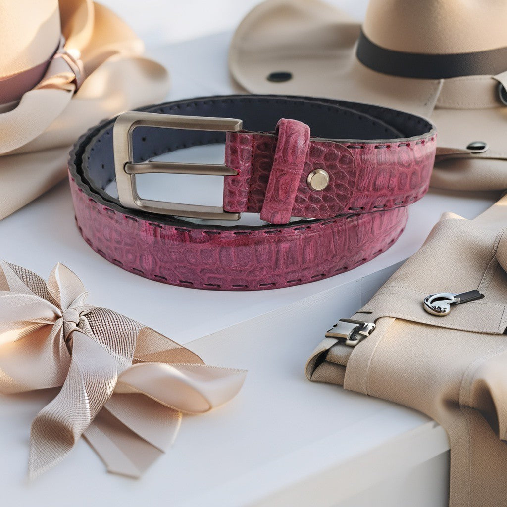Deze opvallende damesriem in fuchsia-roze croco-structuur is een echte eyecatcher. Het glanzende leer en de krokodillenprint geven het ontwerp een luxueuze en elegante uitstraling. Perfect om een basic outfit direct meer karakter en stijl te geven.