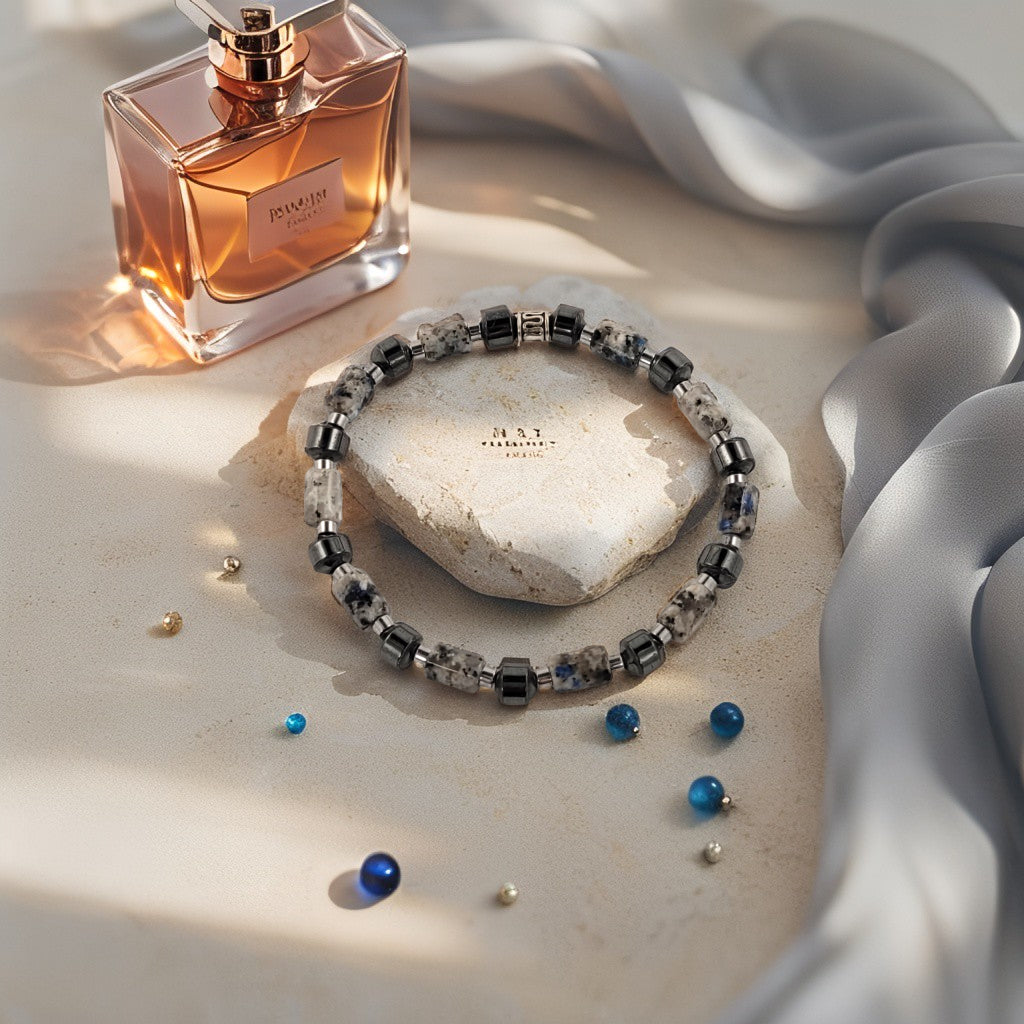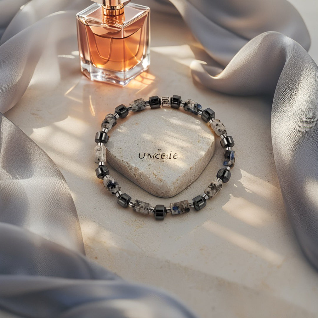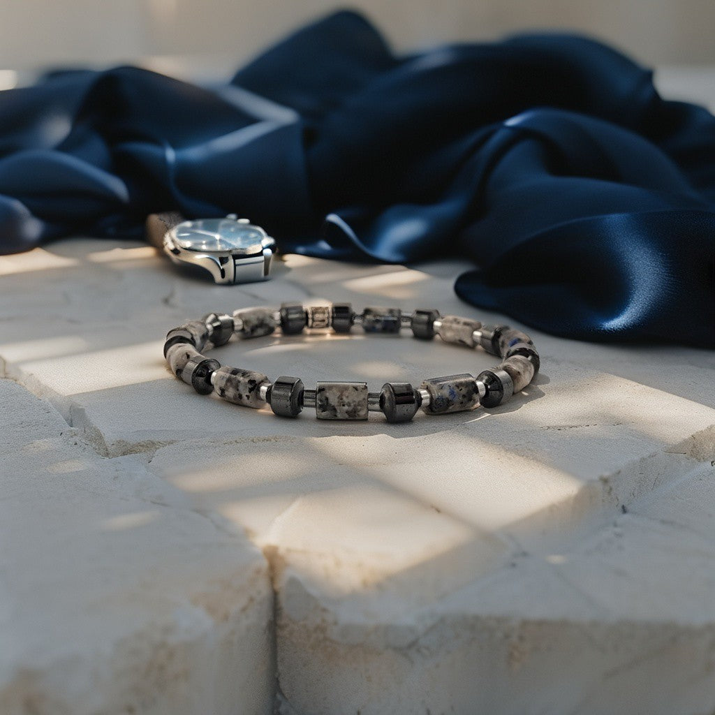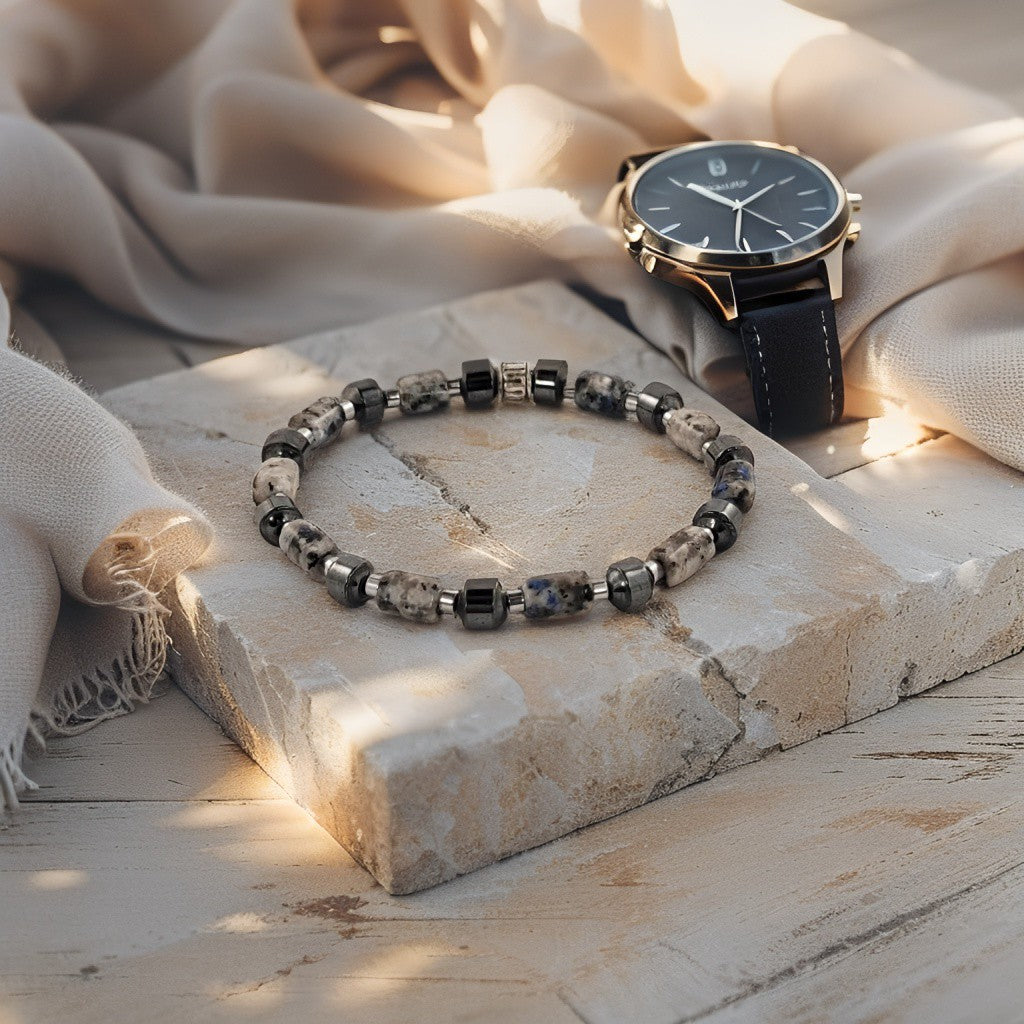 De Grigio Urbano armband brengt de ruige elegantie van dioriet samen met de moderne glans van hematiet. De rechthoekige diorietstenen met grijs-witte patronen en subtiele blauwe nuances geven het ontwerp een unieke, stedelijke uitstraling. Glanzende hematietdetails zorgen voor een krachtig accent, waardoor deze armband een perfecte balans biedt tussen minimalisme en karakter.