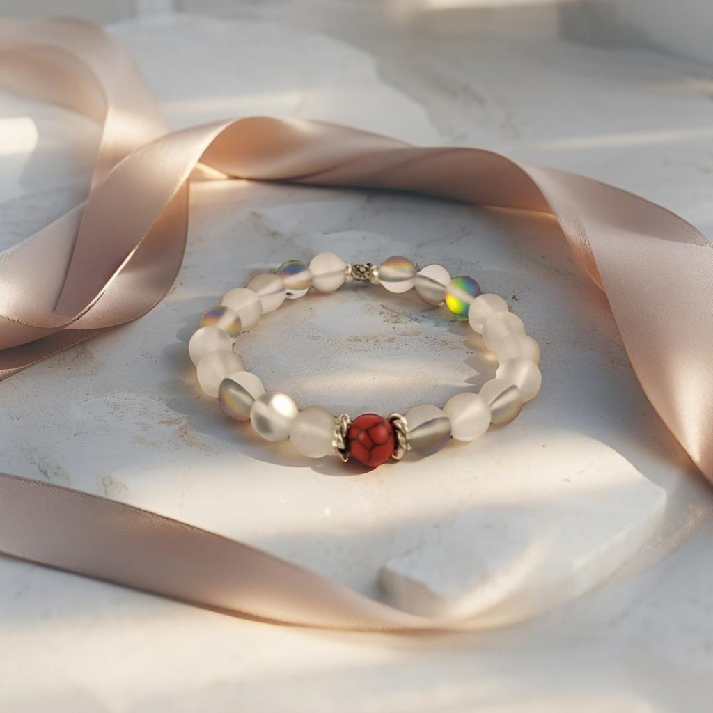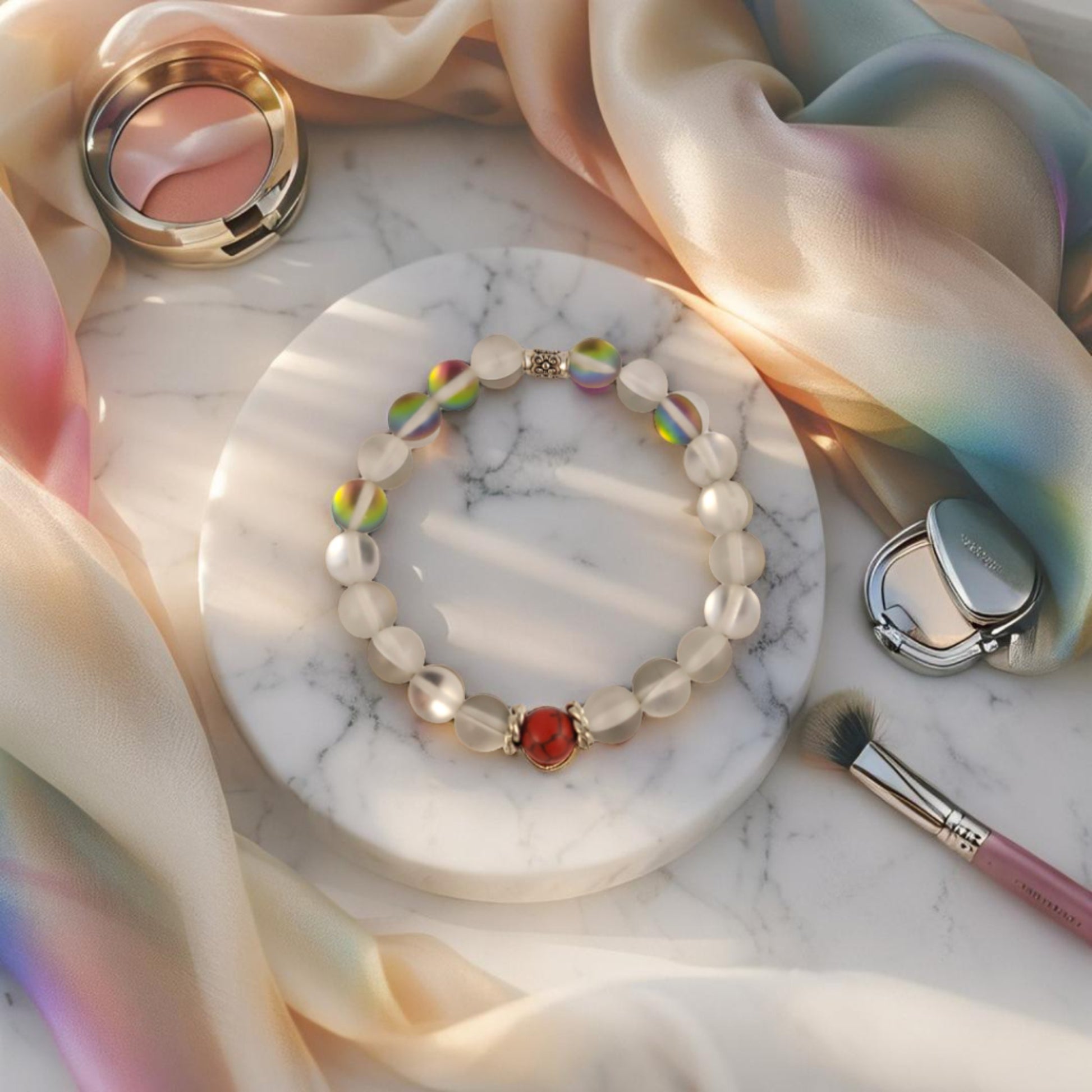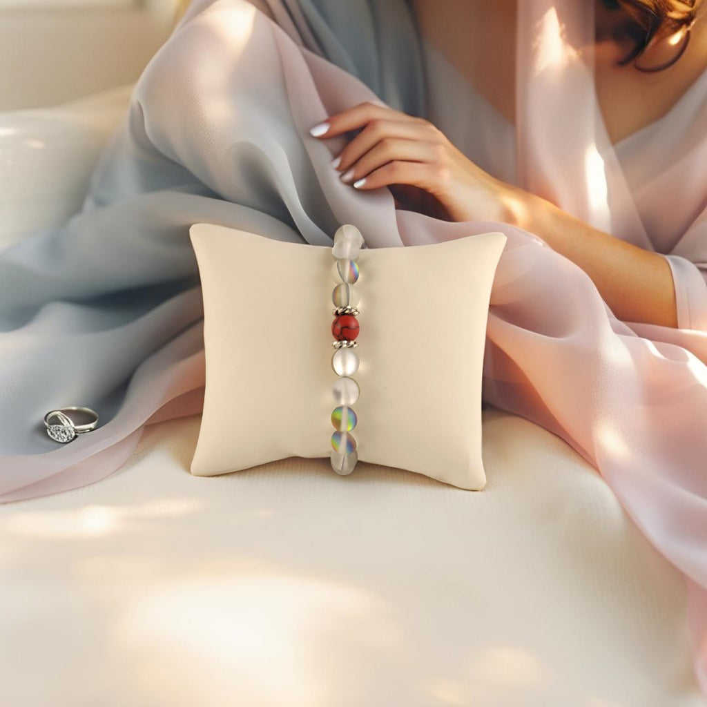 Deze verfijnde armband straalt in elke lichtval dankzij de 8mm regenboog aura glaskralen, die een subtiele schittering geven bij elke beweging. In het midden vormt een opvallende rode natuursteen een krachtig contrast, omlijst door elegante zilverkleurige details. Een unieke en sprankelende armband die perfect past bij een moderne, stijlvolle look met een vleugje mystiek.🎁✨
