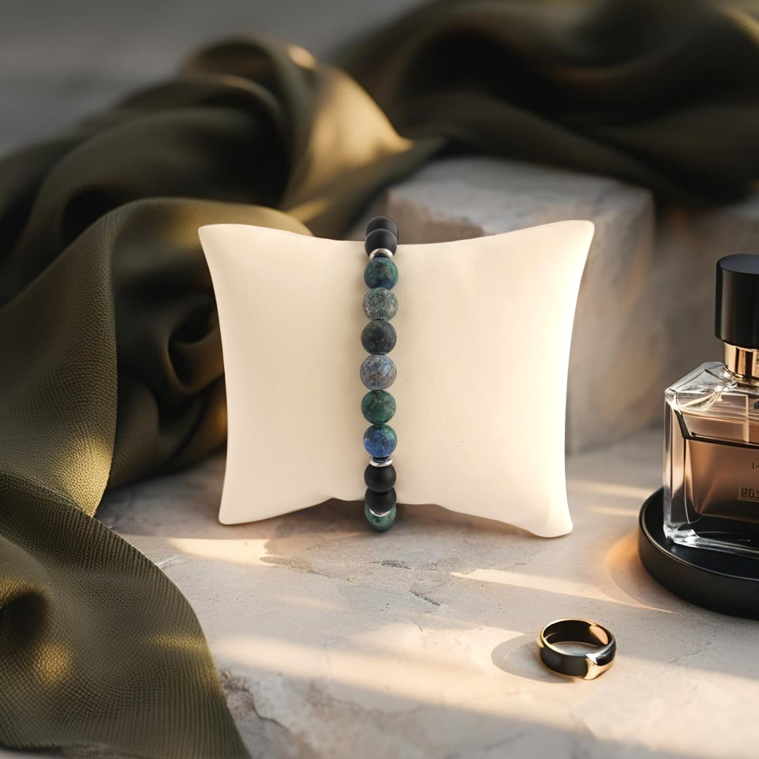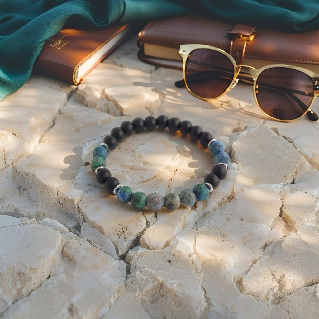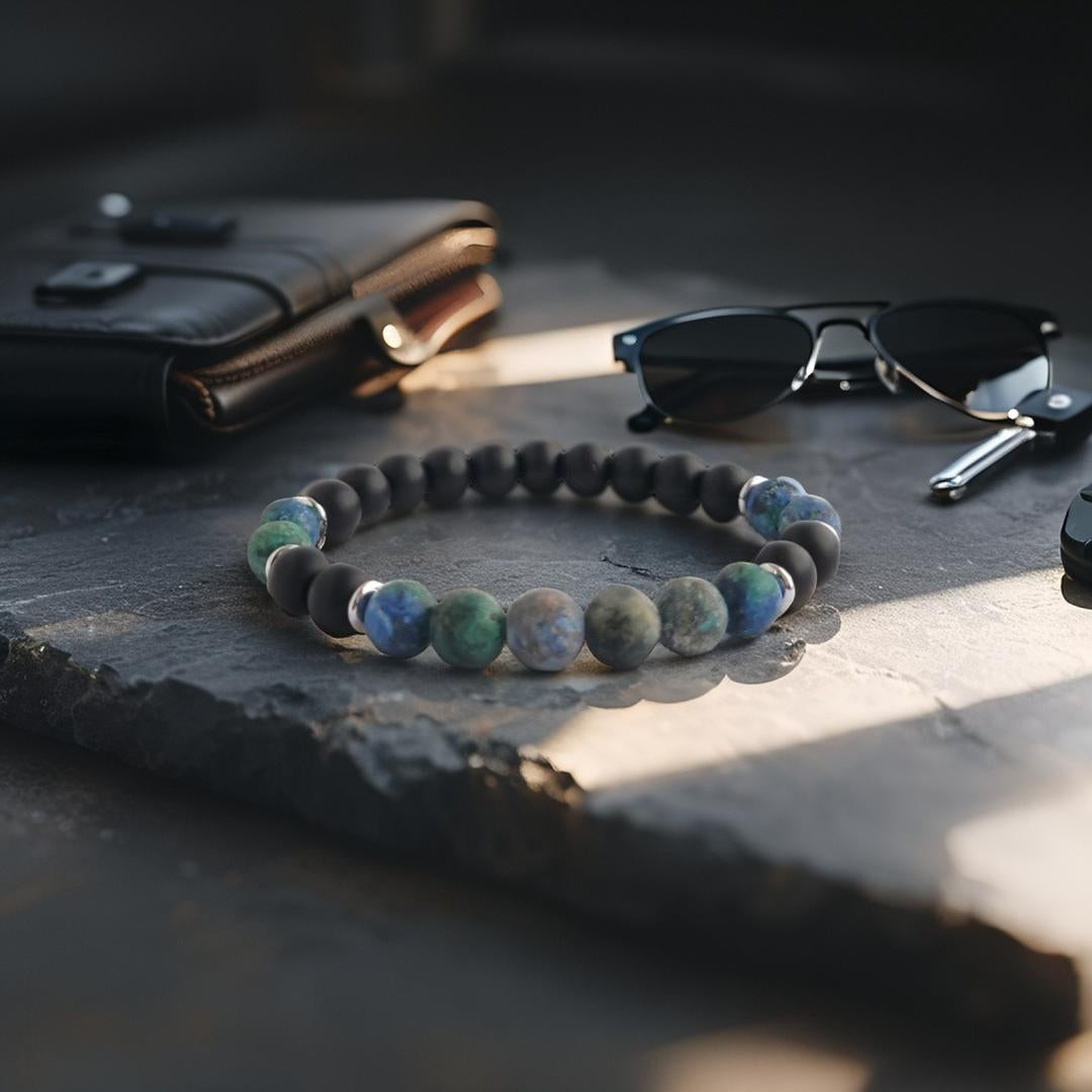 De Middernacht Oceaan armband brengt de diepe kalmte van zwarte matte Onyx samen met de levendige tinten van blauwe natuursteen (8mm), die doen denken aan golven onder een nachtelijke hemel. Subtiele metalen accenten geven de armband een moderne, elegante uitstraling – perfect voor elke stijl.