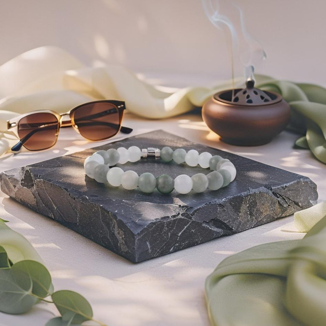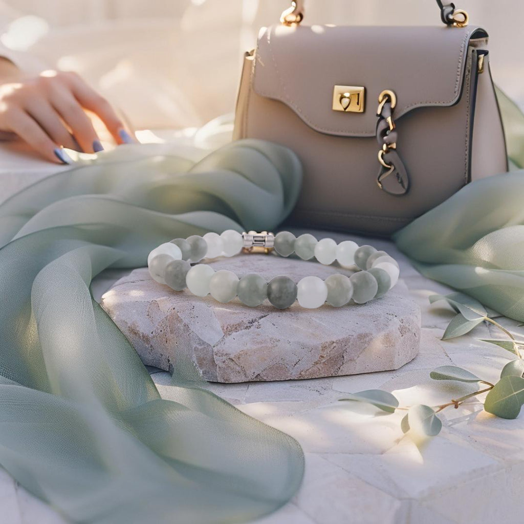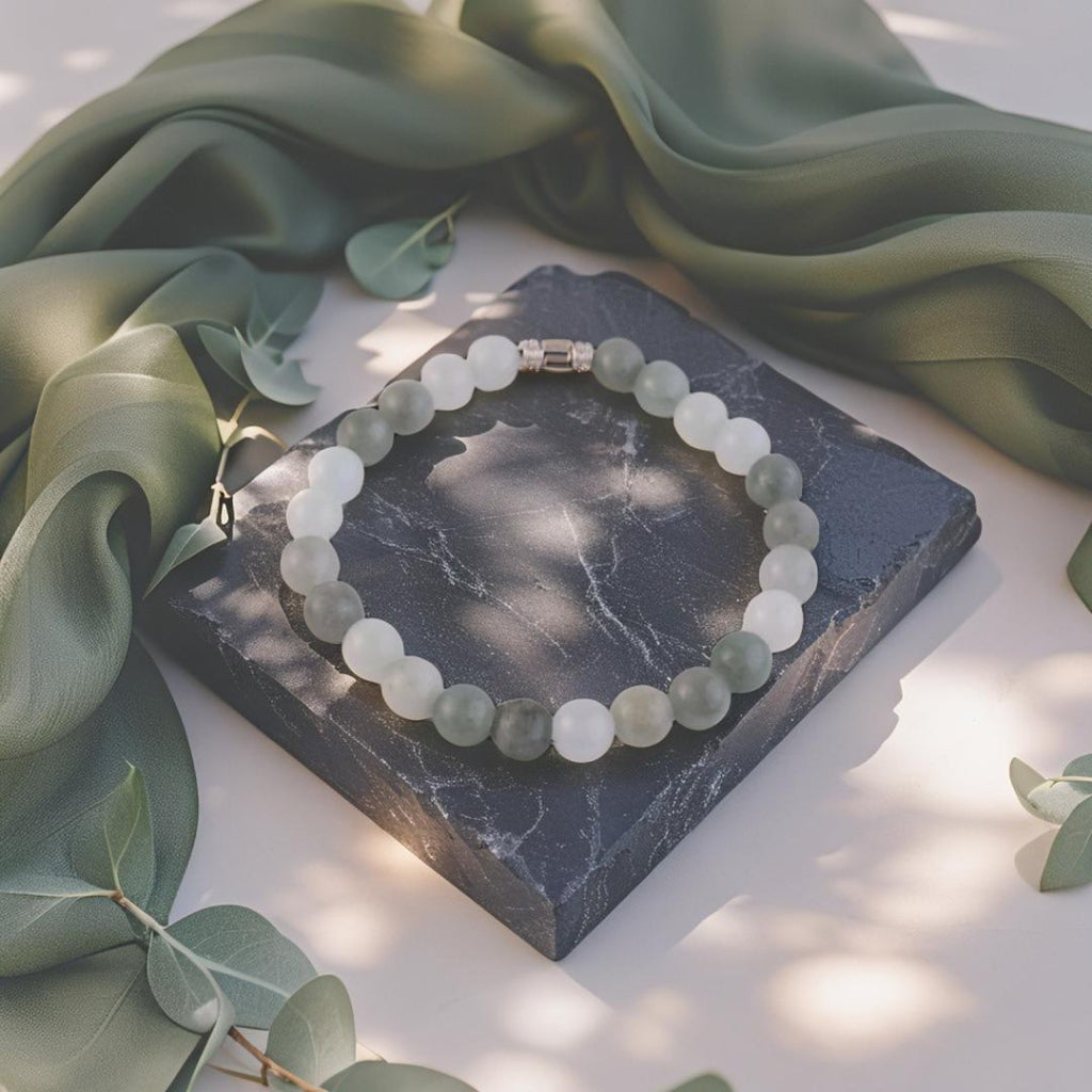 Deze serene armband is gemaakt van zachte groene en witte 8mm edelstenen die samen een rustgevende, elegante uitstraling creëren. Ideaal voor wie houdt van subtiele natuurlijke tinten en verfijnde eenvoud.