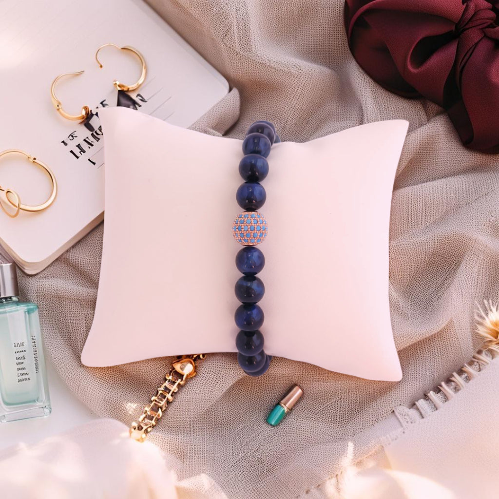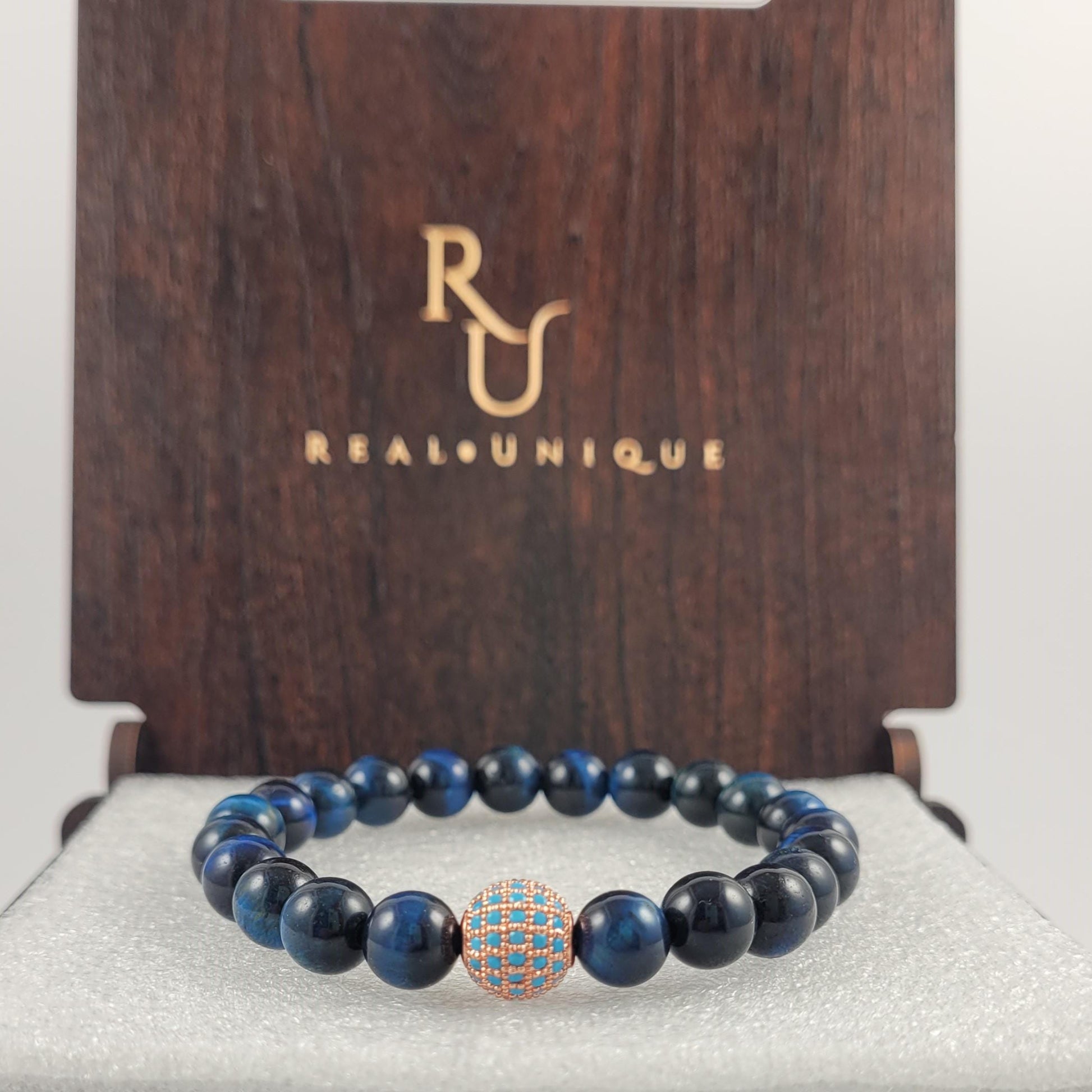 Deze verfijnde armband straalt mysterie en elegantie uit met diepe blauwe 8mm edelstenen en een opvallende centrale kraal met turquoise en goudkleurige accenten. Perfect voor een unieke en stijlvolle uitstraling. Deze armband wordt geleverd in een unieke geschenkverpakking, perfect om cadeau te geven! 🎁✨