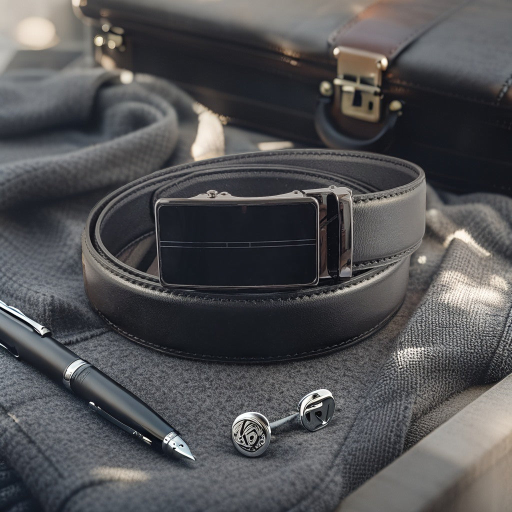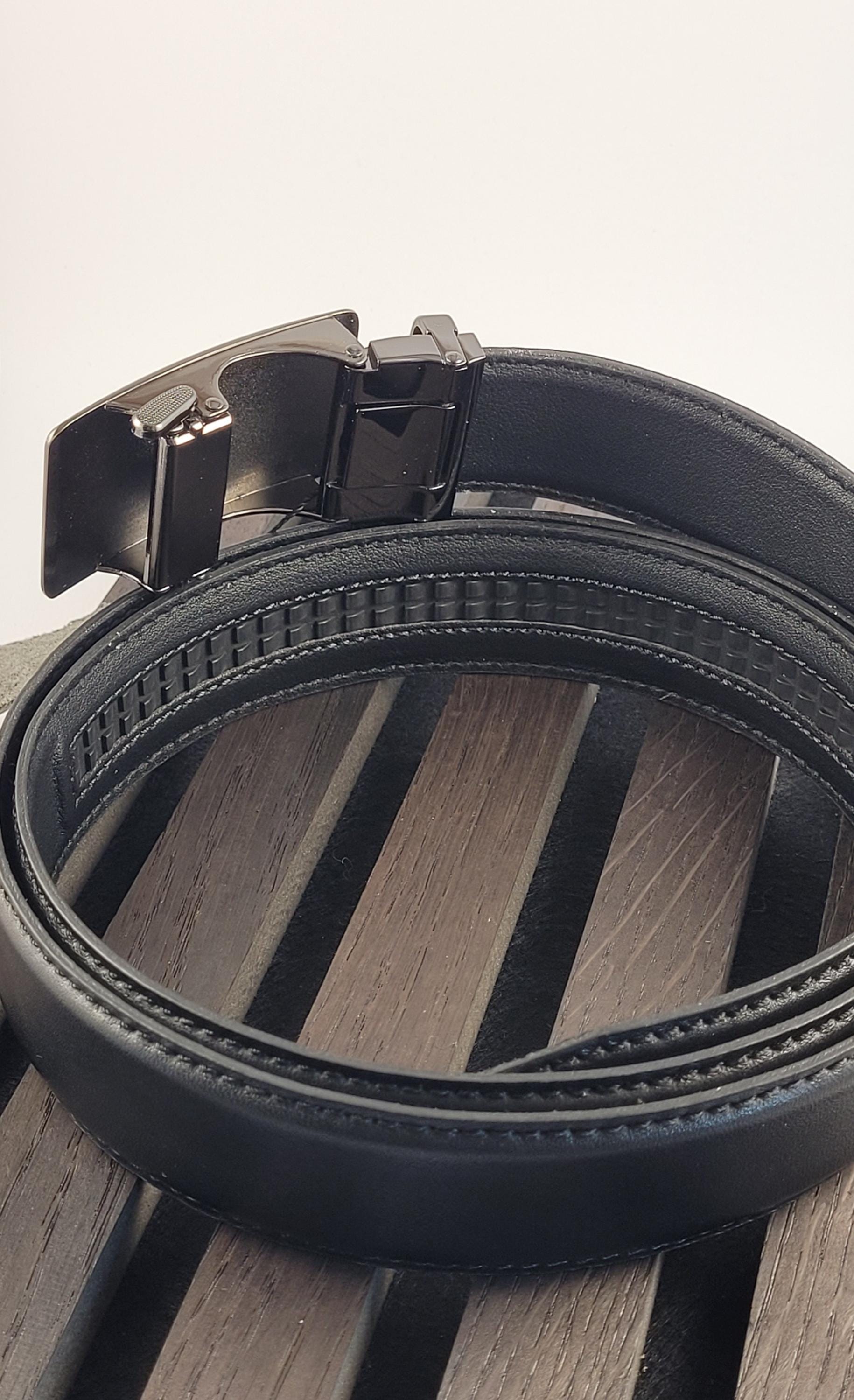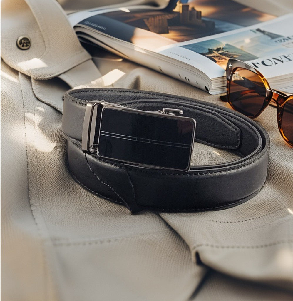 Strakke lijnen, diepe zwarte kleur en een glanzende automatische gesp maken deze riem tot een toonbeeld van moderne elegantie. Gemaakt van natuurlijk leer voor comfort en duurzaamheid.