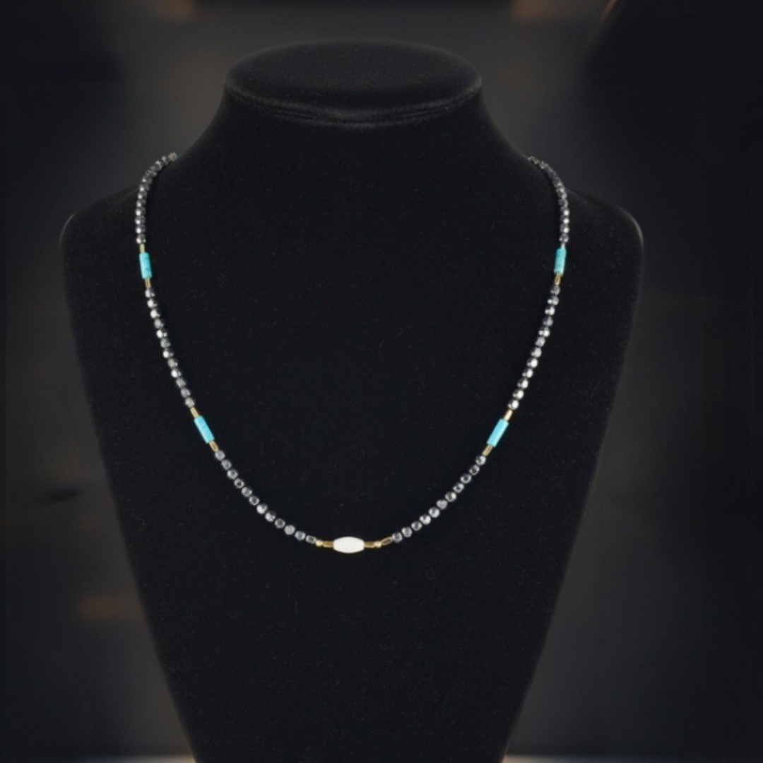 Een stijlvolle en verfijnde ketting met een elegante mix van glanzende hematiet, turquoise howliet en zachte witte schelp.