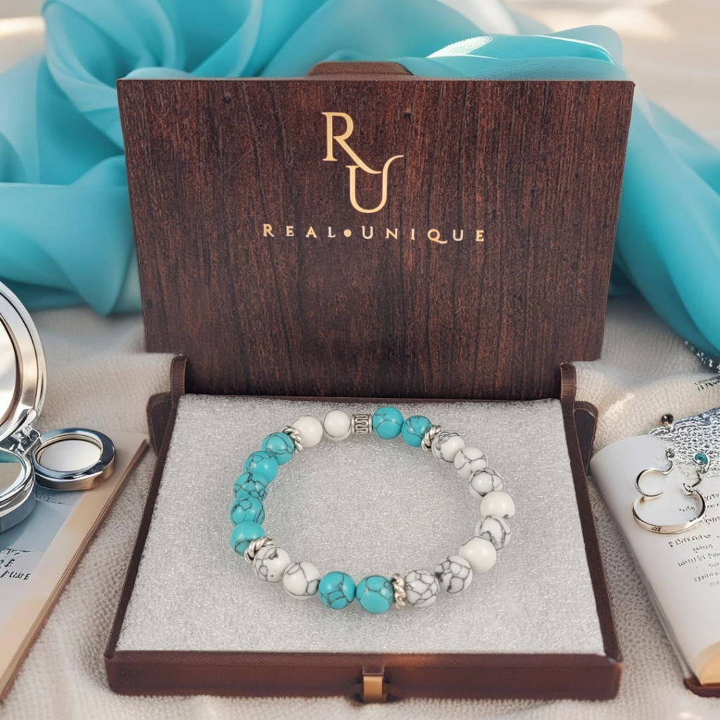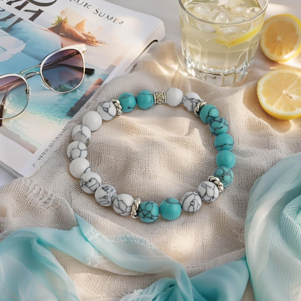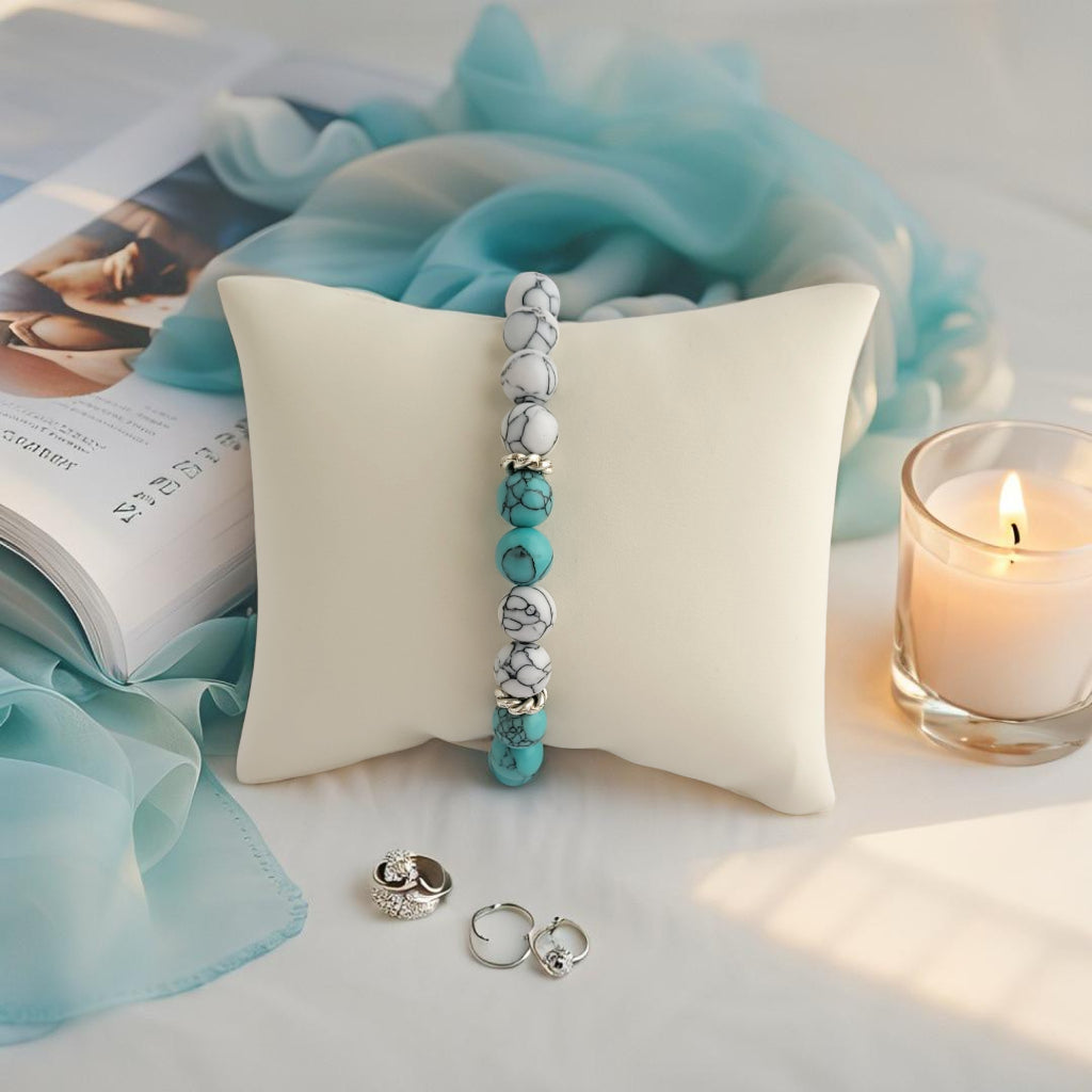 Ontdek de kalmte van de natuur met deze "Oase" armband, een verfijnde combinatie van turquoise en witte 8mm stenen, met subtiele zilverkleurige accenten. Deze armband straalt sereniteit en stijl uit, perfect om elke outfit een frisse, elegante touch te geven. De koele tinten roepen het gevoel van een rustige oase op, waar stijl en rust elkaar ontmoeten.Deze armband wordt geleverd in een unieke geschenkverpakking, perfect om cadeau te geven! 🎁✨
