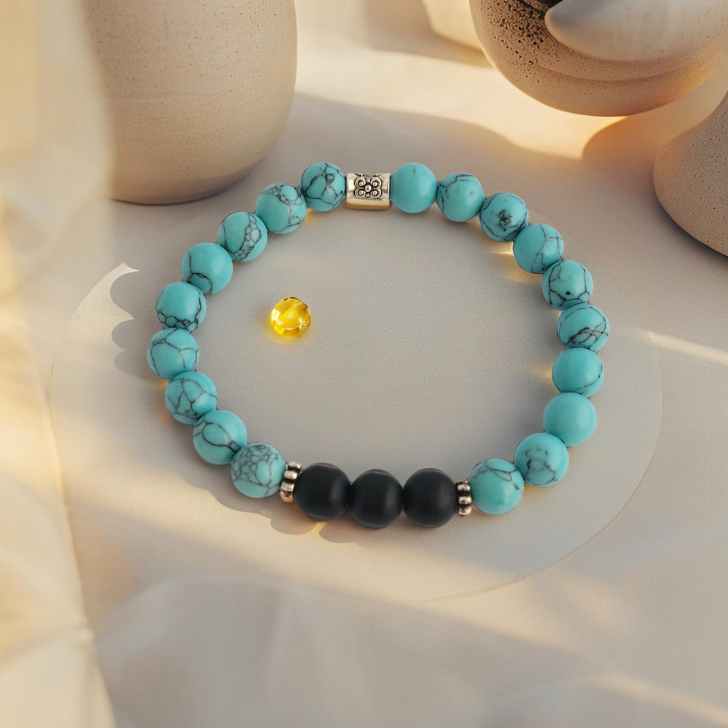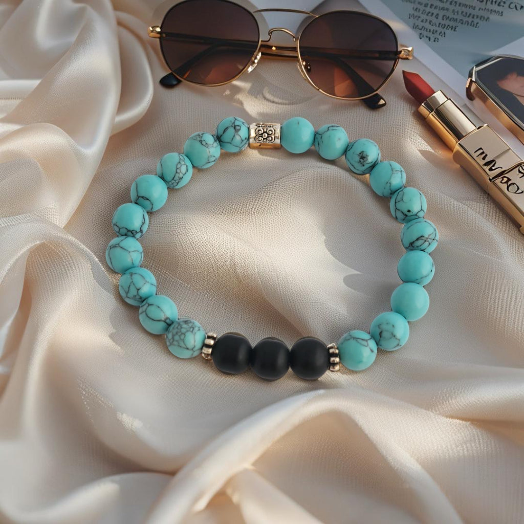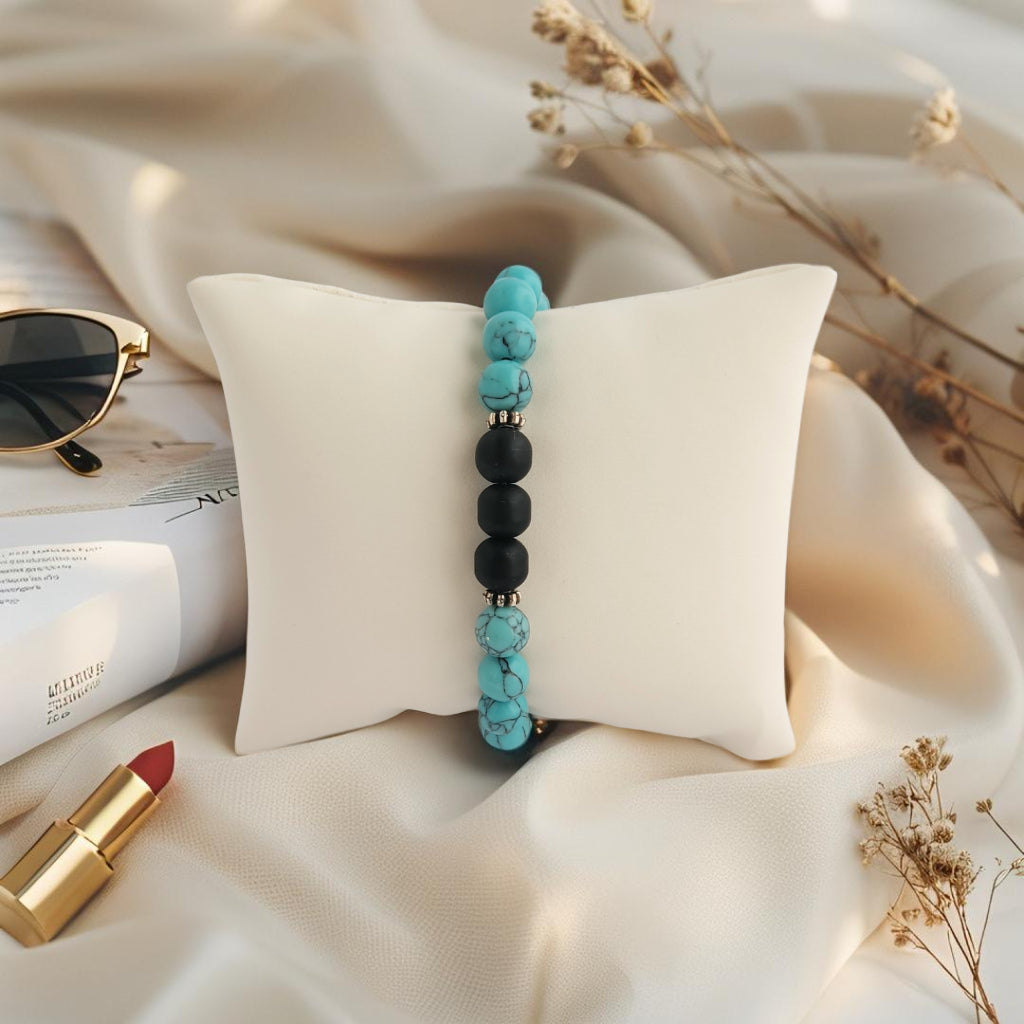De 'Ocean Bold' armband combineert de krachtige uitstraling van matte zwarte stenen met de frisse turquoise edelstenen voor een opvallend en stijlvol contrast.