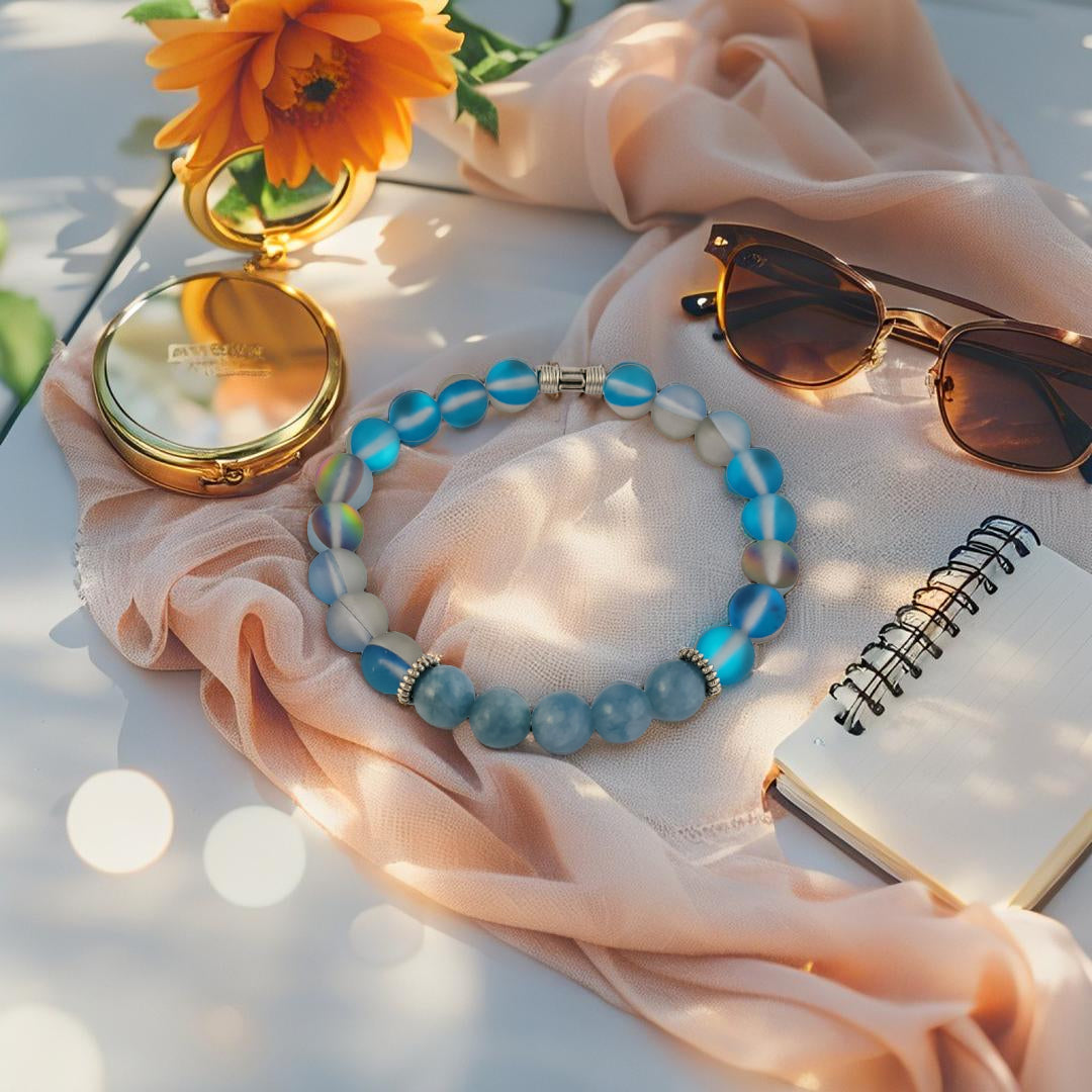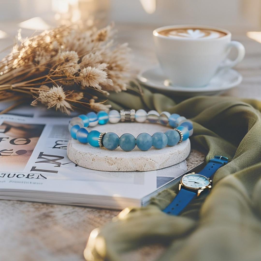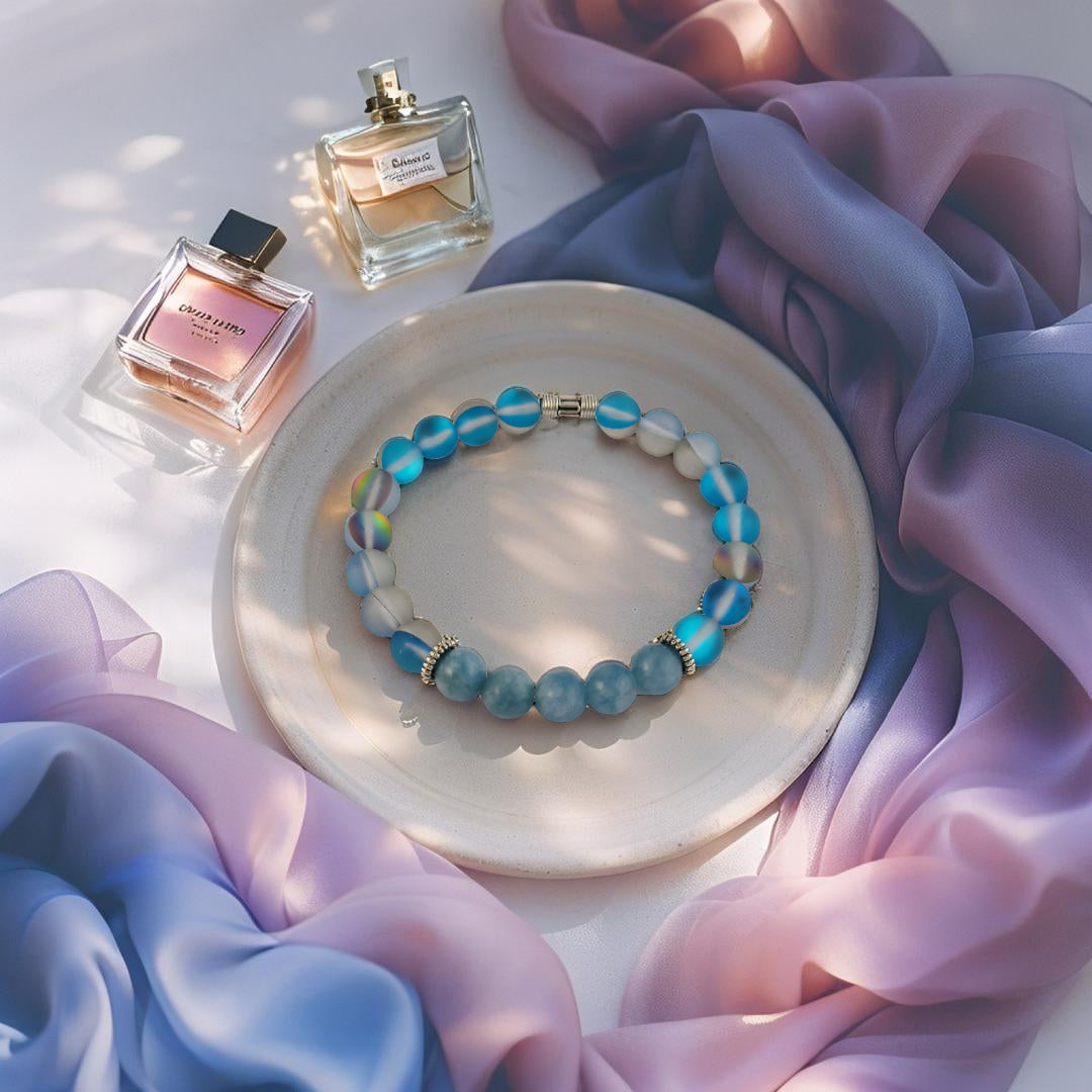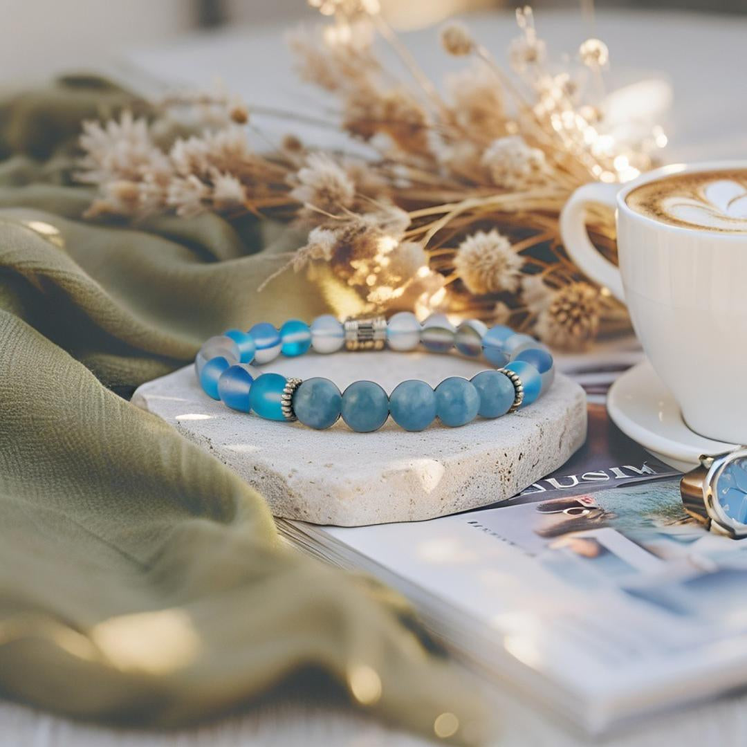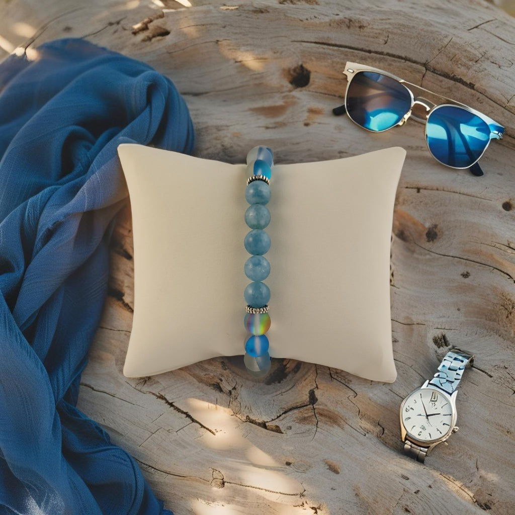 Deze frisse armband combineert zachte matte blauwe natuurstenen (8mm) met iriserende regenboogaccenten voor een speelse, moderne uitstraling. De elastische pasvorm en het subtiele kleurverloop maken dit accessoire perfect voor dagelijks gebruik – zowel voor hem als voor haar.