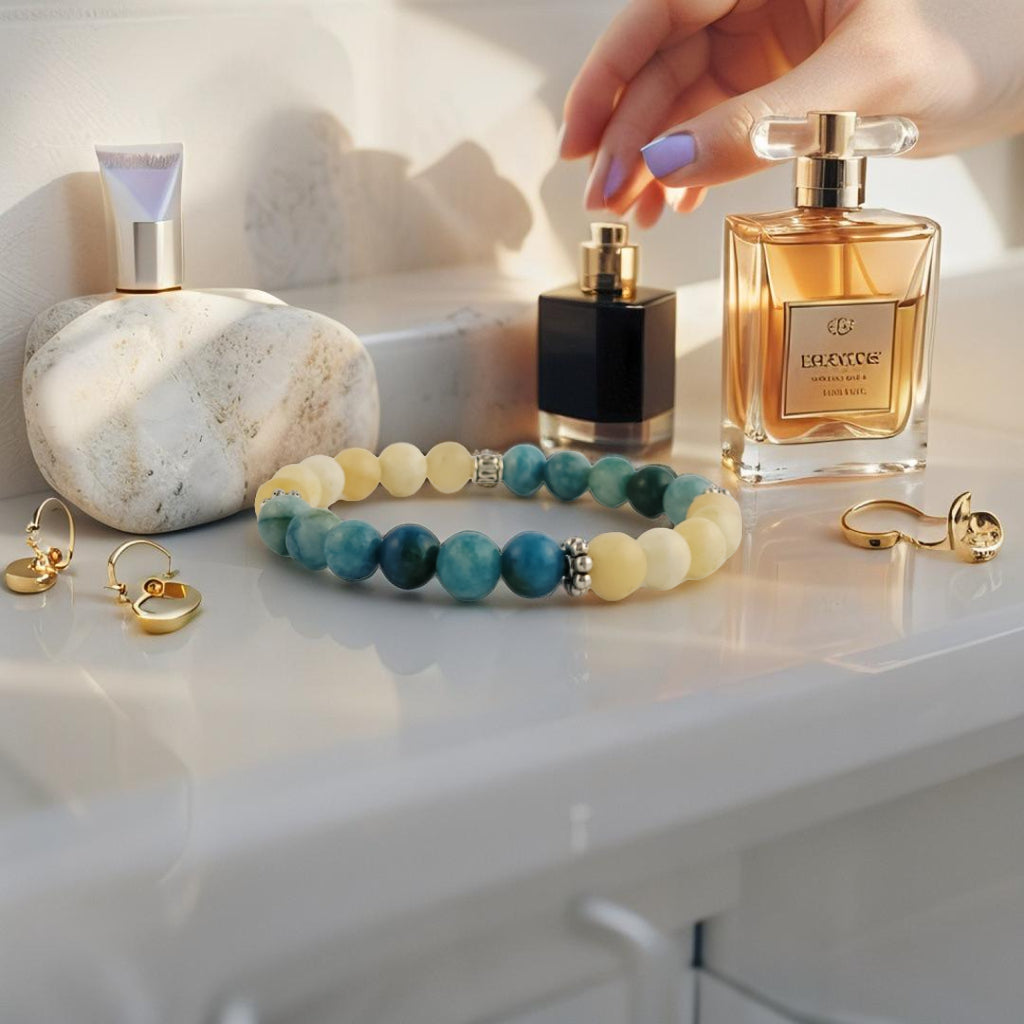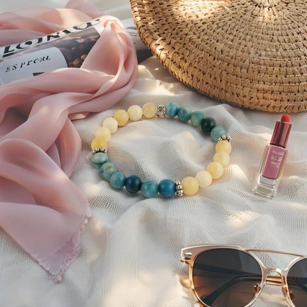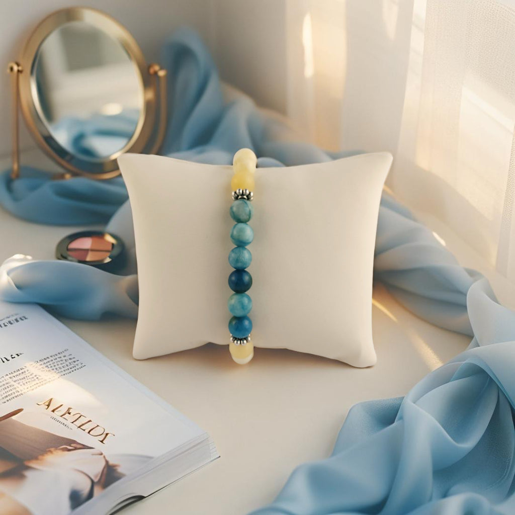 Deze elegante armband combineert warme gele en frisse blauwe 8mm edelstenen tot een levendige, zomerse compositie. De perfecte keuze voor wie houdt van kleur, zachtheid en een vleugje luxe in haar look.