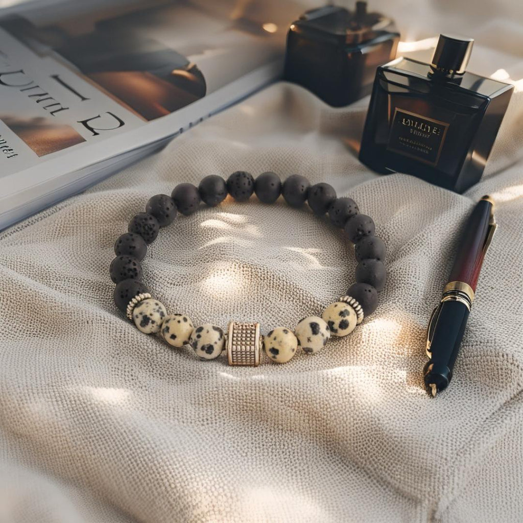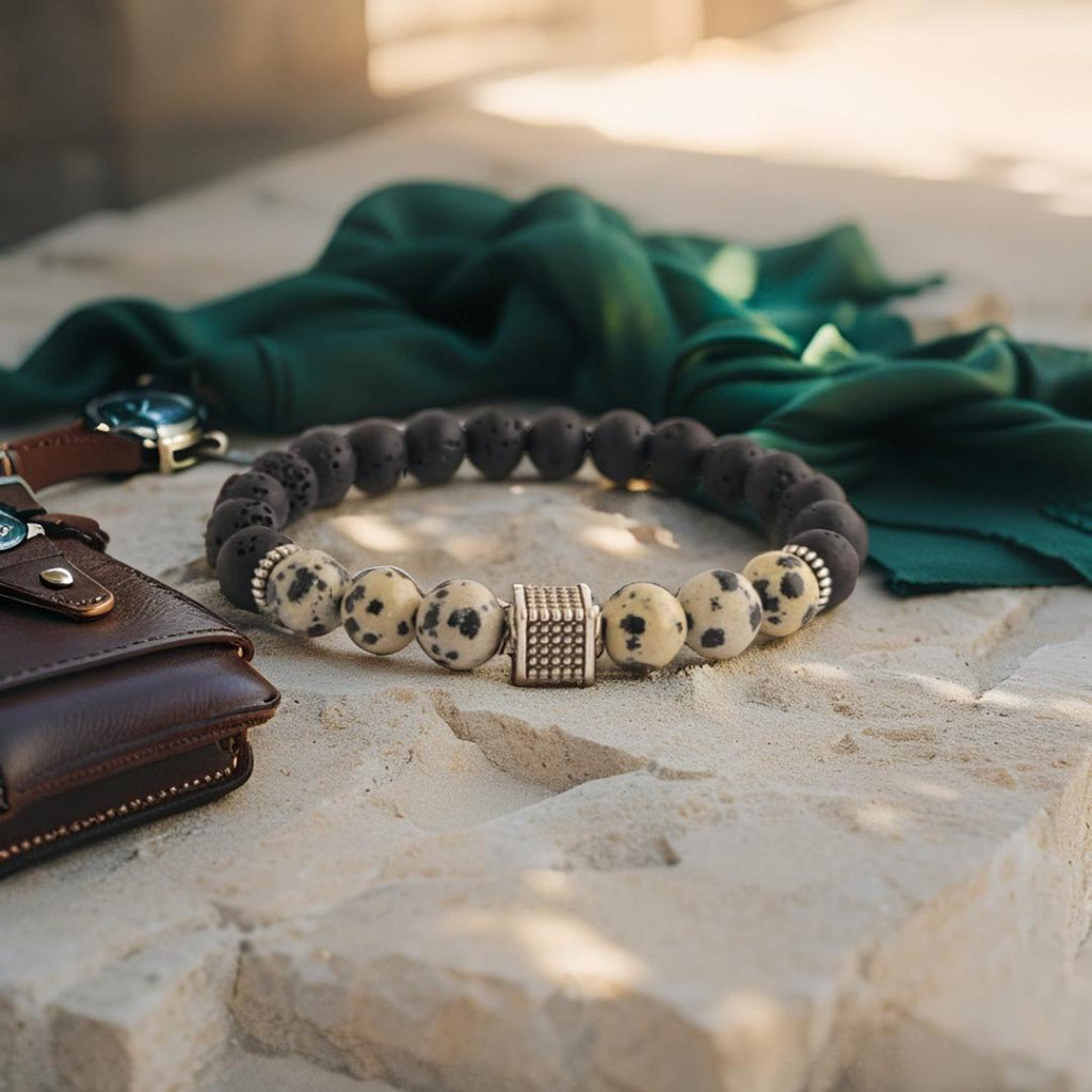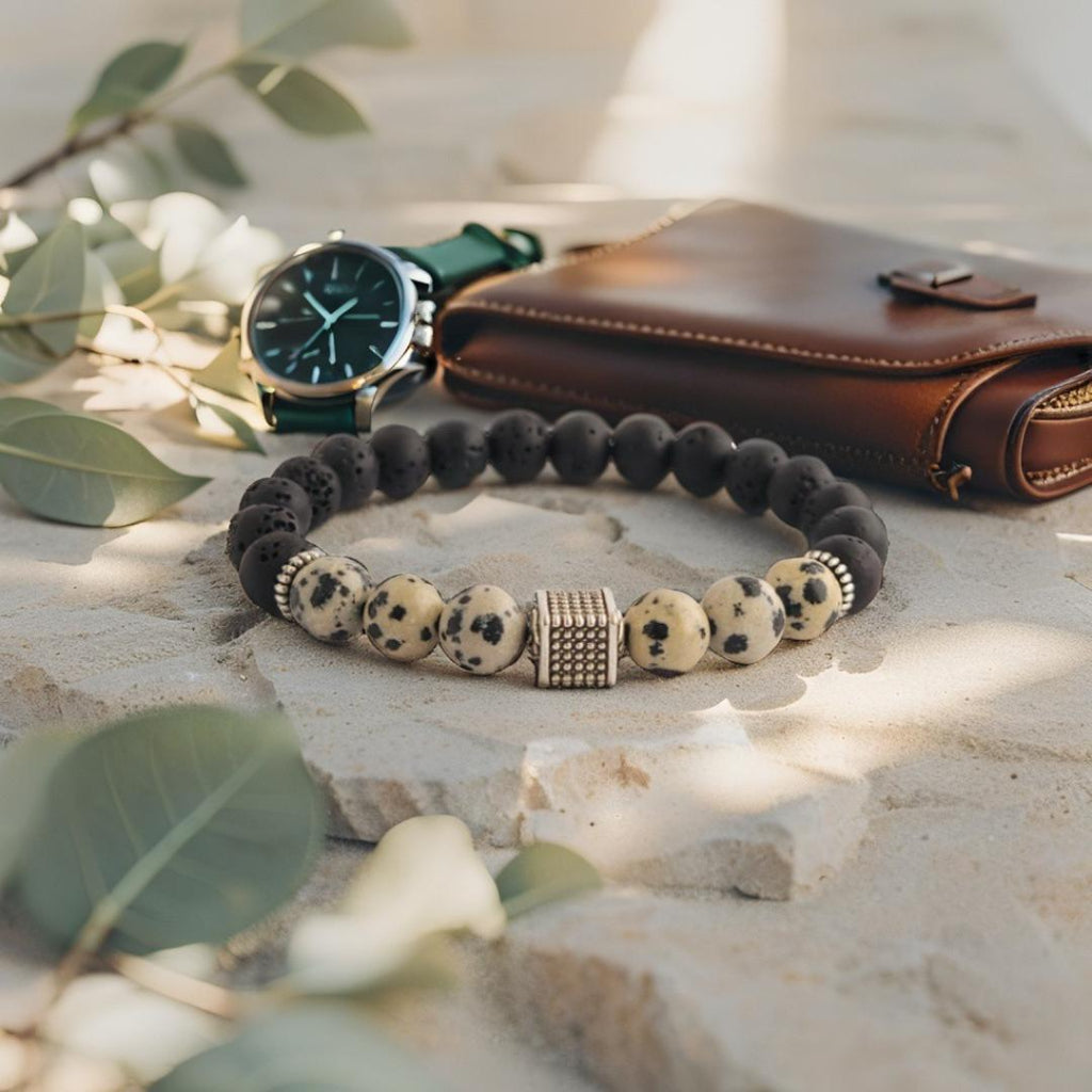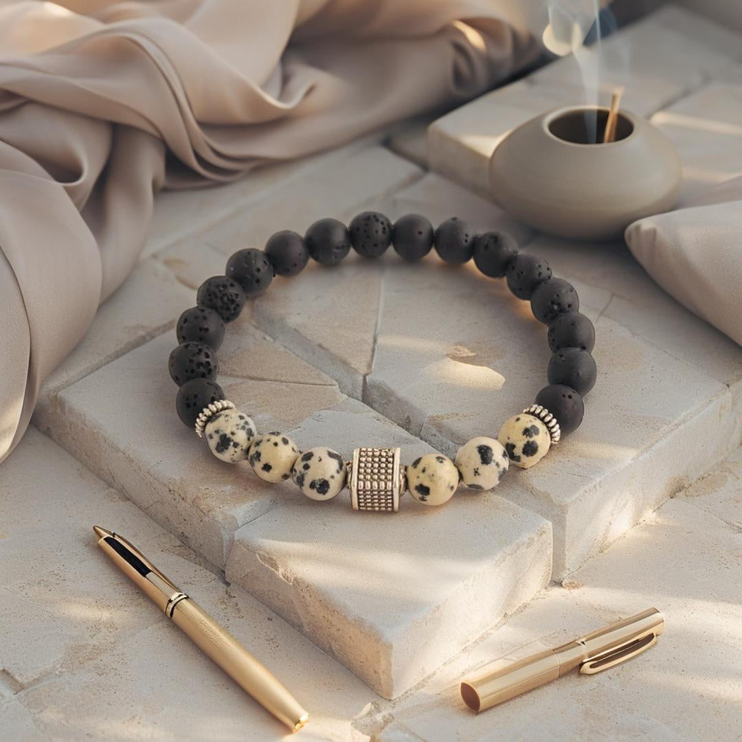 De Pietra Notte armband combineert diepe zwarte 8mm lavastenen met lichtbeige Dalmatier Jaspis kralen vol speelse vlekken. Deze mix van natuurlijke texturen en kleuren roept het gevoel op van een stille woestijnnacht – krachtig, mysterieus en stijlvol.