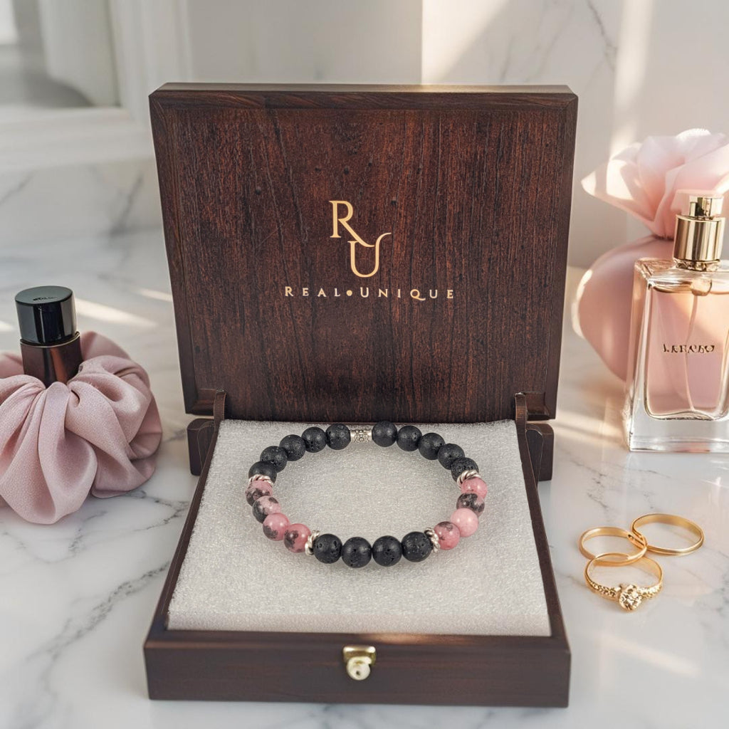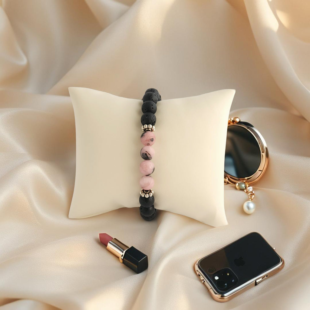 De Rose Lava armband combineert stoere zwarte lavastenen met zachte roze edelstenen van 8mm, voor een stijlvol contrast dat kracht en vrouwelijkheid uitstraalt.