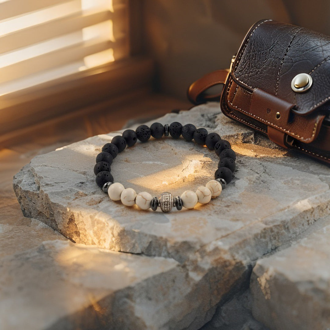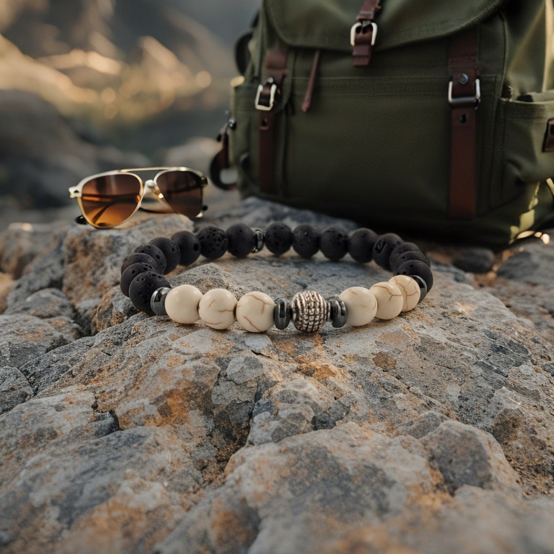 De Sabbia Vulcanica armband vangt de ruwe kracht van vulkanisch gesteente en combineert dit met de zachte elegantie van crème howliet. De diepzwarte, poreuze lavastenen brengen een robuuste uitstraling, terwijl de gladde howliet kralen met subtiele aders zorgen voor verfijning en balans. Het luxueus bewerkte metalen middenelement maakt het geheel af, waardoor deze armband perfect is voor de moderne avonturier die stijl en karakter wil uitstralen.