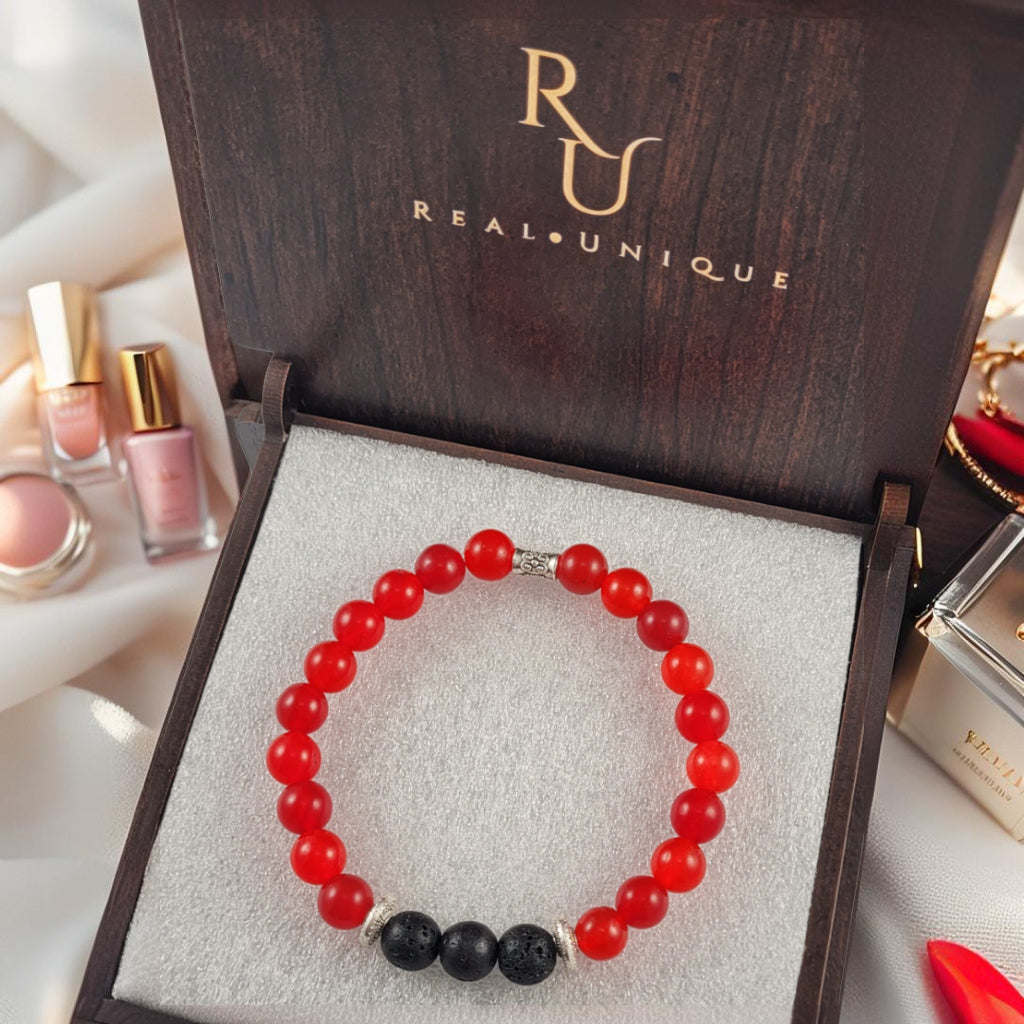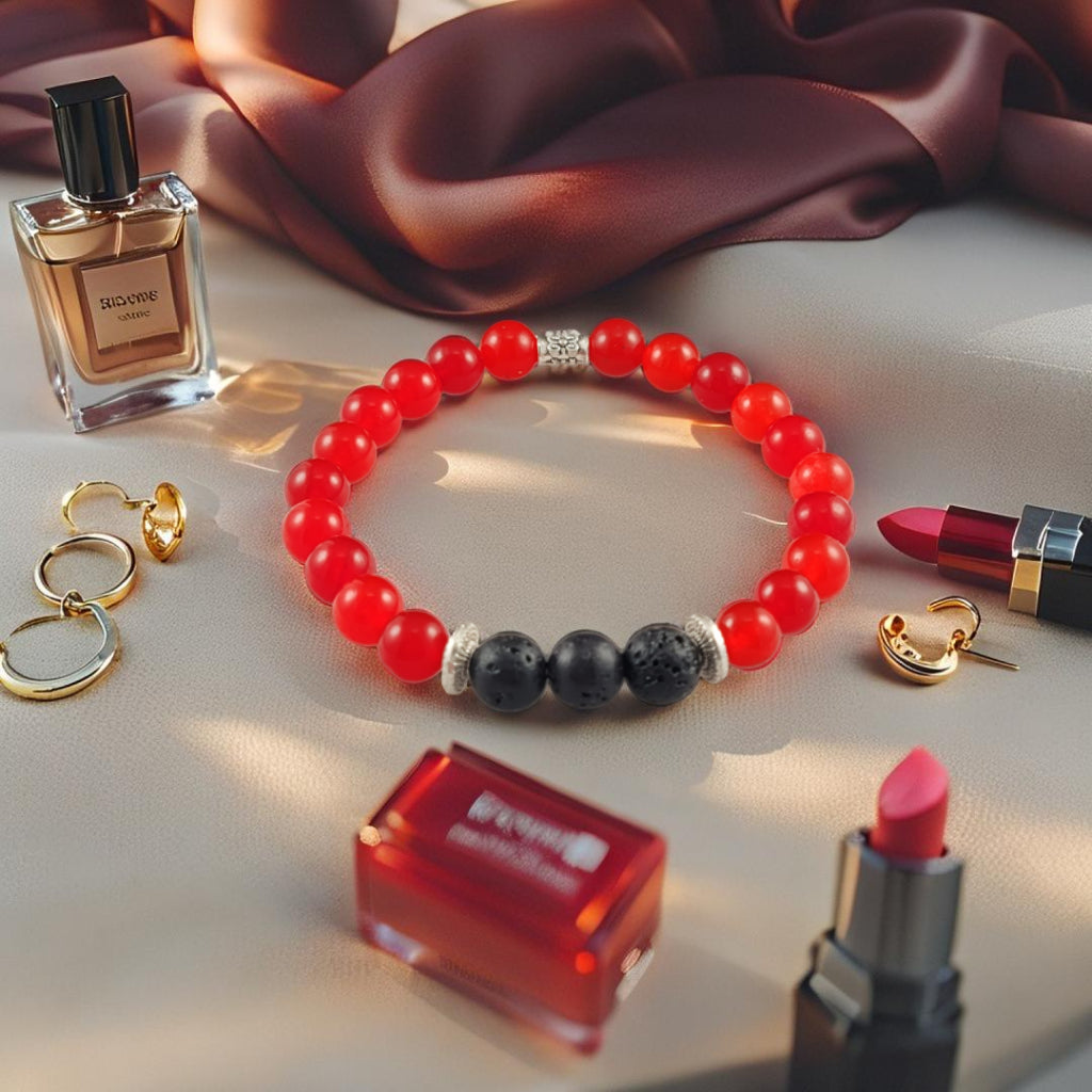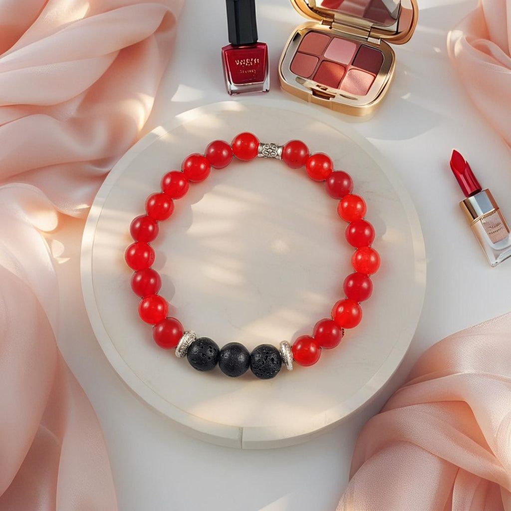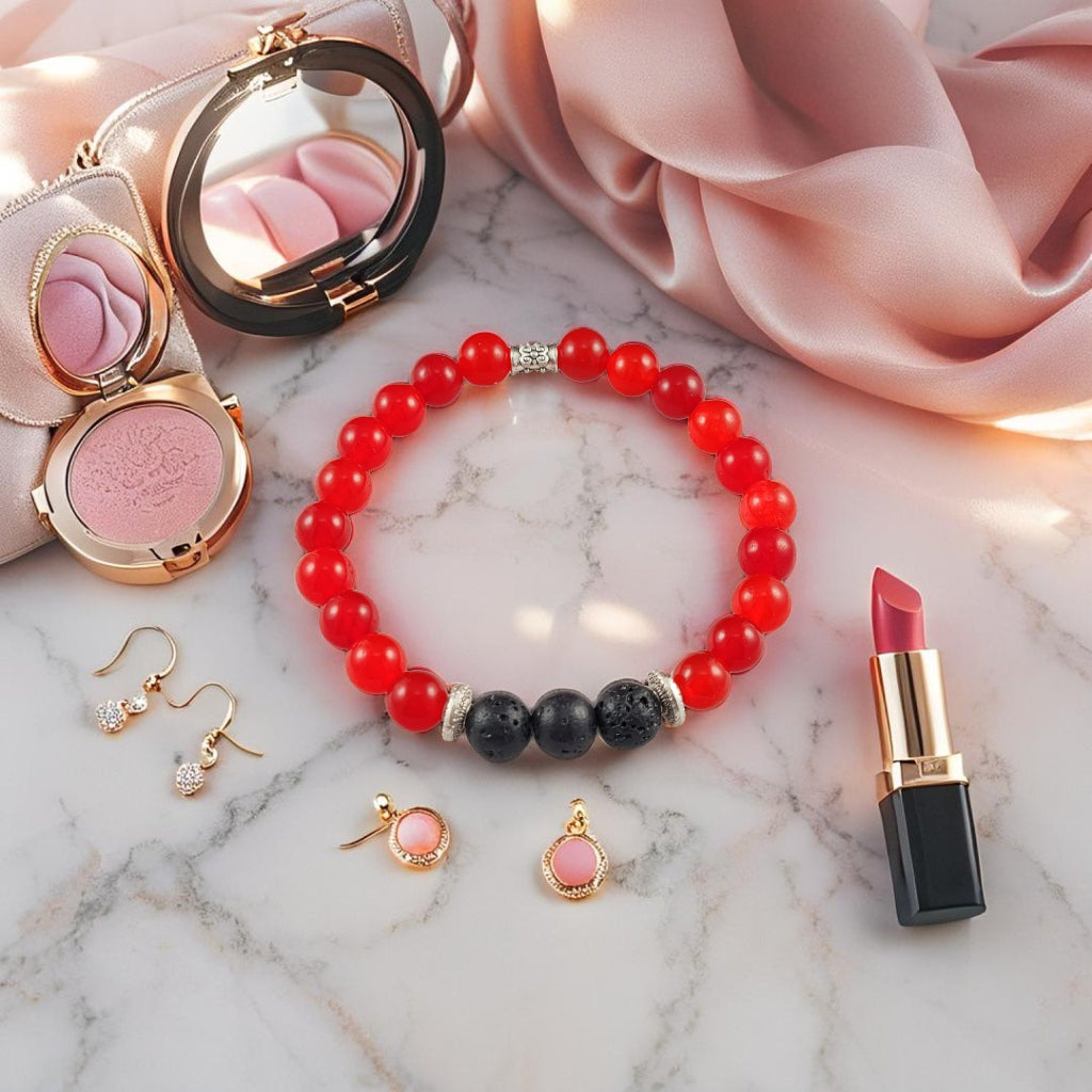 Met vurige rode 8mm edelstenen en een krachtig accent van zwarte lavastenen straalt de Scarlet Flame armband zelfvertrouwen en passie uit. Een opvallend accessoire dat elke outfit tot leven brengt – perfect voor de vrouw die durft op te vallen.