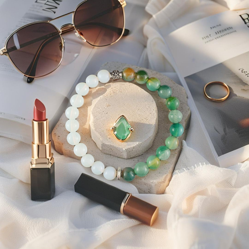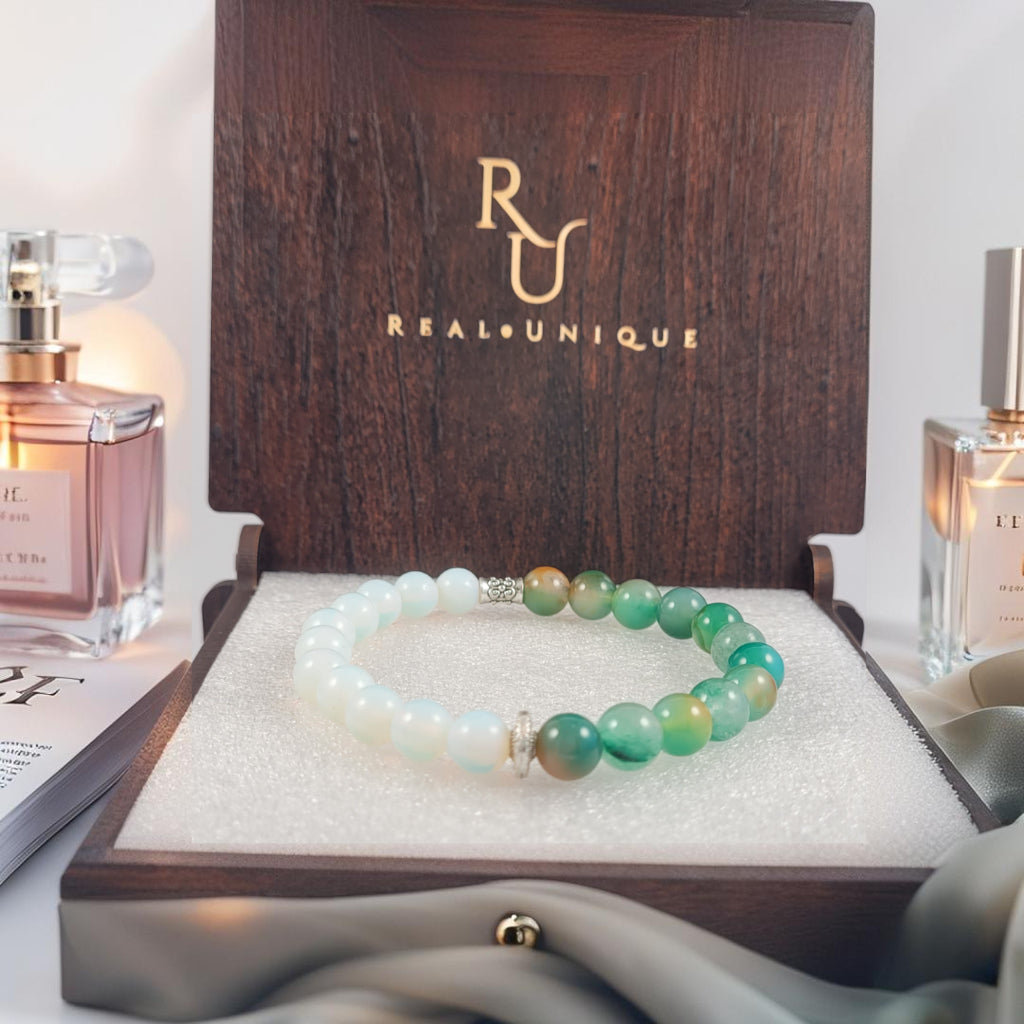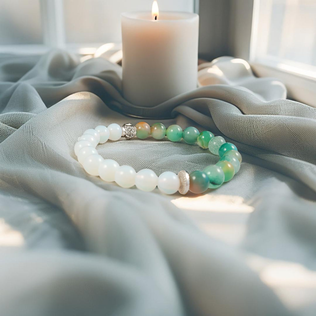 Deze verfijnde armband combineert frisse groene edelstenen met zachte witte 8mm kralen voor een harmonieuze en rustgevende uitstraling. De subtiele schakering van kleuren weerspiegelt balans en elegantie – ideaal voor wie houdt van natuurlijke schoonheid met een stijlvolle twist.