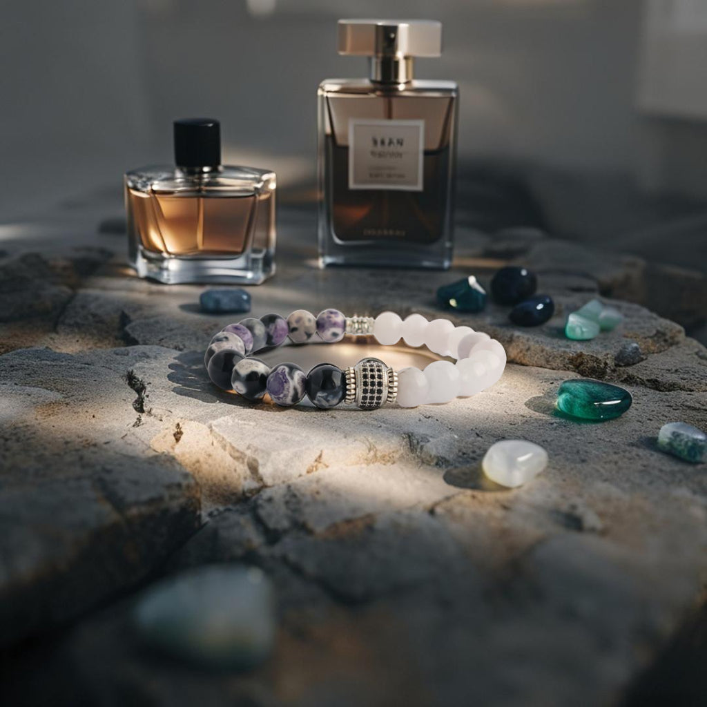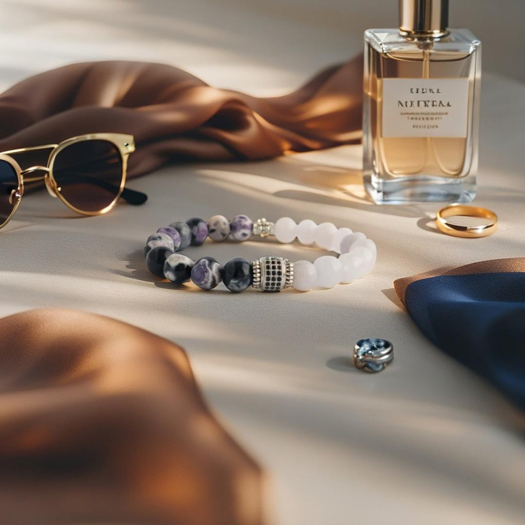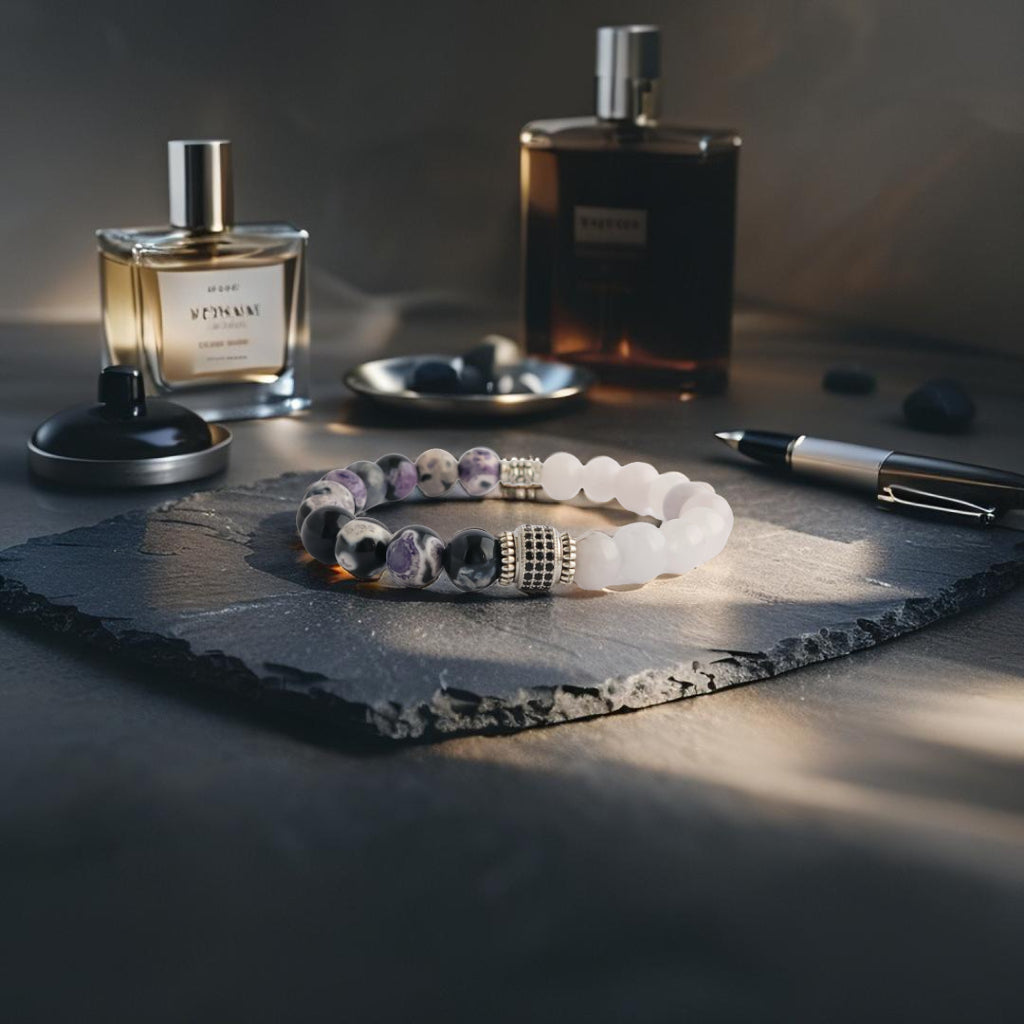 Deze verfijnde armband van 8mm combineert diepe paarse amethiststenen met subtiele witte accenten, voor een mysterieuze en elegante uitstraling. De harmonieuze kleuren en het unieke design maken deze armband perfect voor wie houdt van stijl met karakter en een vleugje mystiek.