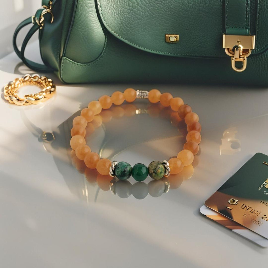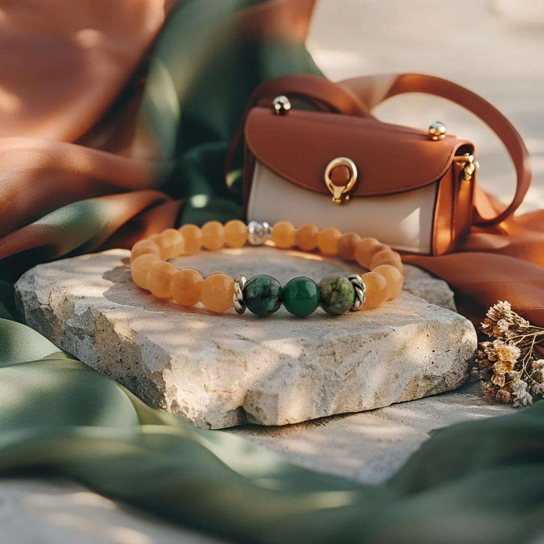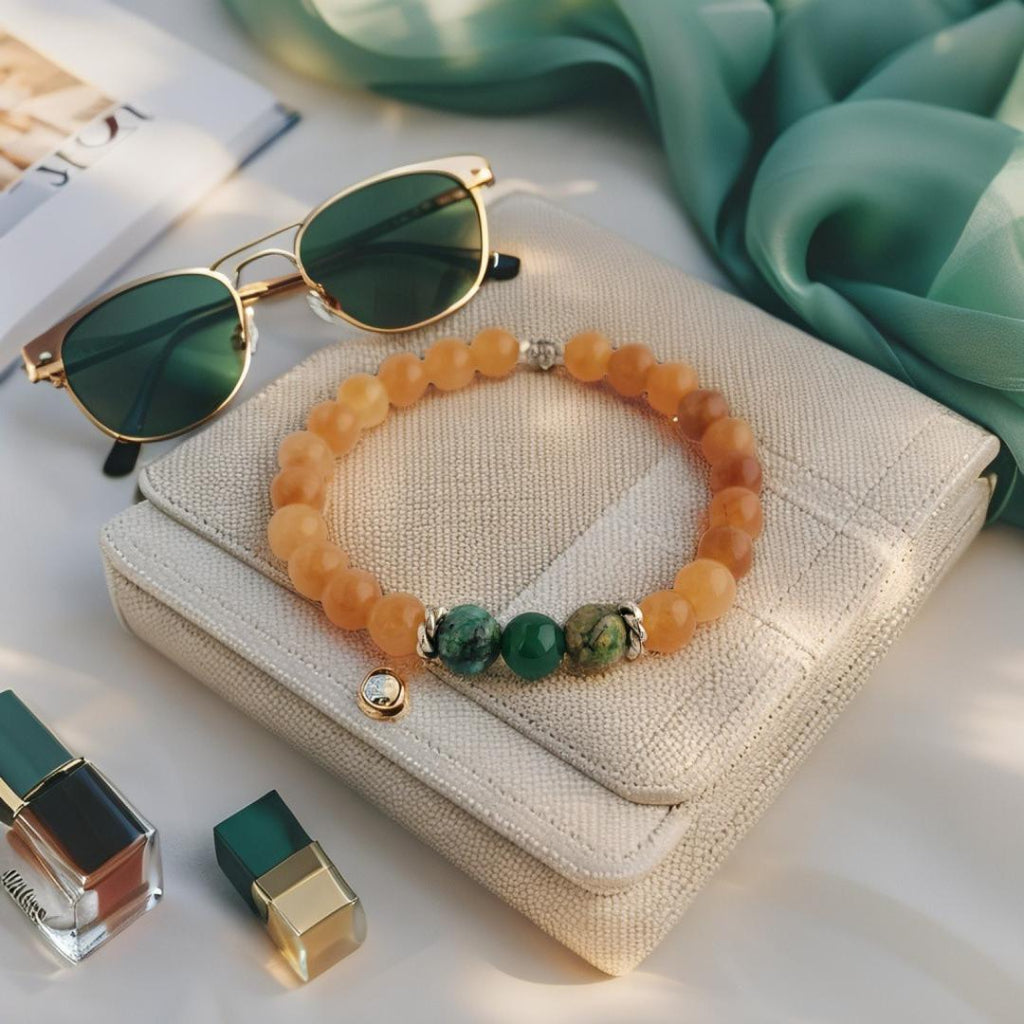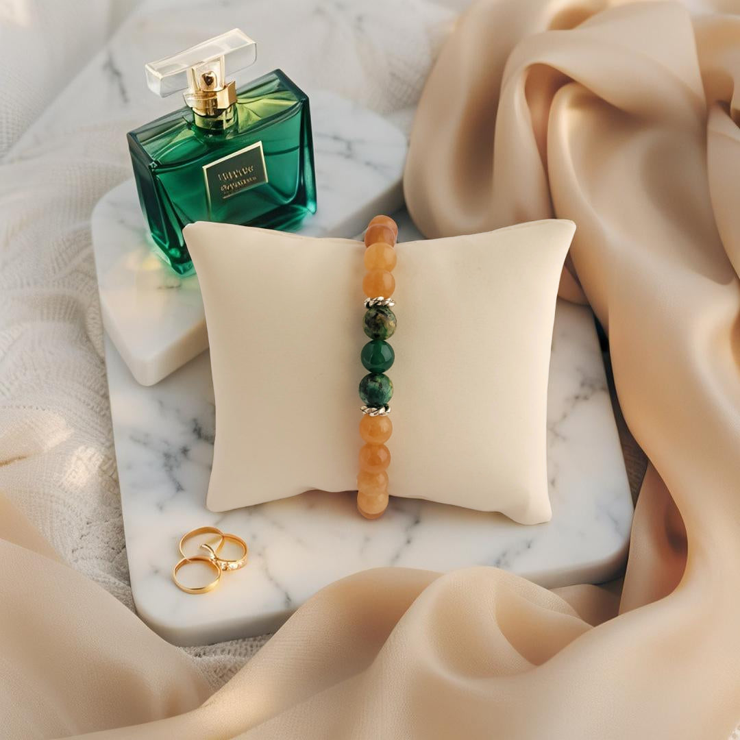 Deze stijlvolle armband combineert warme oranje aventurijnstenen (8mm) met diepgroene natuurstenen accenten voor een gebalanceerde, luxueuze uitstraling. De zachte glans van aventurijn staat symbool voor optimisme en vitaliteit, terwijl de groene tinten rust en balans brengen. Een tijdloos accessoire dat elegantie en natuurlijke energie verenigt – perfect voor elke gelegenheid.🎁✨