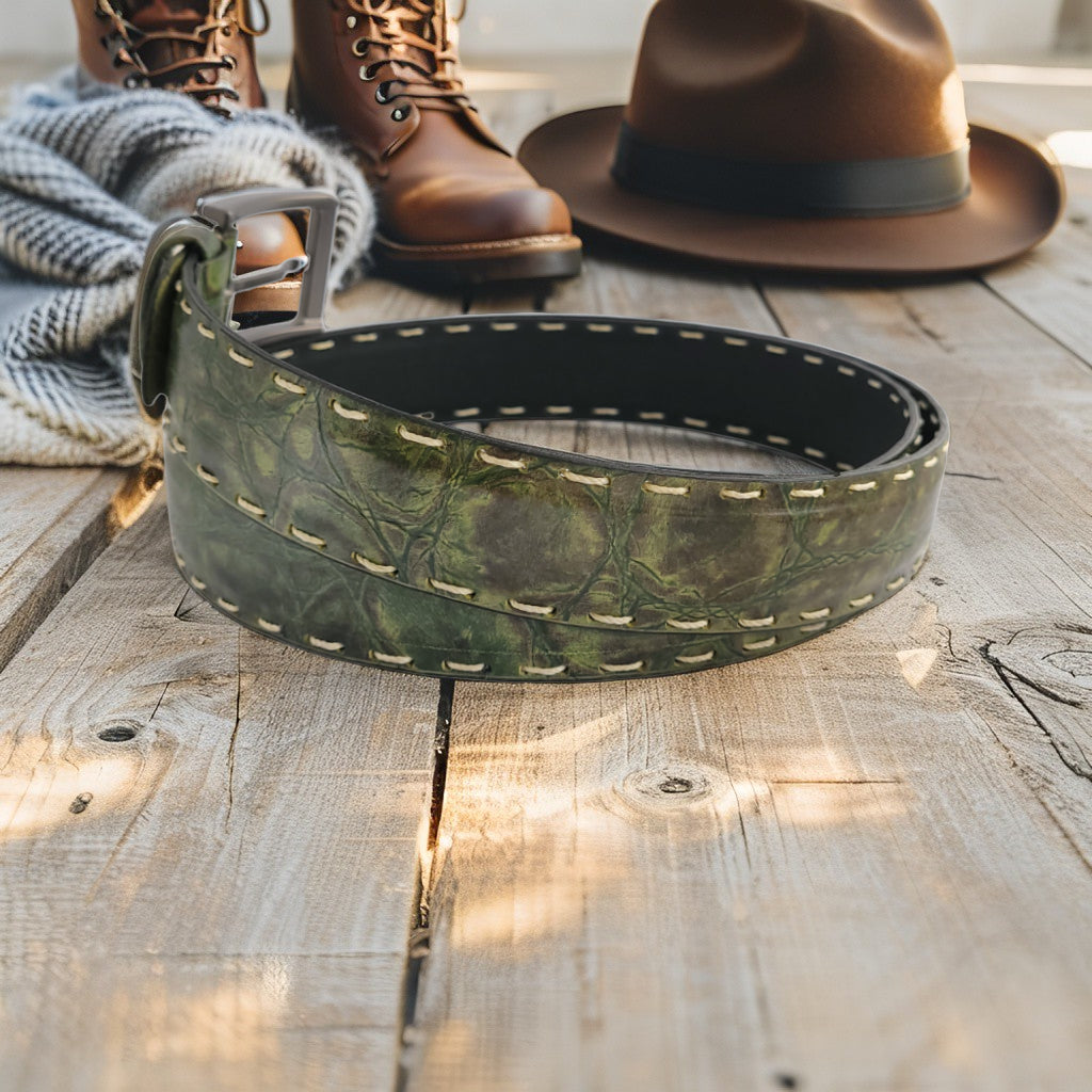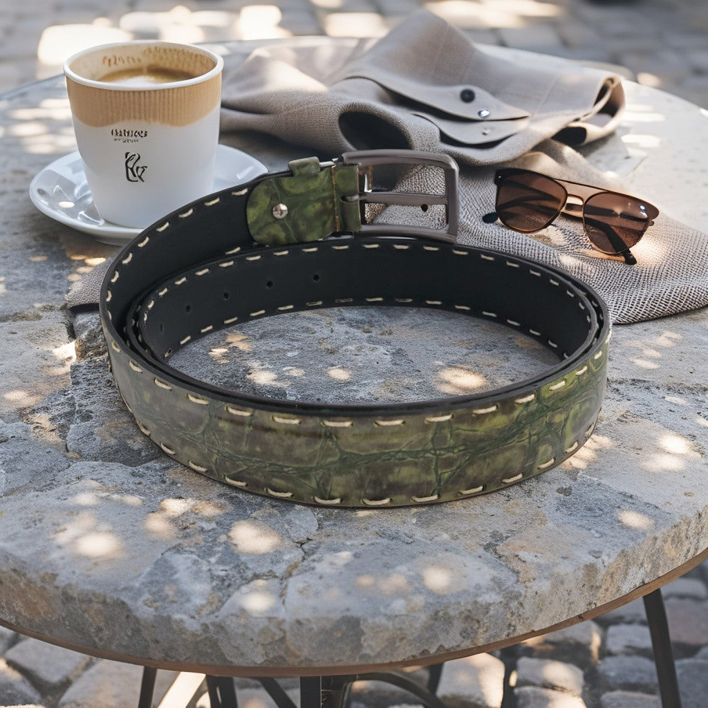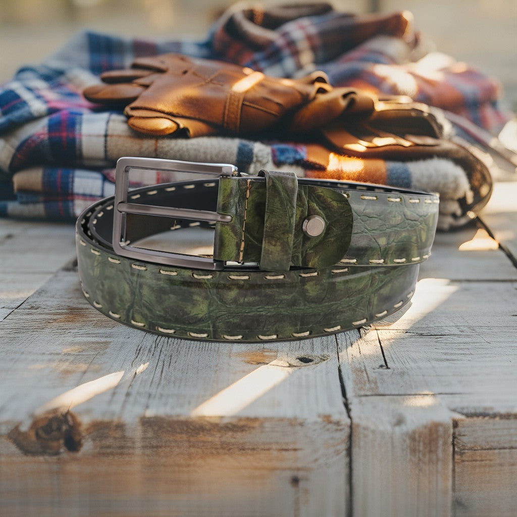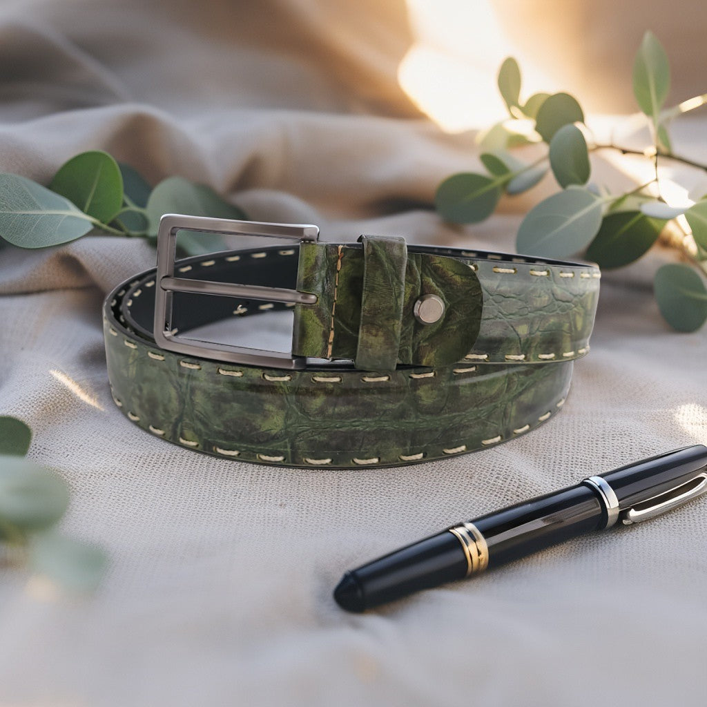 Deze bijzondere riem in diep donkergroen leer met krokodillenstructuur en contrasterende witte stiksels is een elegante blikvanger voor zowel mannen als vrouwen. De unieke kleur en het stoere design geven elke outfit karakter, terwijl de geborstelde metalen gesp zorgt voor een moderne, verfijnde afwerking.