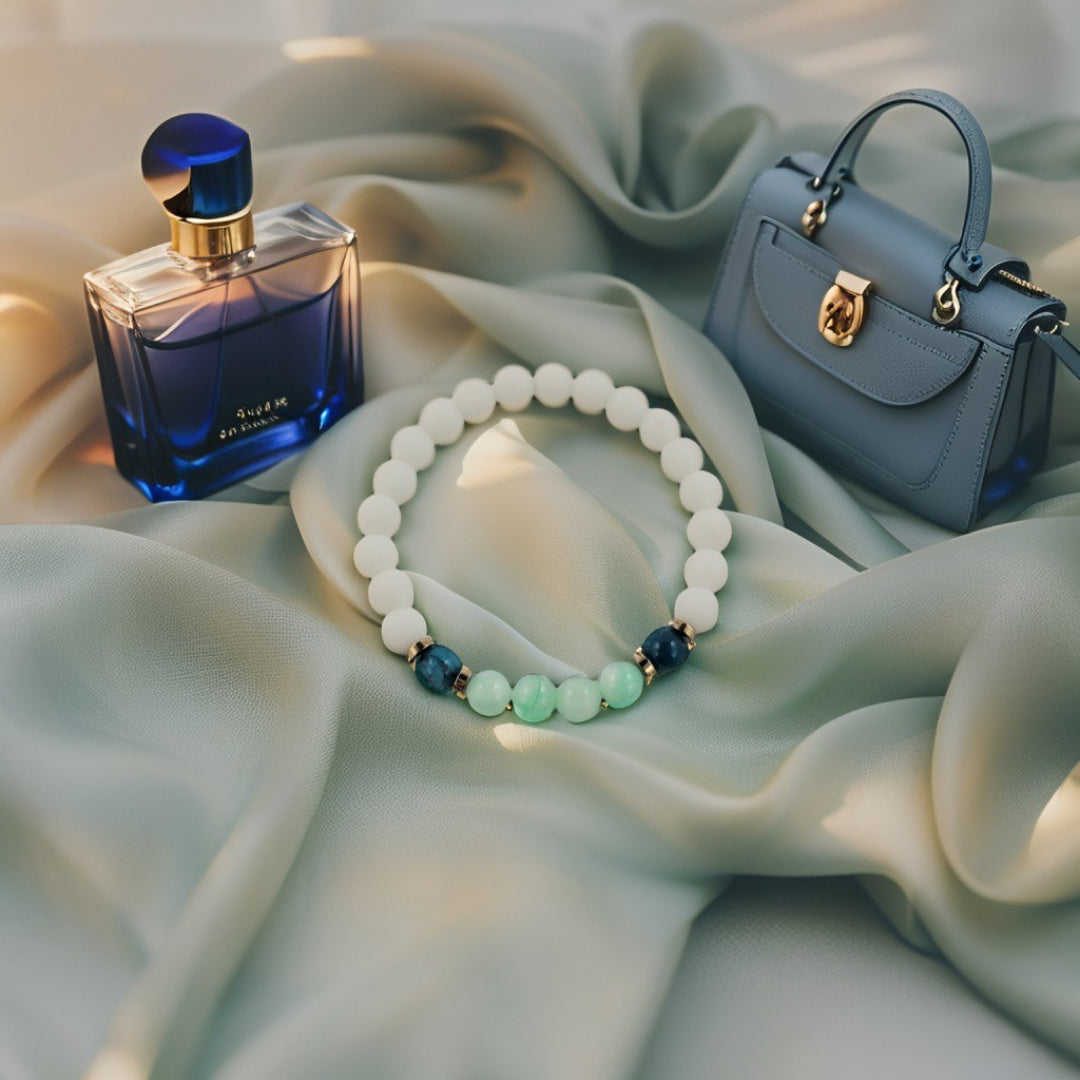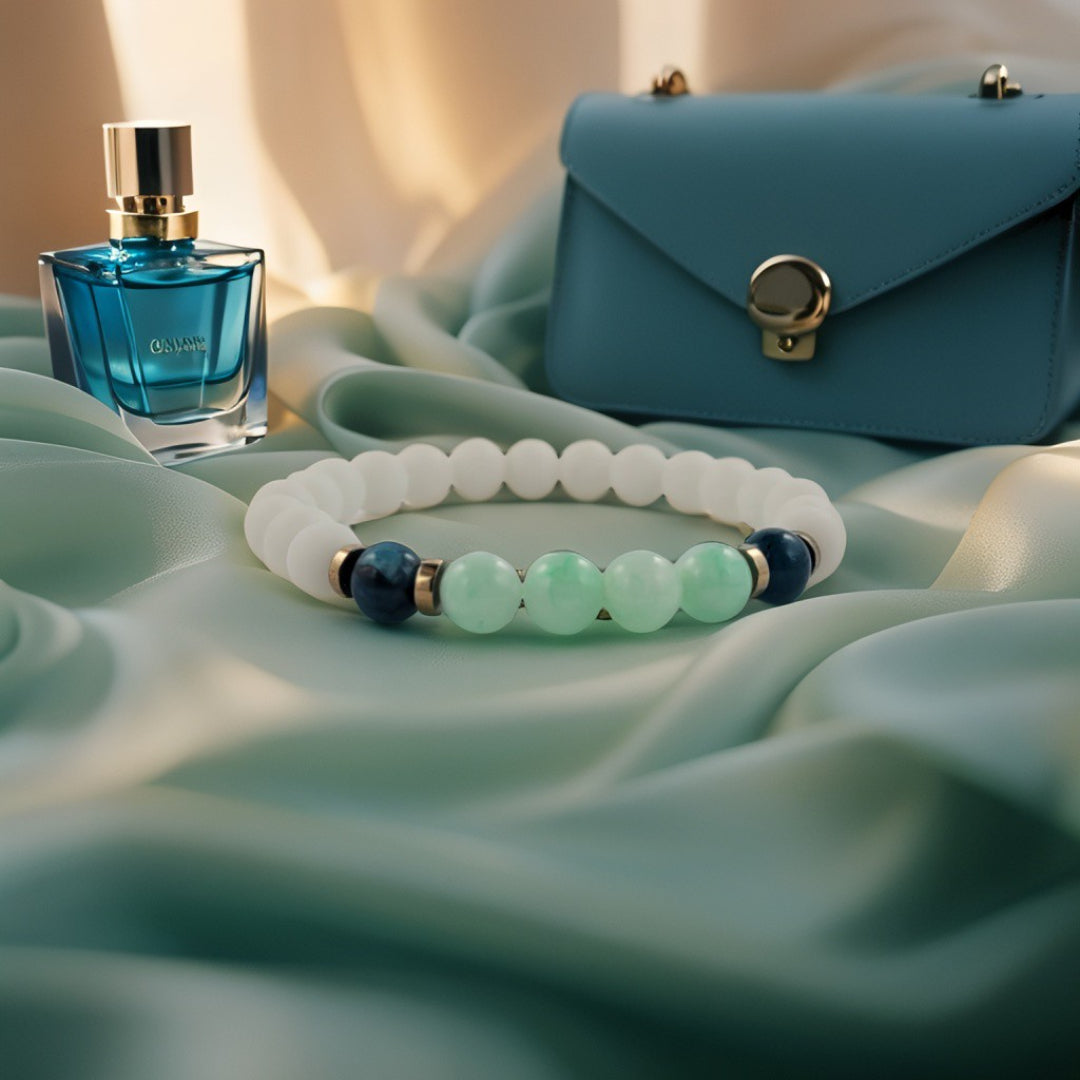 De Verde Serenità armband ademt rust en natuurlijke elegantie. Het hart van de armband bestaat uit glanzende groene jade, omlijst door diepe blauwe sodaliet en matte witte jade. Deze verfijnde combinatie van kleuren en texturen creëert een harmonieus contrast dat zowel kalmte als kracht uitstraalt. Perfect voor wie zijn look een frisse en moderne touch wil geven.
