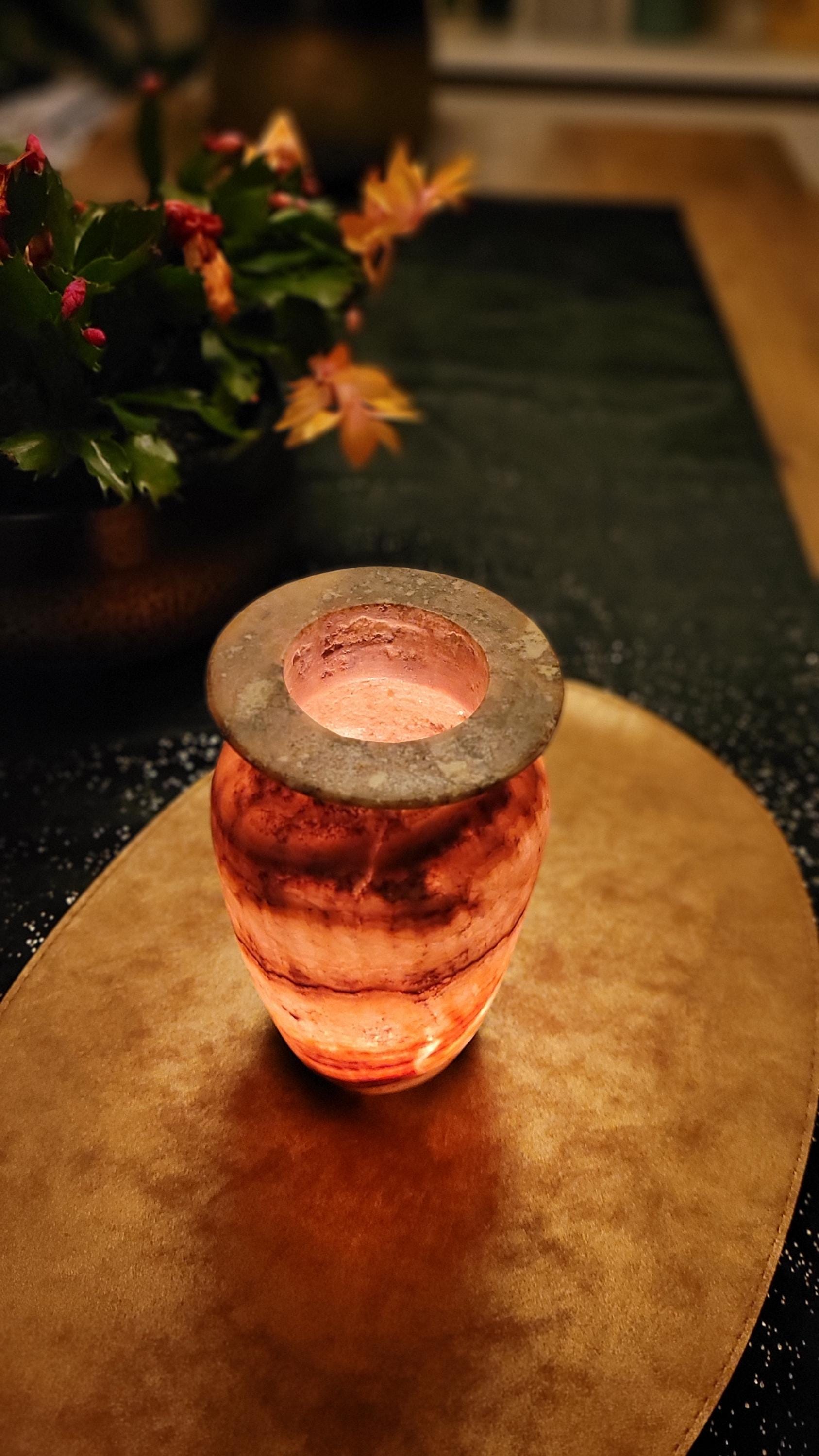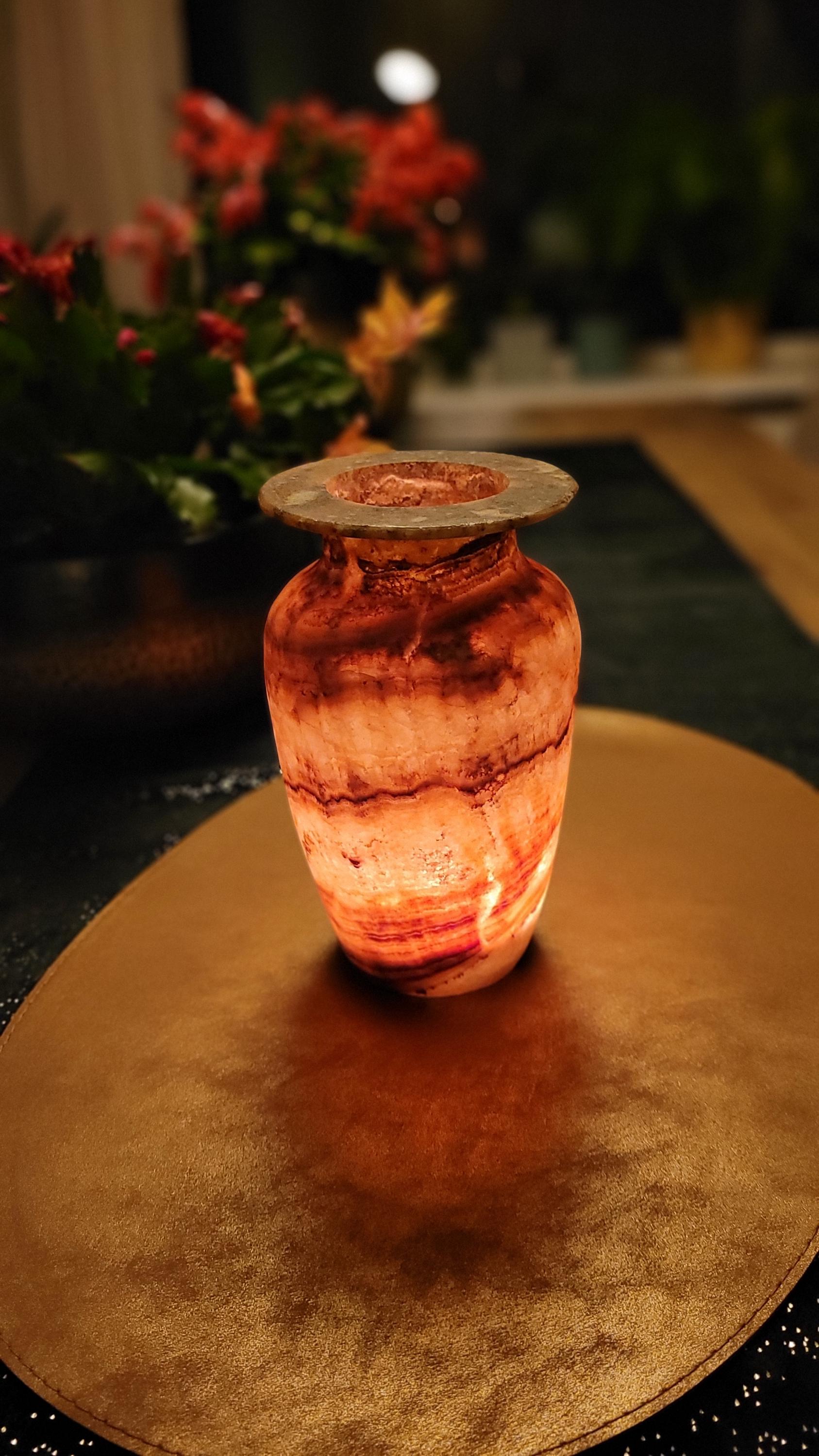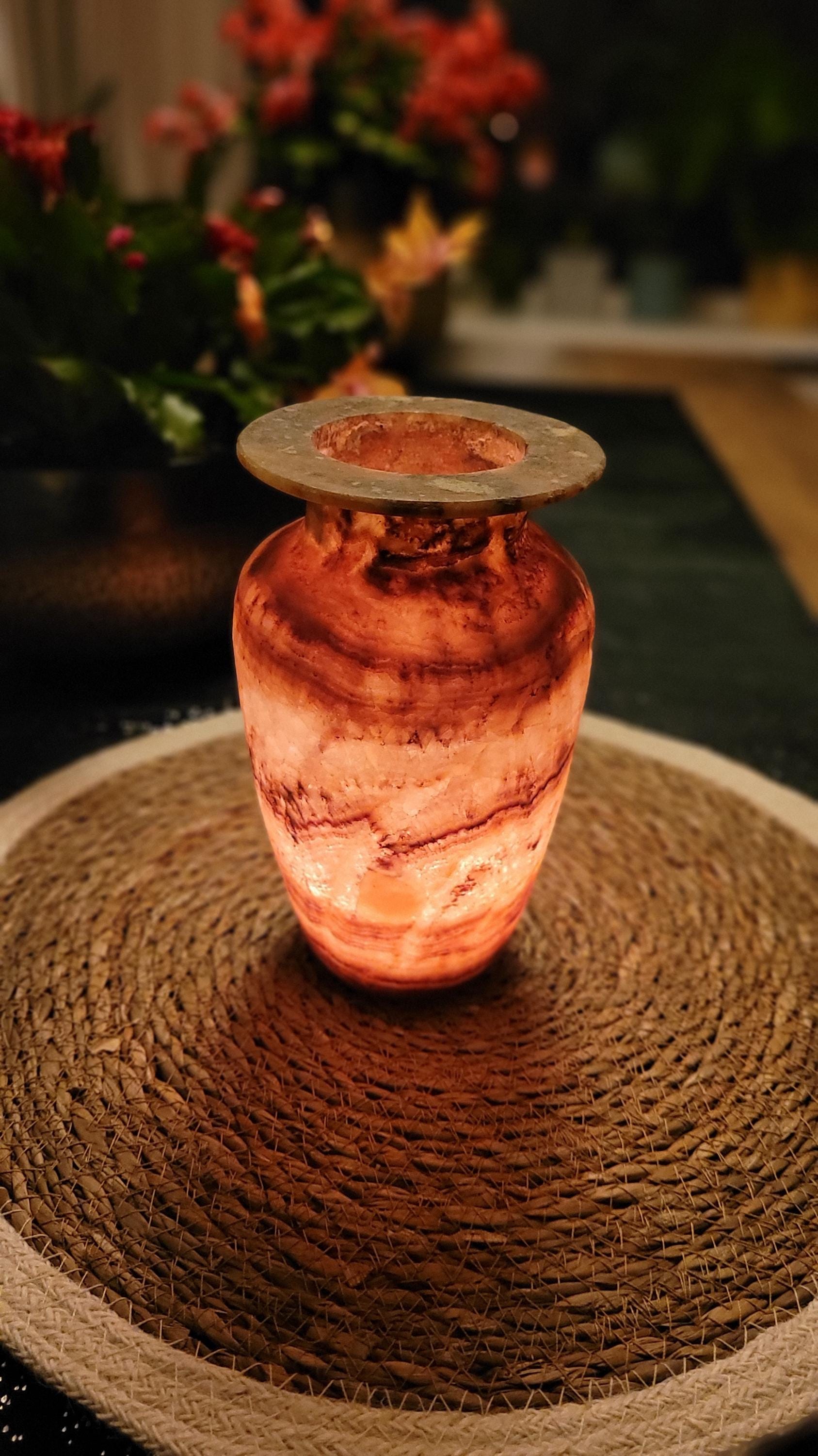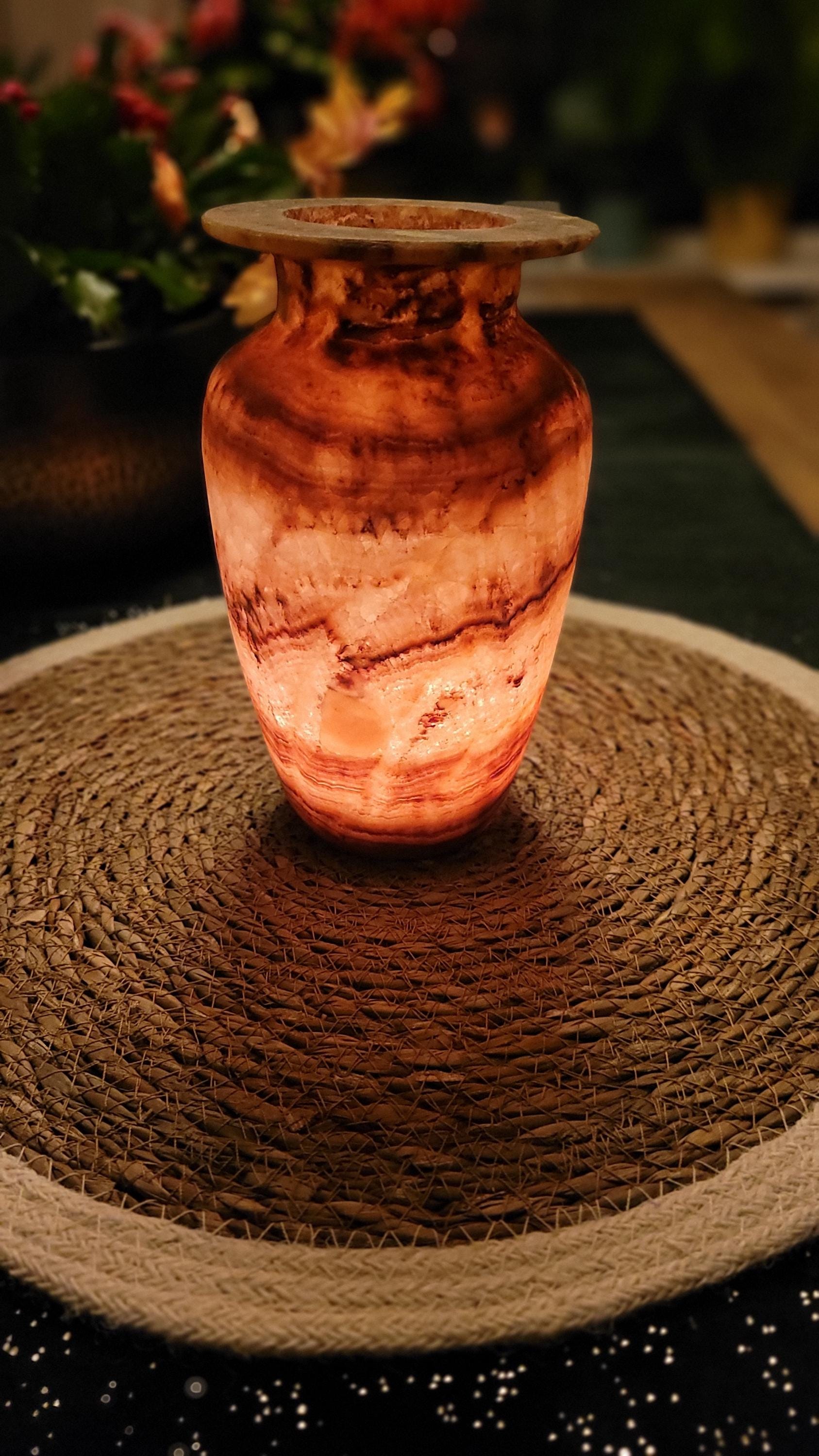 Deze prachtige 17.5cm grote alabaster vaas straalt een warme, zachte gloed uit en is een perfect voorbeeld van vakmanschap. Met zijn unieke natuurlijke patronen en verfijnde details voegt deze verlichte vaas een vleugje luxe en sfeer toe aan elke ruimte. Ideaal als sfeerverlichting of als elegant decorstuk dat de aandacht trekt. Dit prachtige decorstuk wordt geleverd in een unieke geschenkverpakking, perfect om cadeau te geven! 🎁