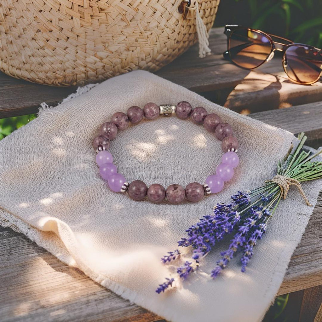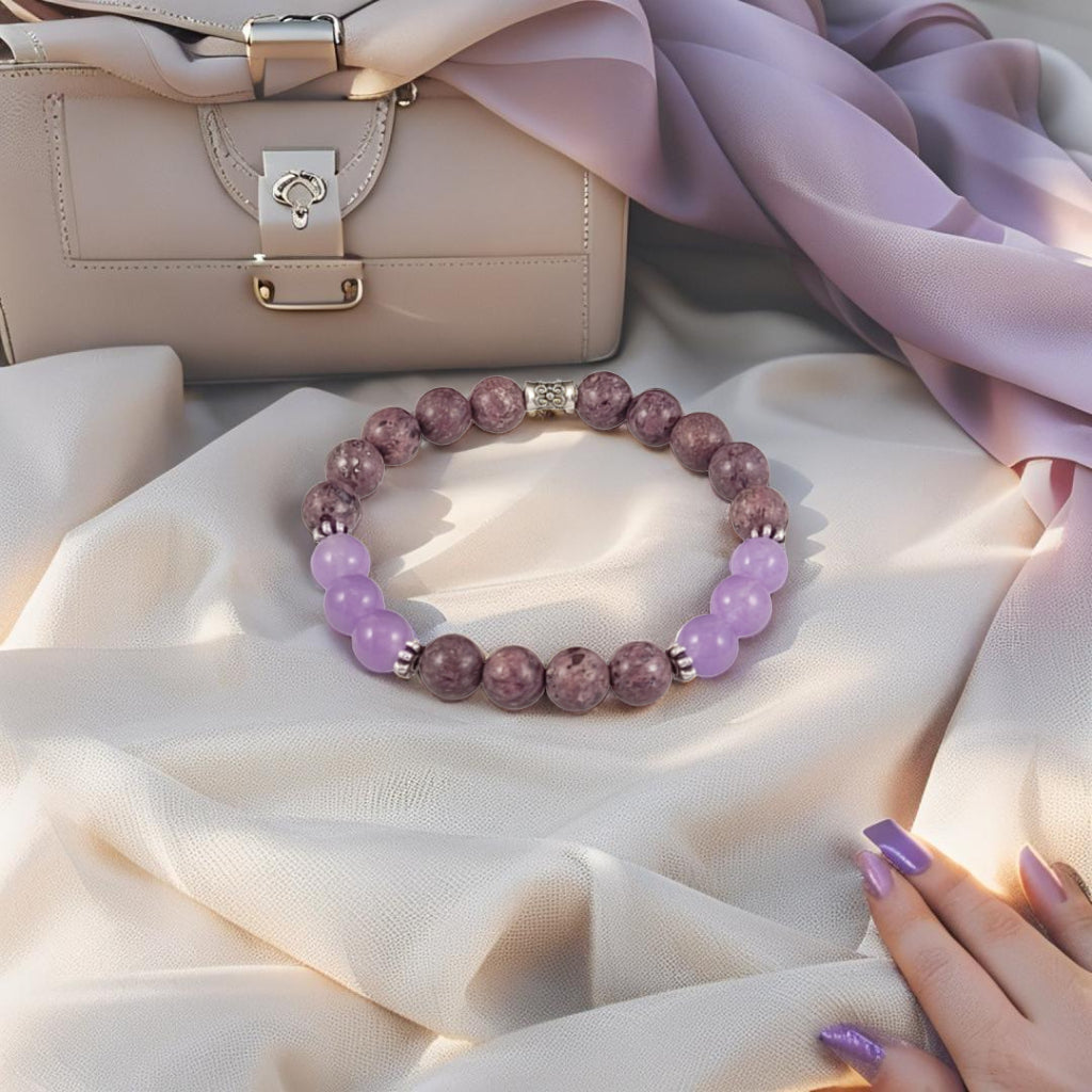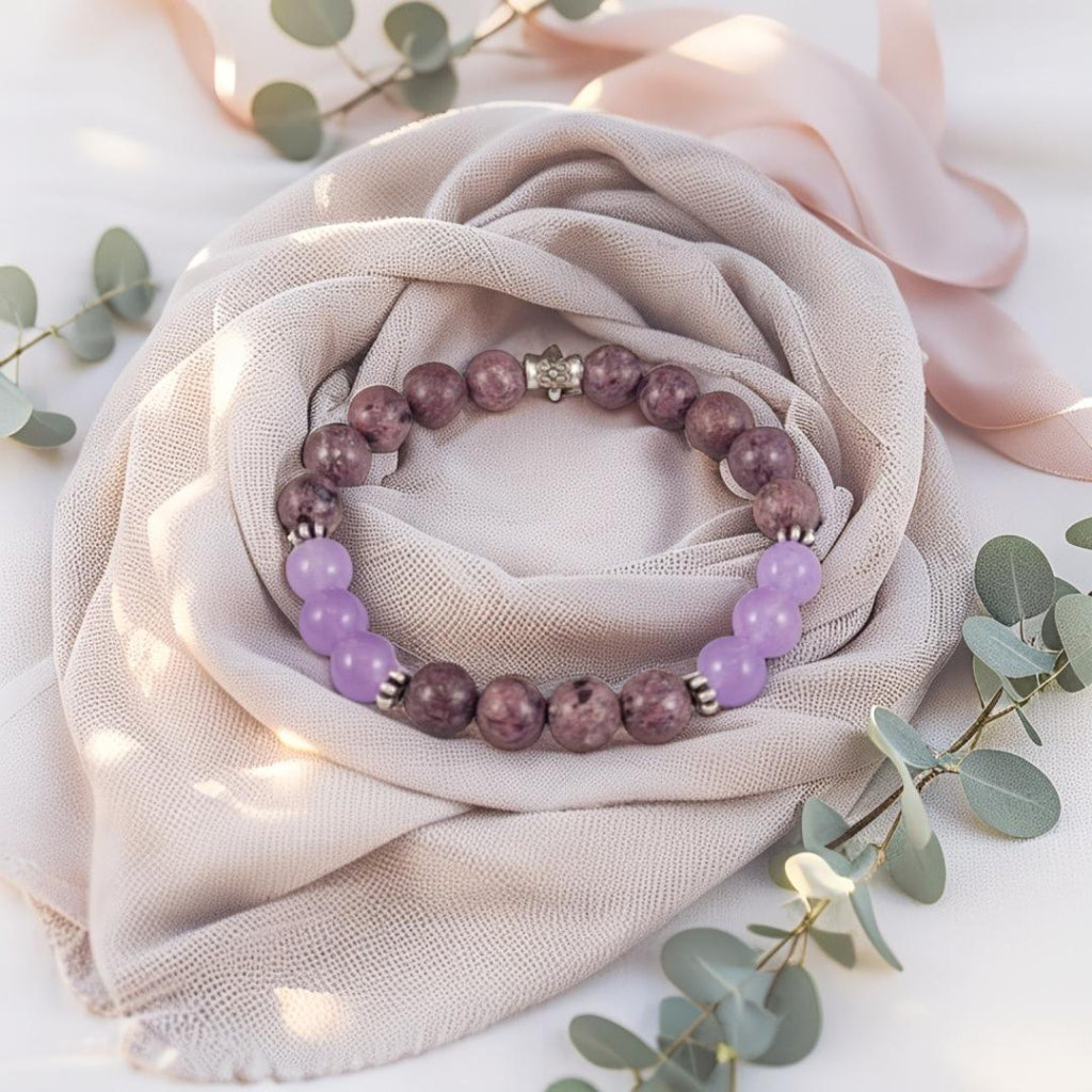 De Viola Notturna armband combineert 8mm paarse Lepidoliet stenen met glanzende Amethist kralen, voor een harmonieuze balans tussen rust en elegantie. De matte textuur van lepidoliet contrasteert prachtig met de dieppaarse glans van amethist, wat deze armband een verfijnde en spirituele uitstraling geeft.