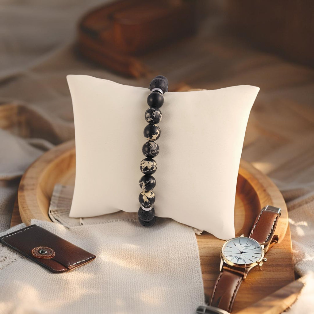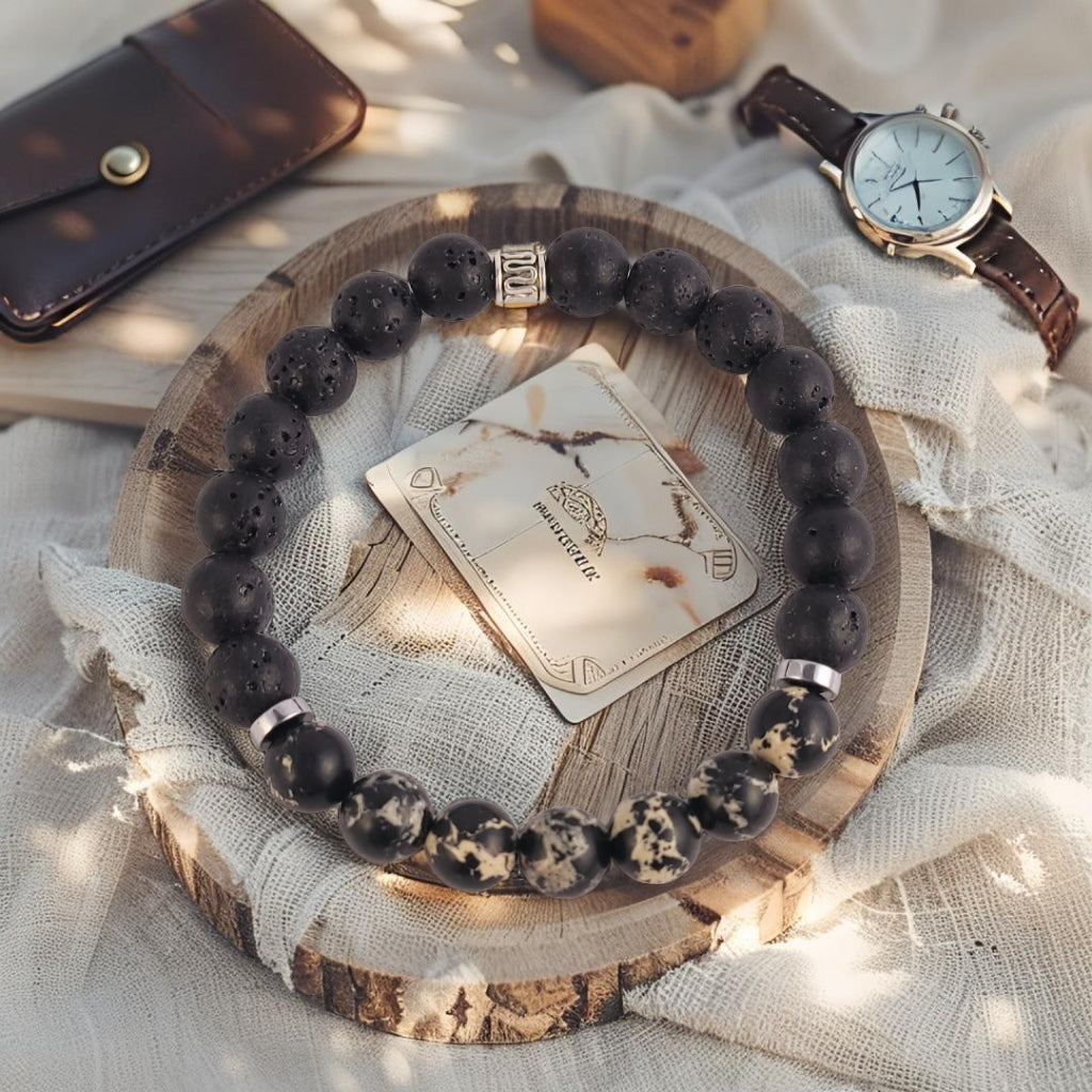 De 'Volcano Night' armband combineert diepe zwarte lavastenen met unieke zwart-beige edelstenen van 8mm.
